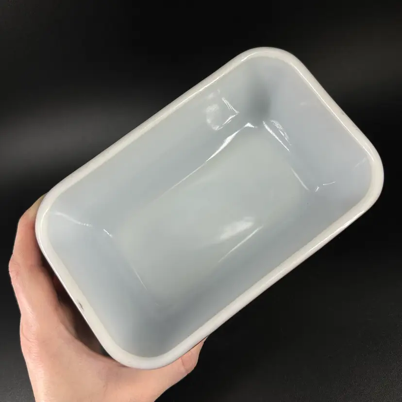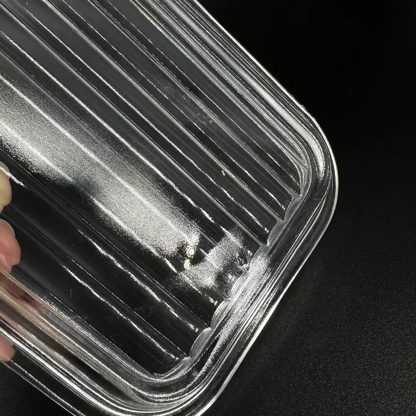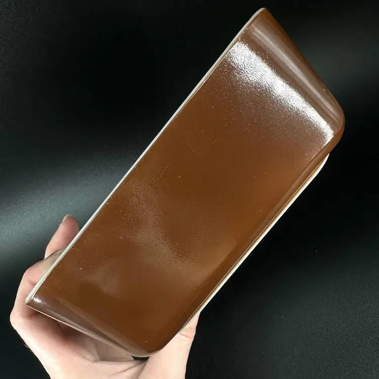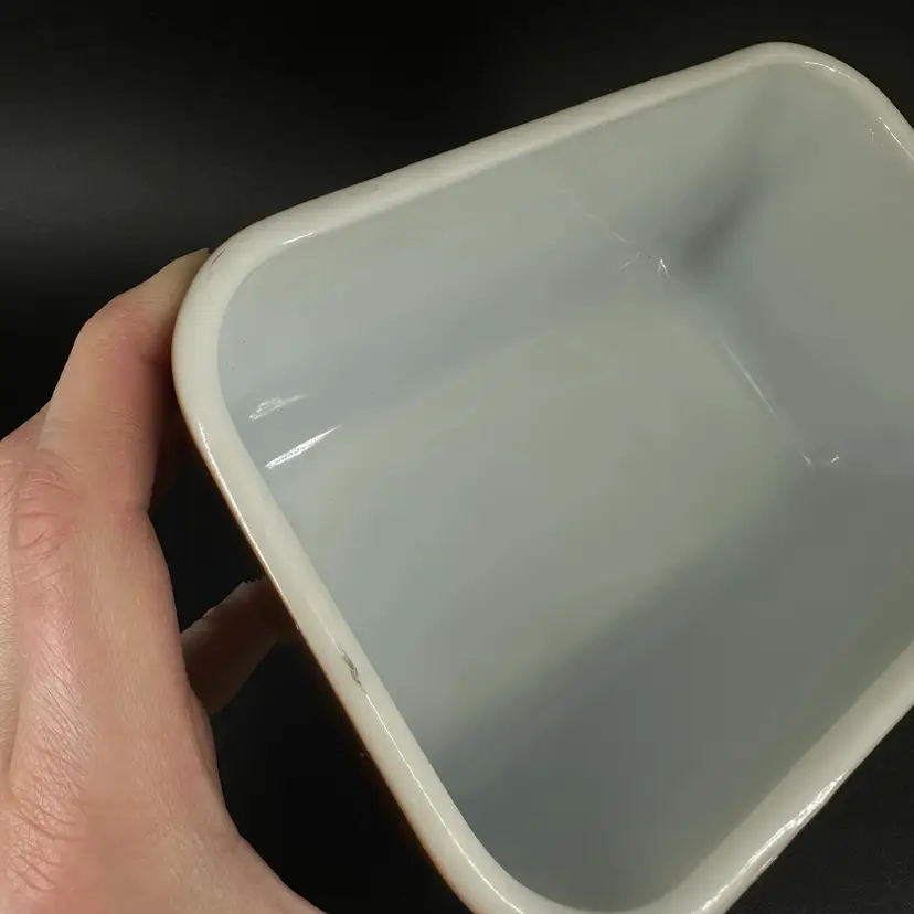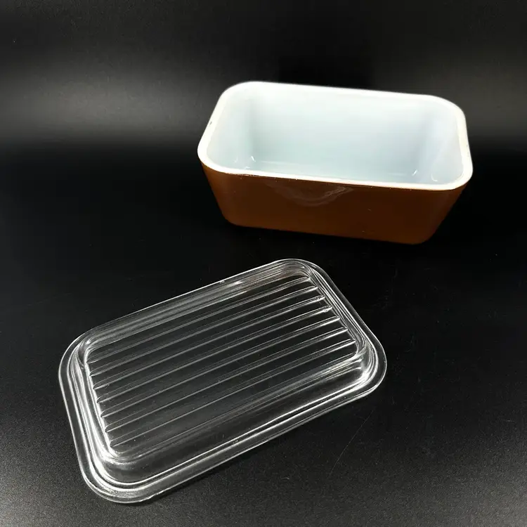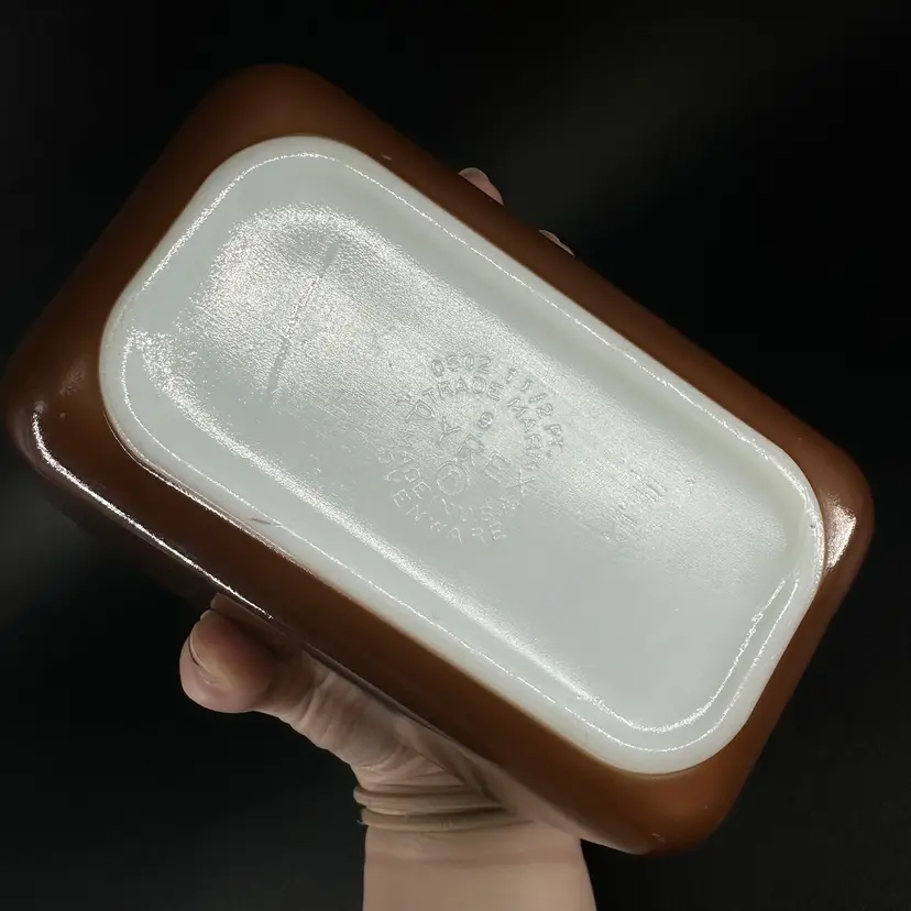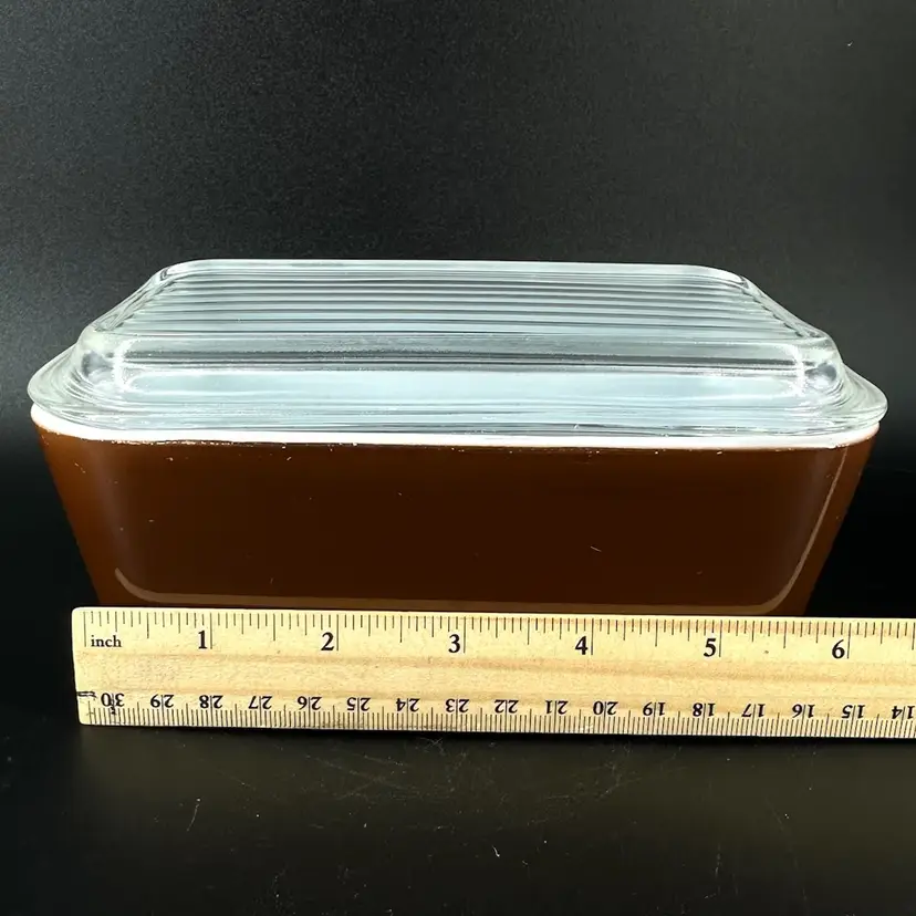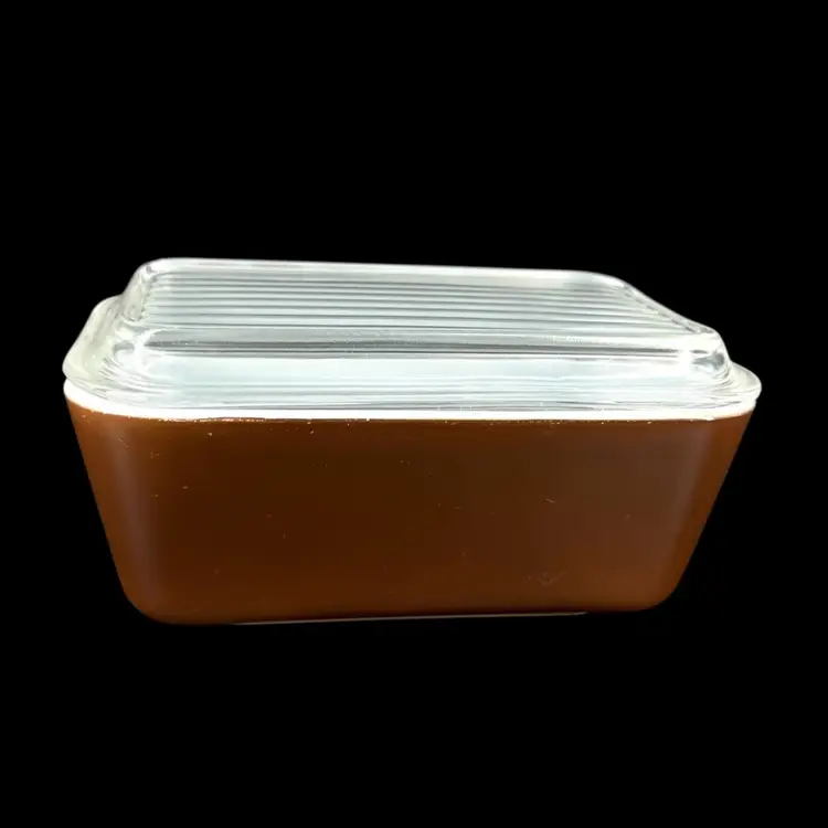 This vintage Pyrex fridgie dish features model 0502 1 1/2 PT in the color brown with removable clear glass ridged lid. No chips or cracks, some makings present on rim of dish, as pictured. “PYREX” trademark in bottom. Oven safe. Refrigerator dish and lid measure approximately 6.5” long 4” wide and 3” tall.