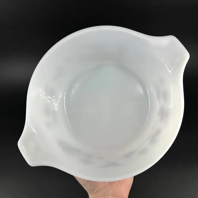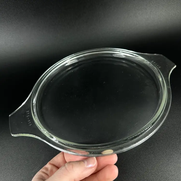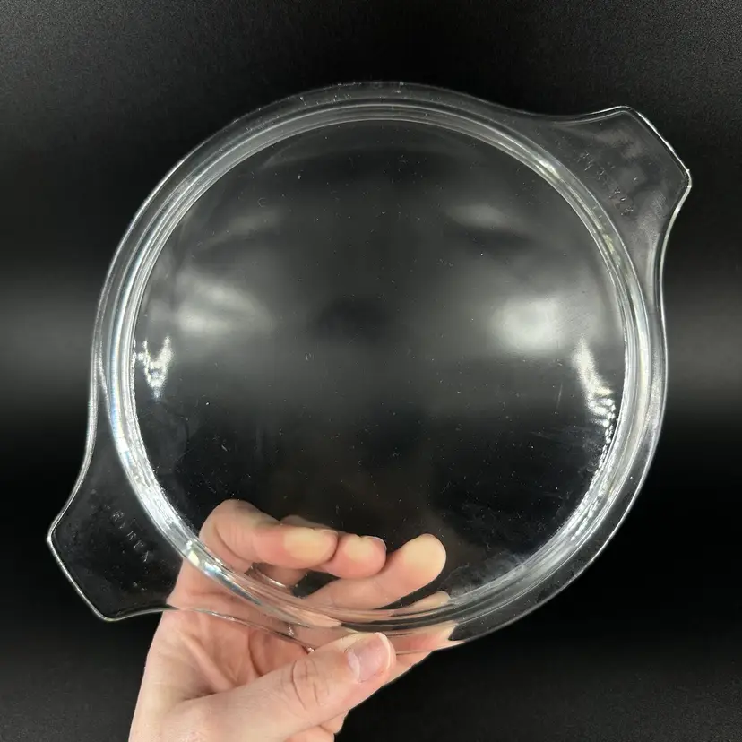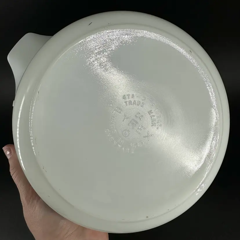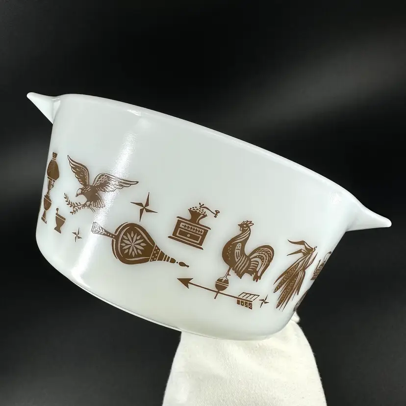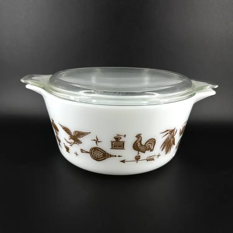 This casserole dish is made by Pyrex and features their "Early Americana" pattern. Dish is of model 474 - 8 1 and lid 474- C 12. “Pyrex Made In U.S.A" marking on bottom, as shown. No chips or cracks on either dish or lid. However, there are scratches from usage on the lid, as shown in the pictures. Americana design is in good shape. Dish and lid measure approximately 4" tall and 7" wide pot, not including handles.