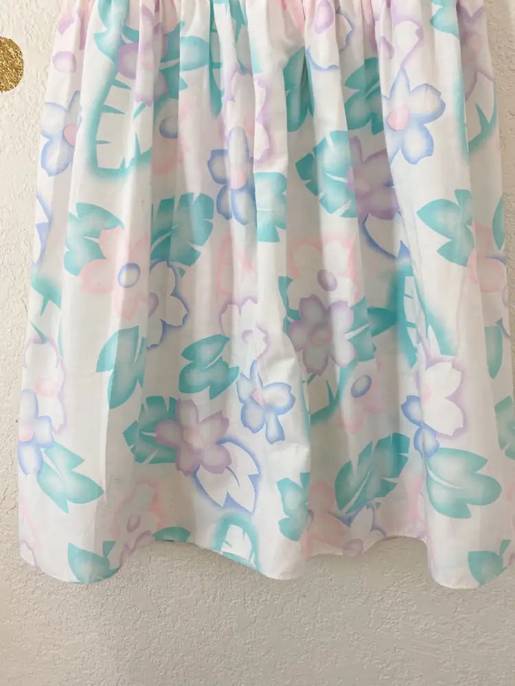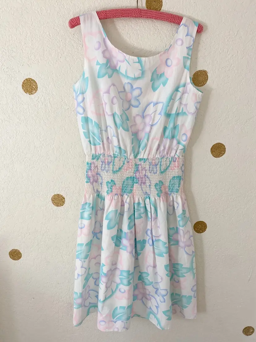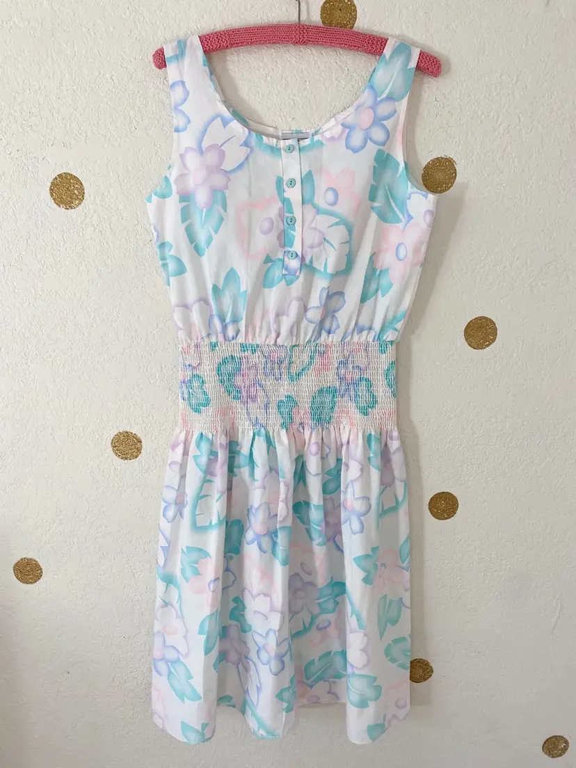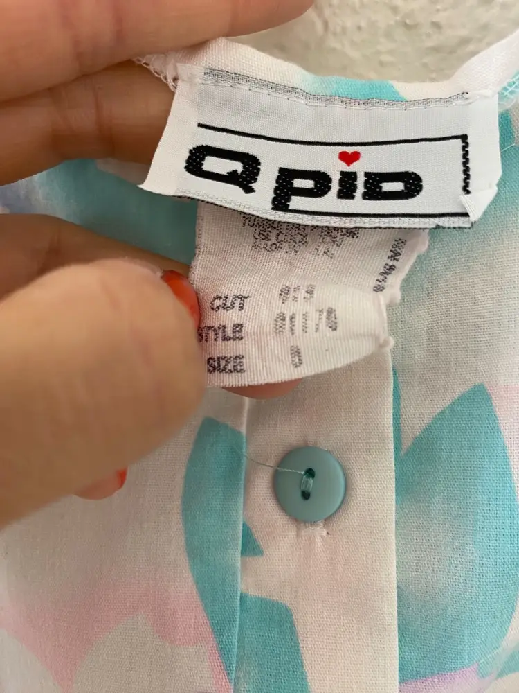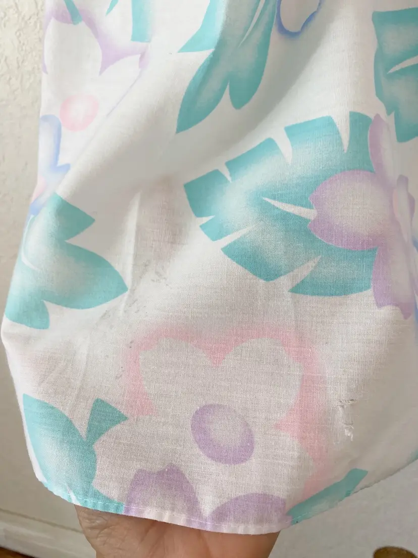 . I can't tell if it's size 5 or 8, either way, fits like a modern Small. 44.5" sth, 19" ptp Waist: 15" + stretch Small mark and tiny rip, not noticeable.