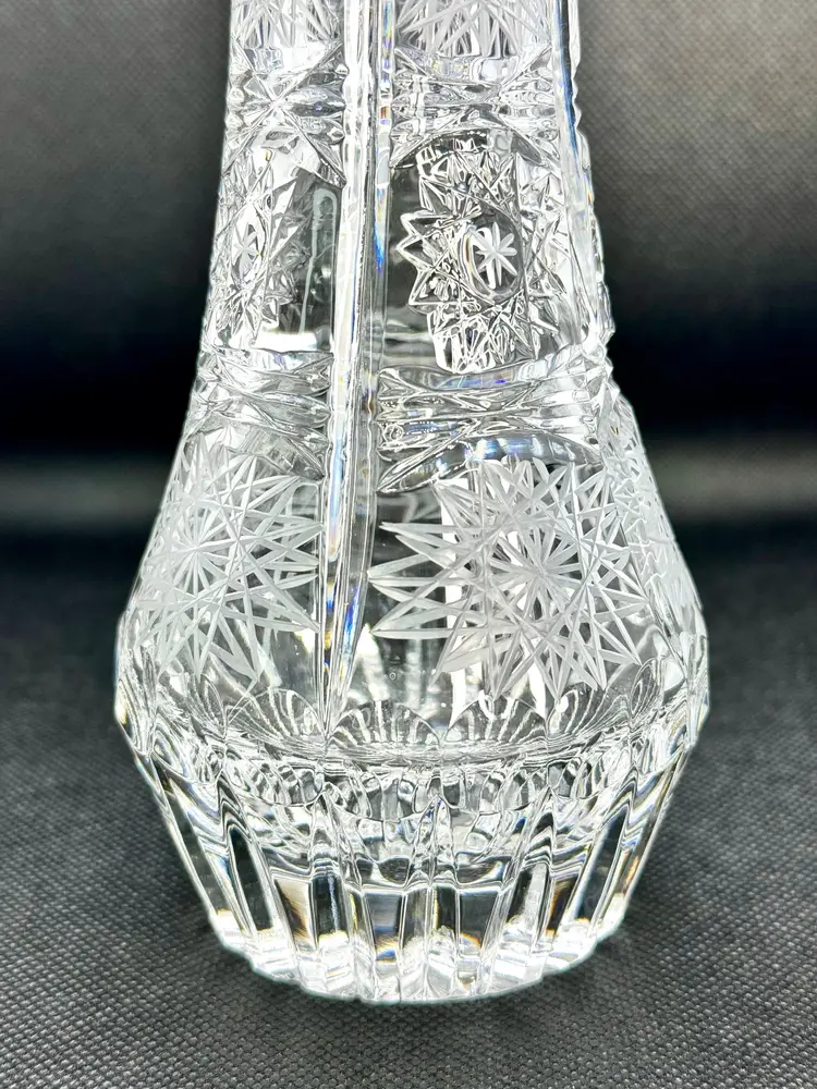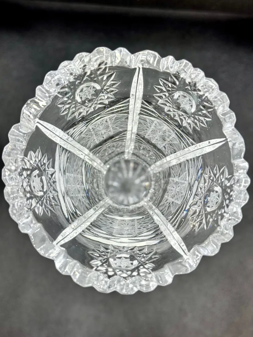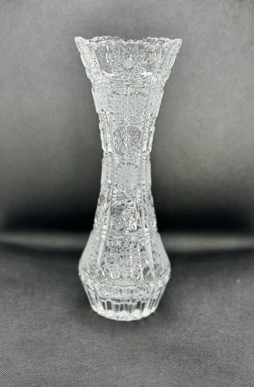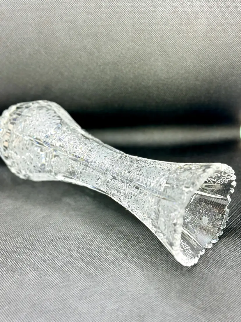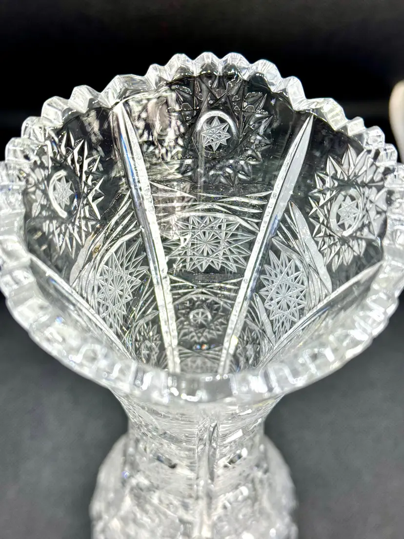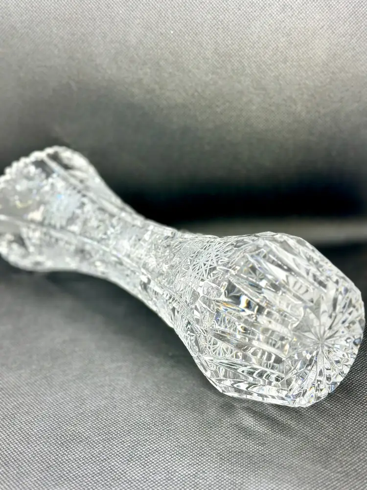 Vintage Queen Anne Lace vase, hand cut lead crystal, by Queen Anne Lace, made in Bohemia. Very beautiful and brilliant clarity, perfect for any occasion. No chips or cracks. Measures 3.5x9.5x2.5, opening 3”. Weighs 2lb.