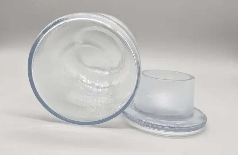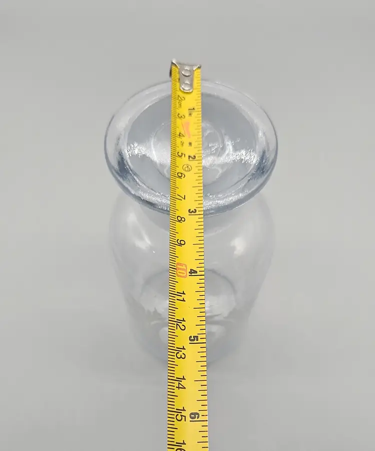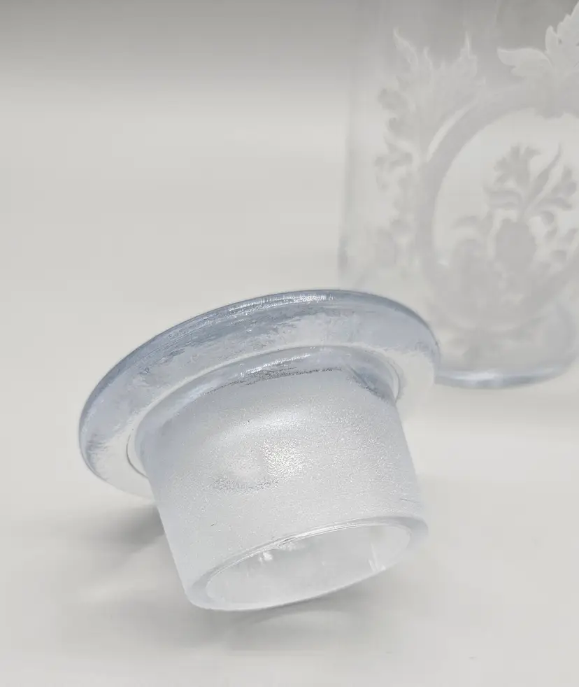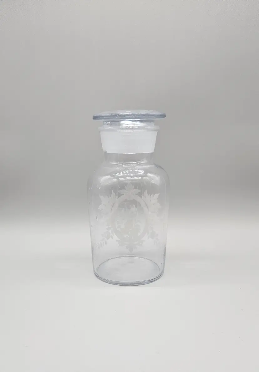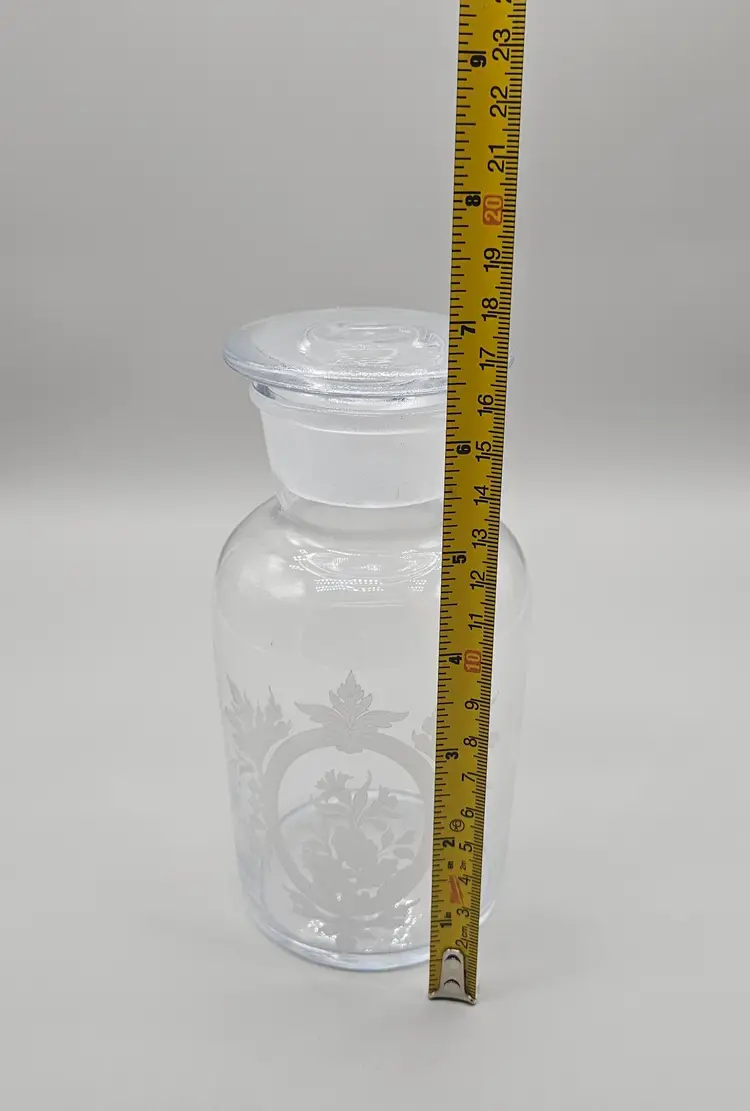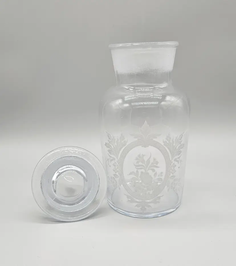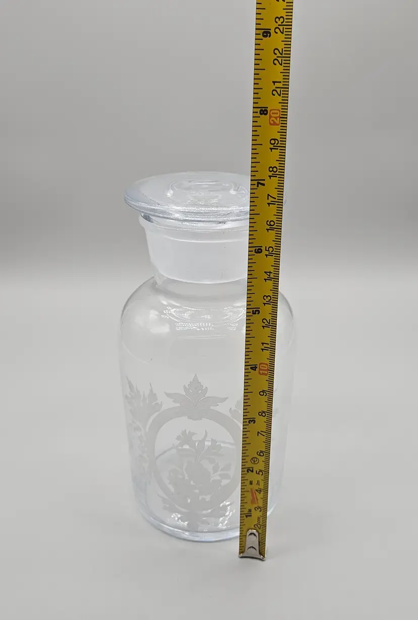 This vintage Apothecary Jar has an etched French Couture/Shabby Chic Design on the front. It is approximately 6" tall and 3" in diameter. There is no makers mark. It is in Good, Pre-owned condition, showing minimal wear from previous use. There are no breaks, no cracks, no chips.