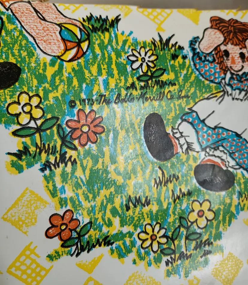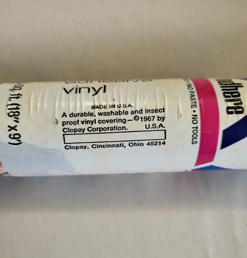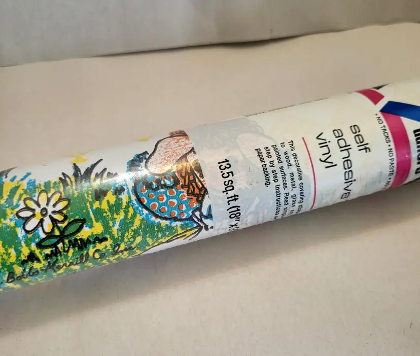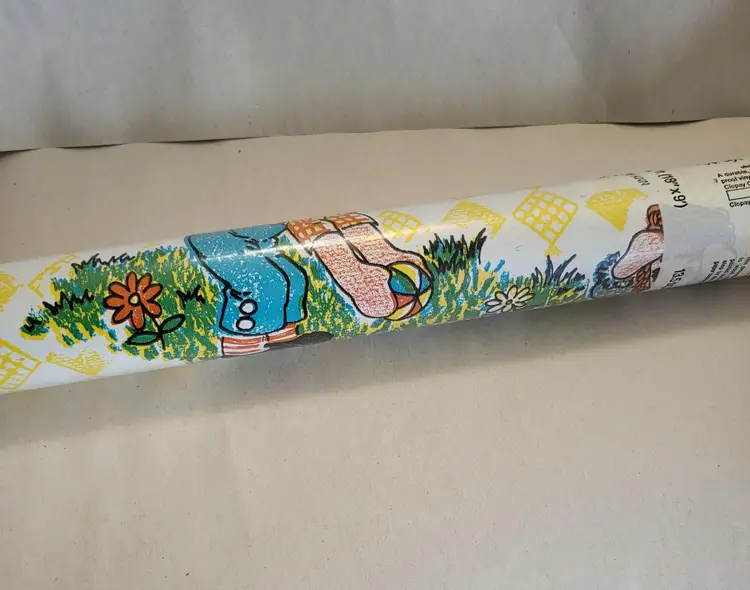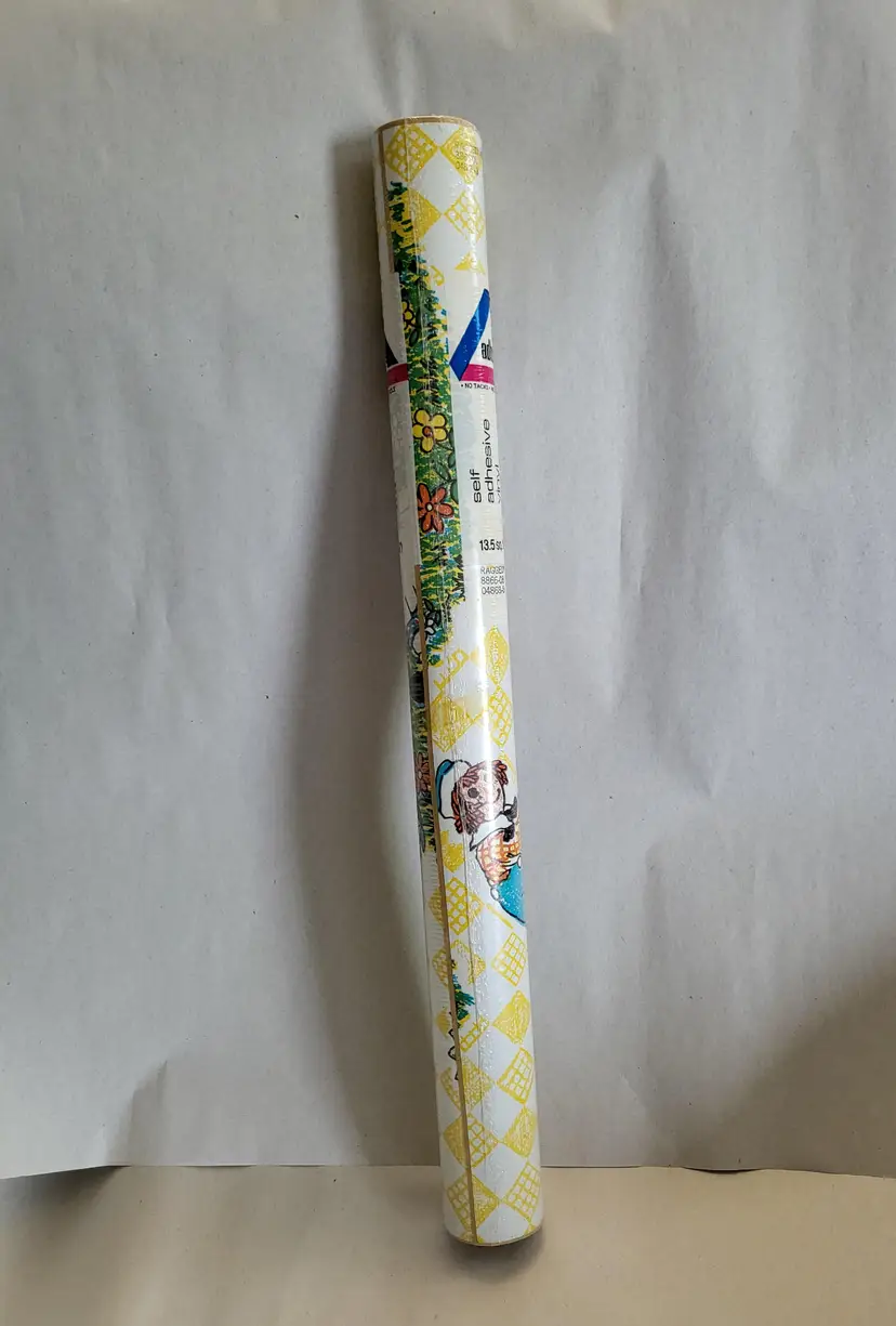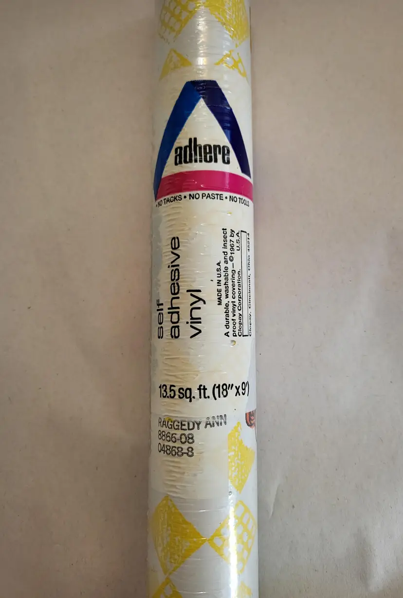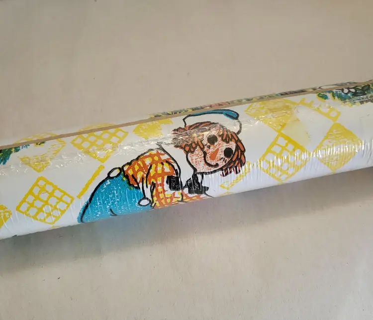This listing is for one roll of sealed, unopened Raggedy Ann & Andy self adhesive vinyl wallpaper. The roll is 18" wide and has 9' in it. I believe the wallpaper is from the 1970's or 80's.