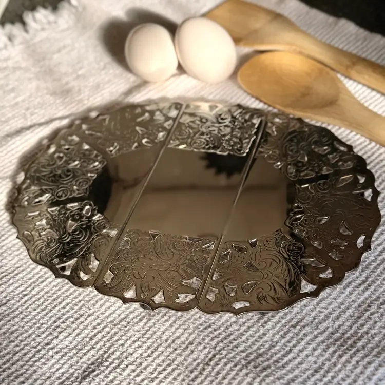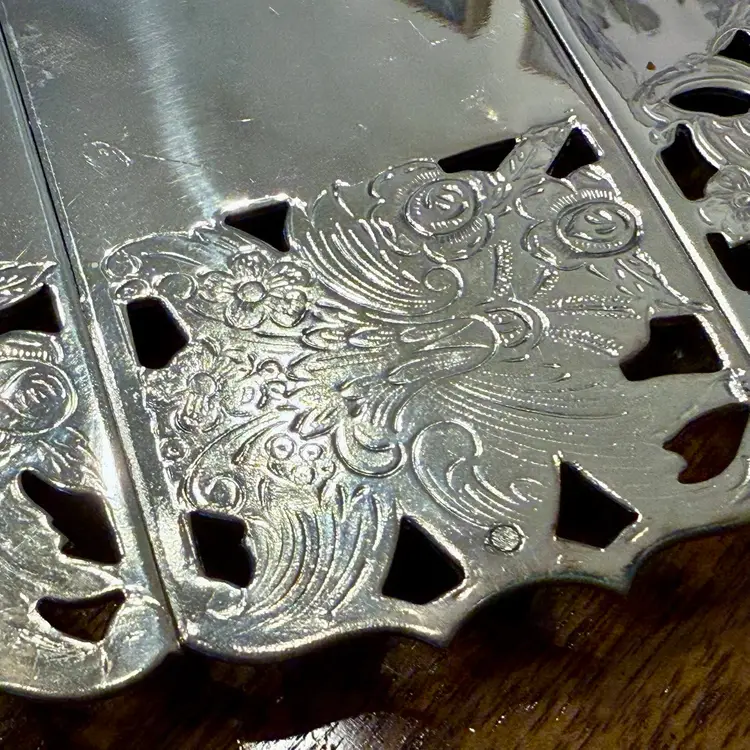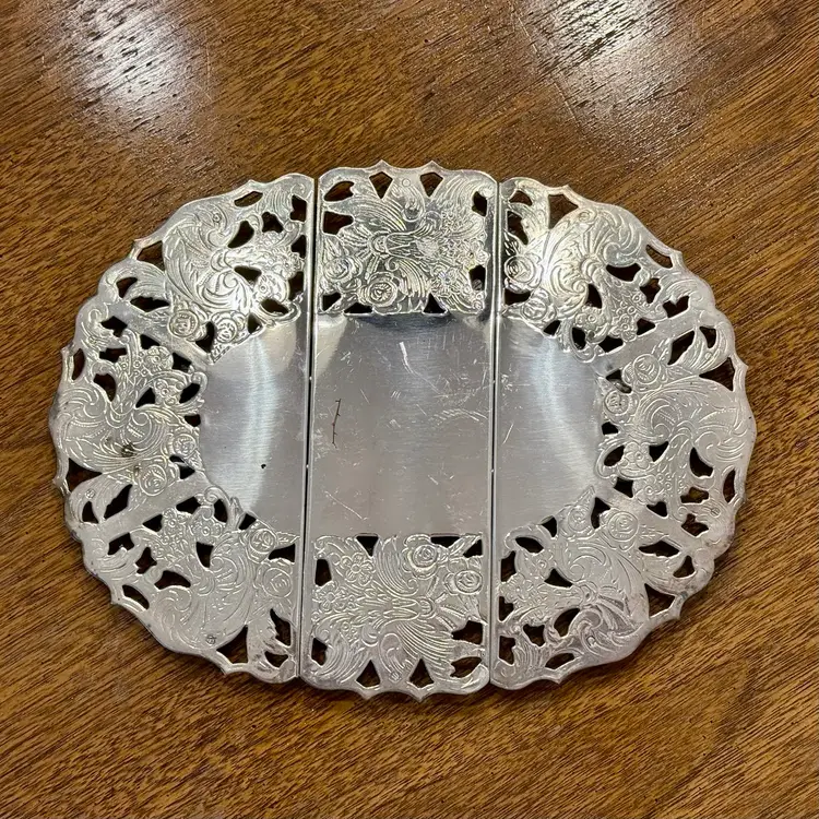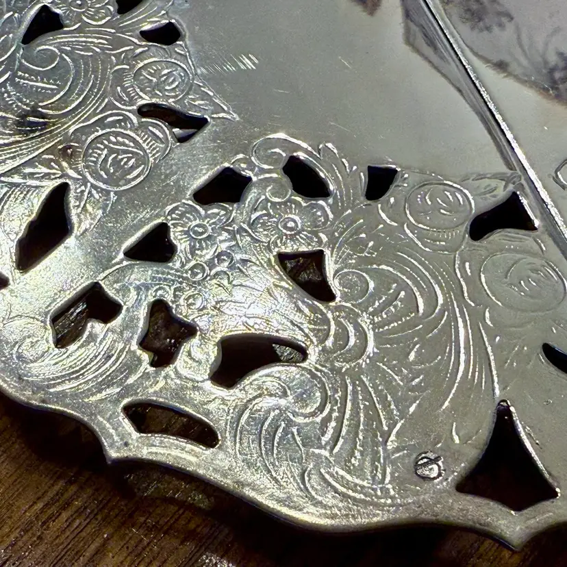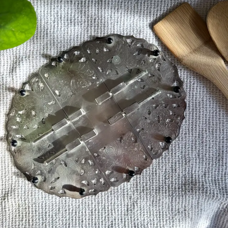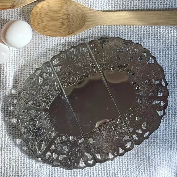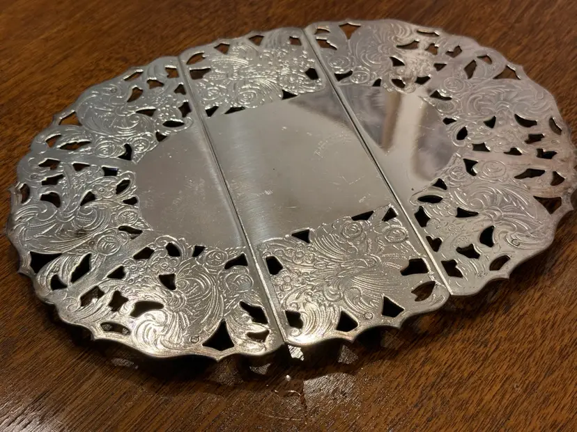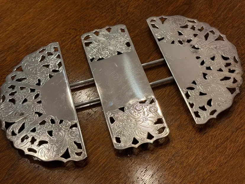 Add timeless elegance to your table with this vintage Raimond silver-plated expandable trivet. Designed with intricate pierced floral ends, it expands to fit a range of dishes while keeping hot serving pieces safely off your table surface.