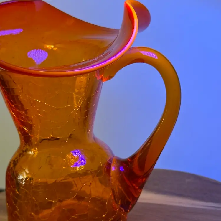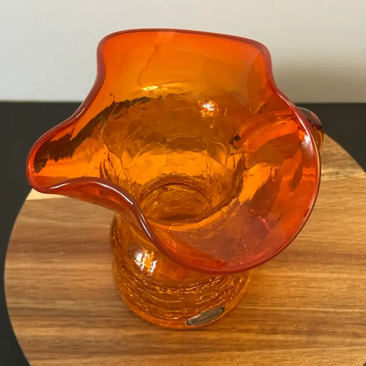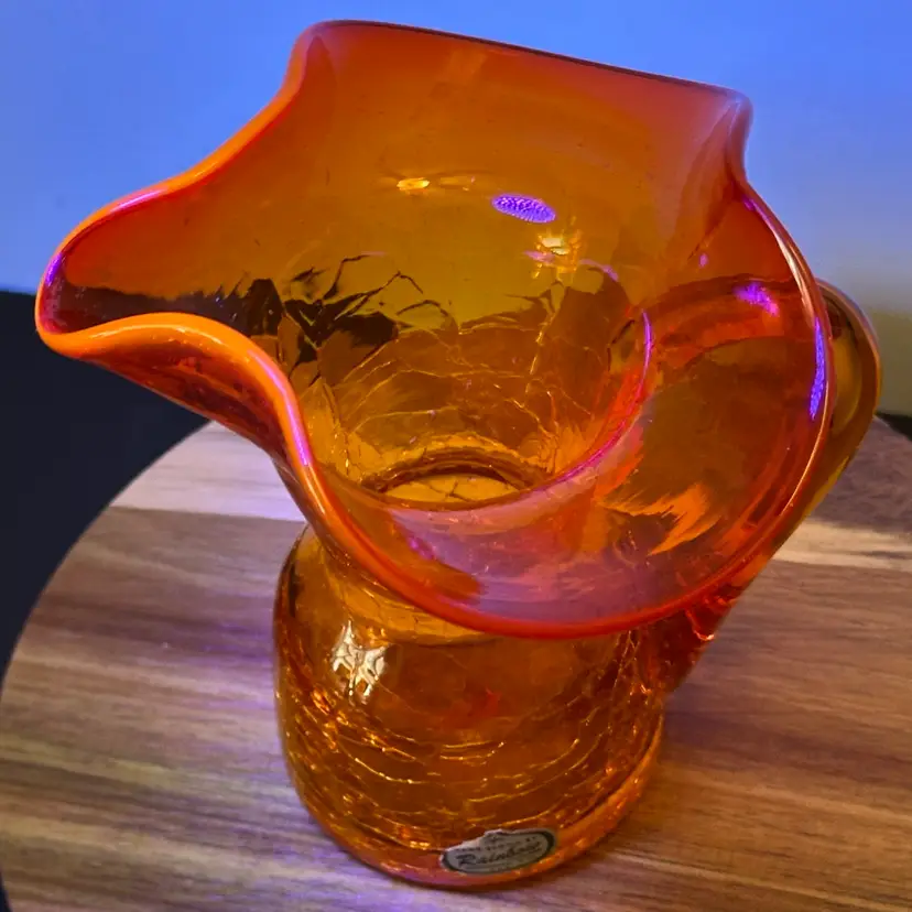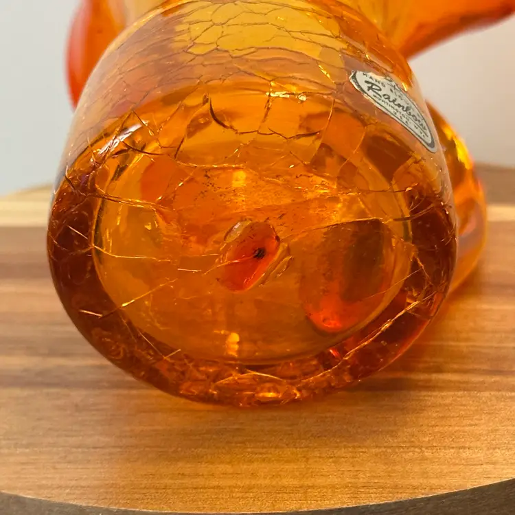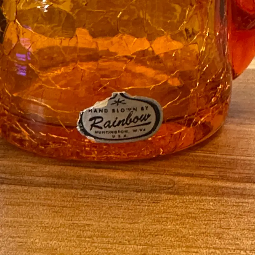 This item is a vintage Rainbow Art Glass crackle glass pitcher featuring an amberina color gradient, which transitions from red at the ruffled spout to a lighter orange/amber at the base. Hand-blown with a distinctive crackle finish and a pontil mark on the bottom. Often used as a creamer, small vase, or decorative display piece. Ruffled trumpet-style spout with an applied glass handle. Rainbow Art Glass (Huntington, West Virginia).
