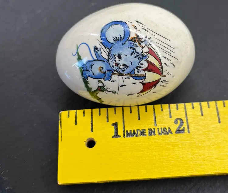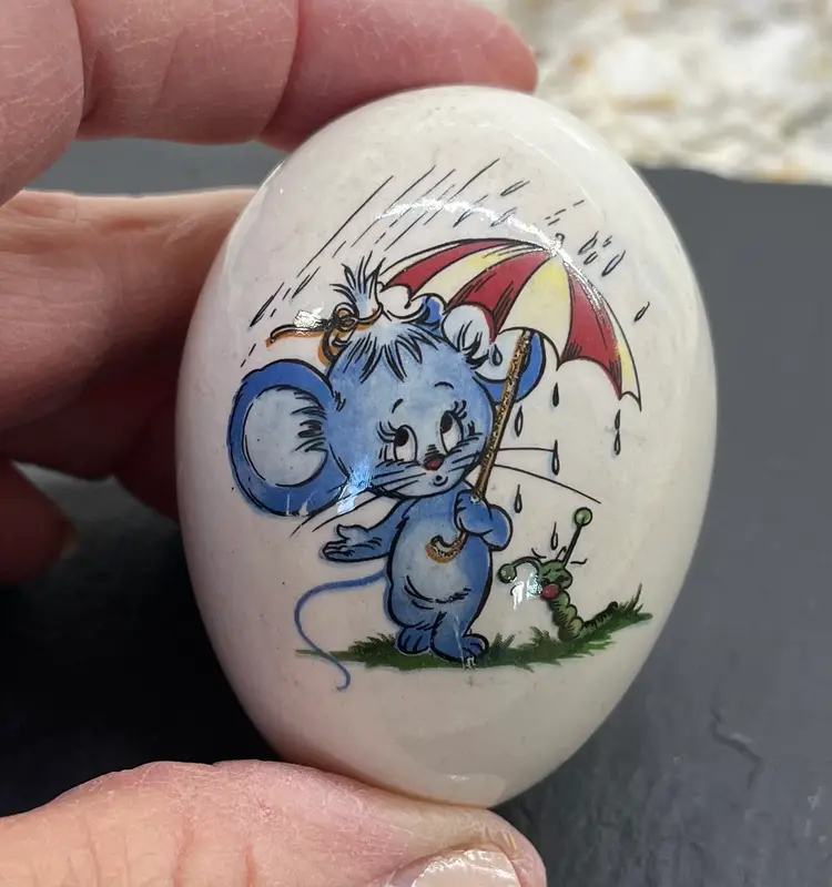 Adorable little mouse & caterpillar with umbrella on ceramic egg. Great for Easter!!