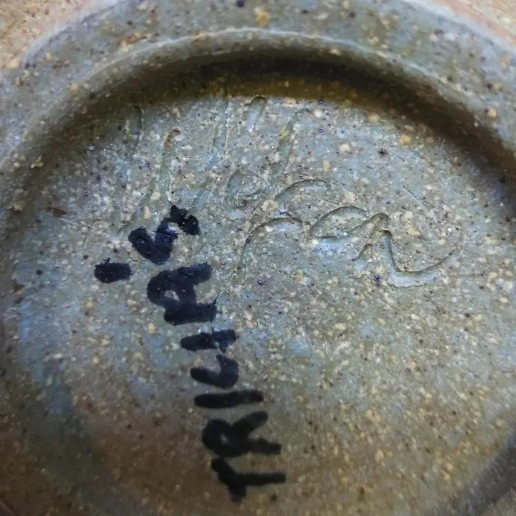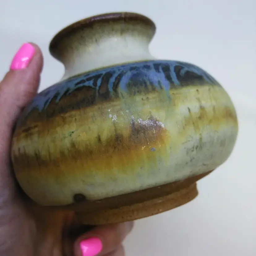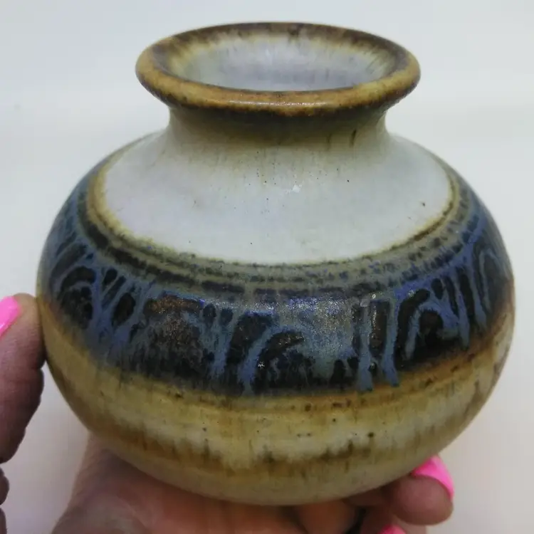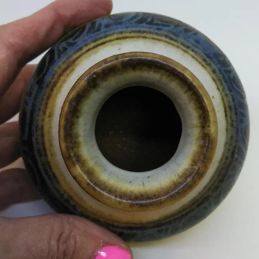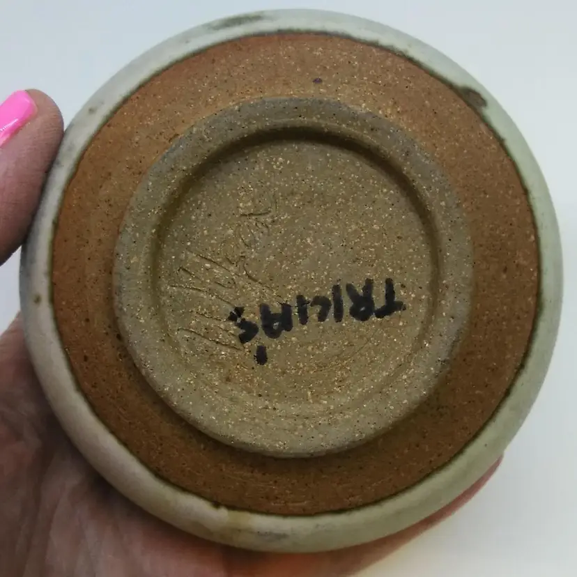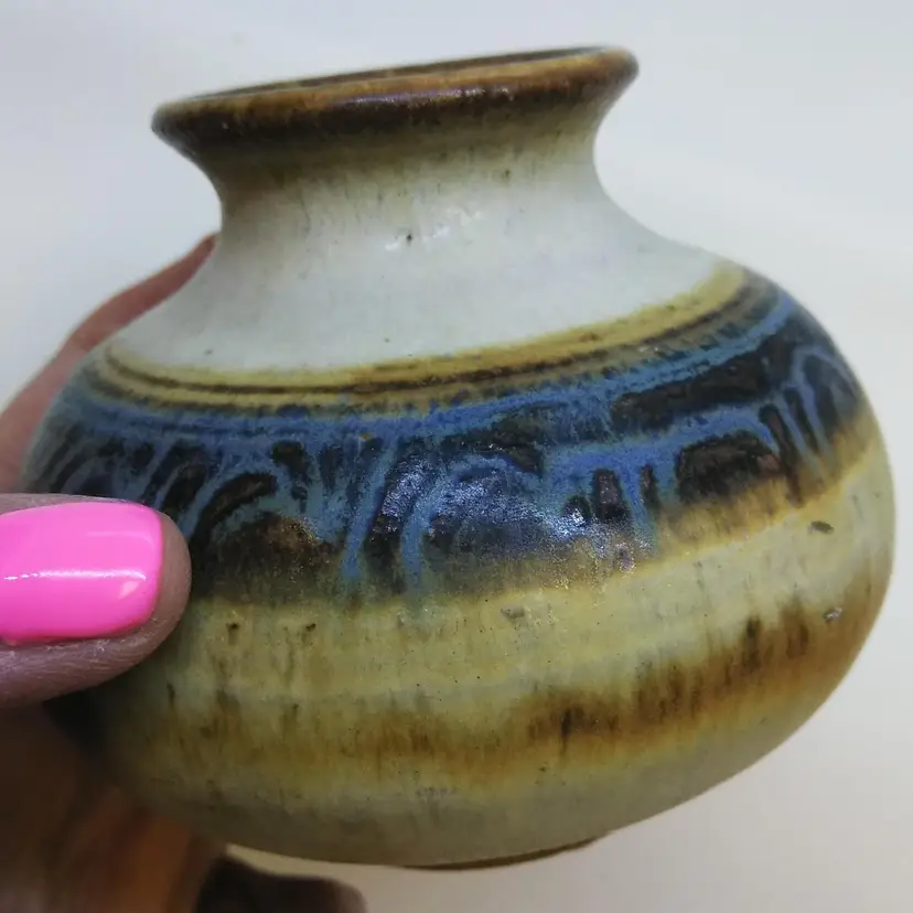 Here we have a special little studio pottery piece signed Wilson, heavy stoneware with an interesting raku design and lovely neutrals & blues colorway, the previous owner surely loved this little vessel as she wrote her name on the bottom with a black sharpie, no chips or cracks, excellent condition!