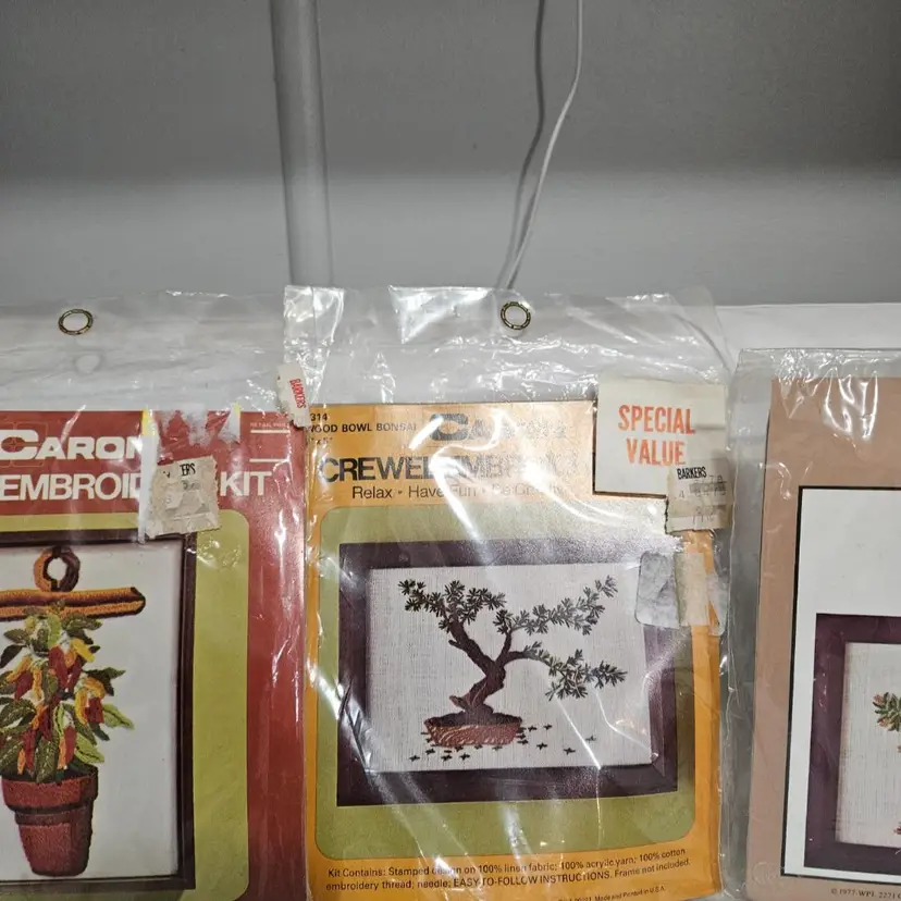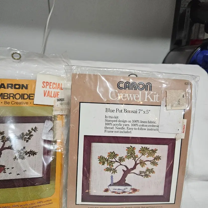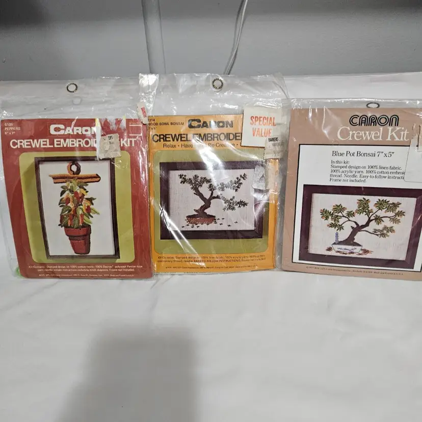 Vintage 1975,76,77 Rare Caron Crewel Embroidery kits peppers 6105,Wood bowl Bonsai 6314, Blue Pot Bonsai all are sealed 5"x7" fit frames