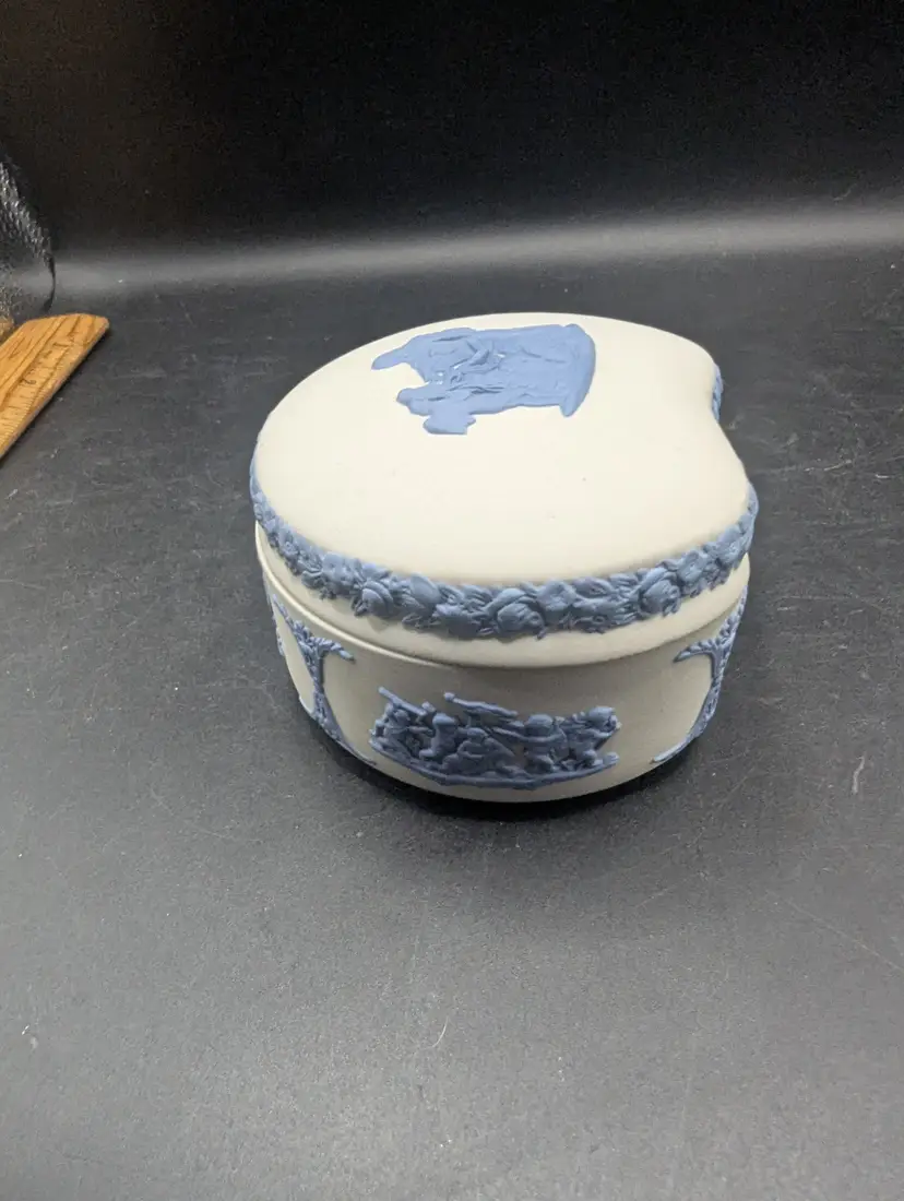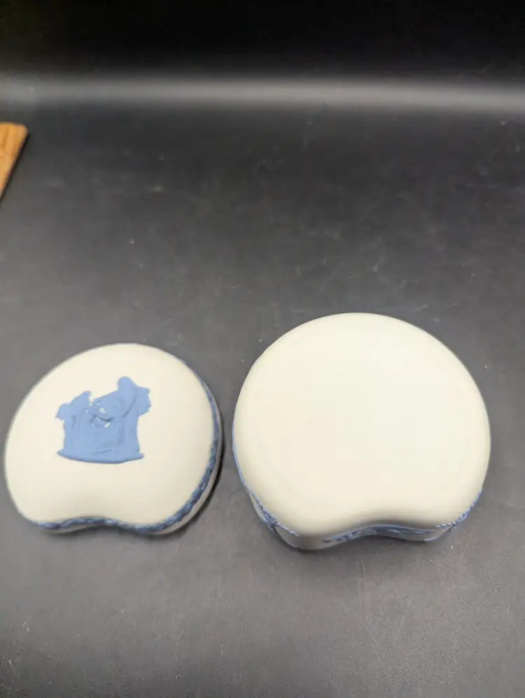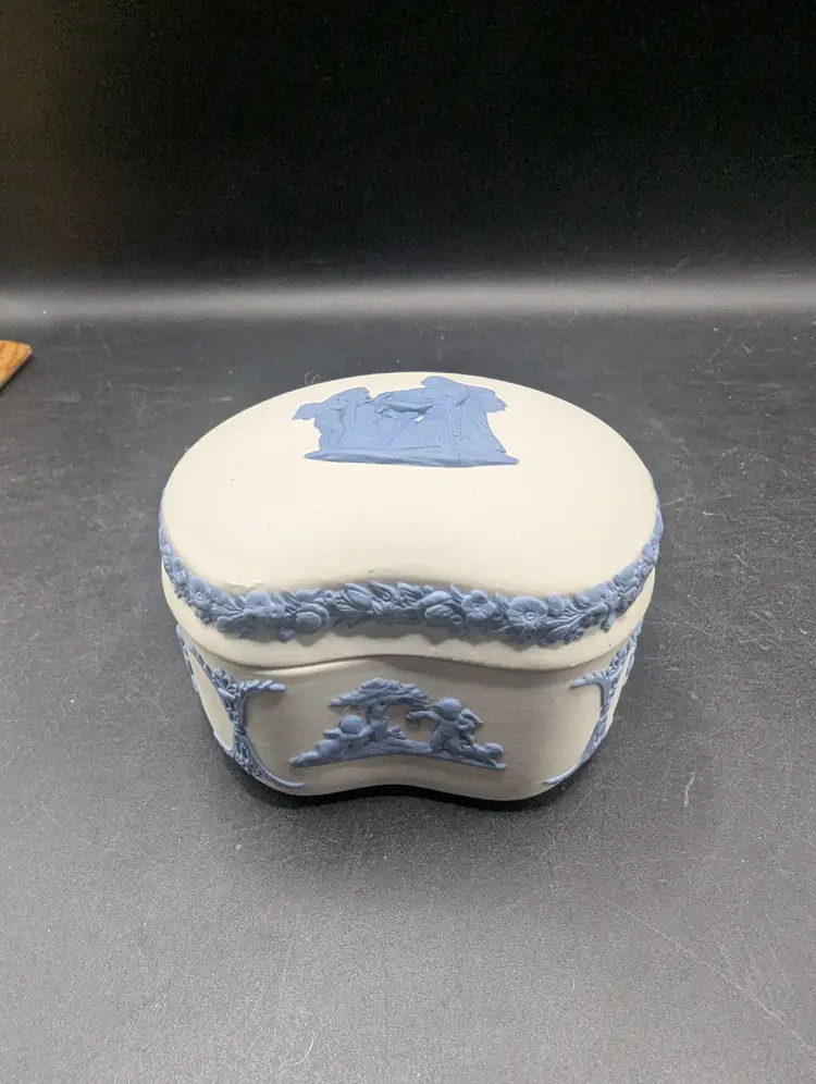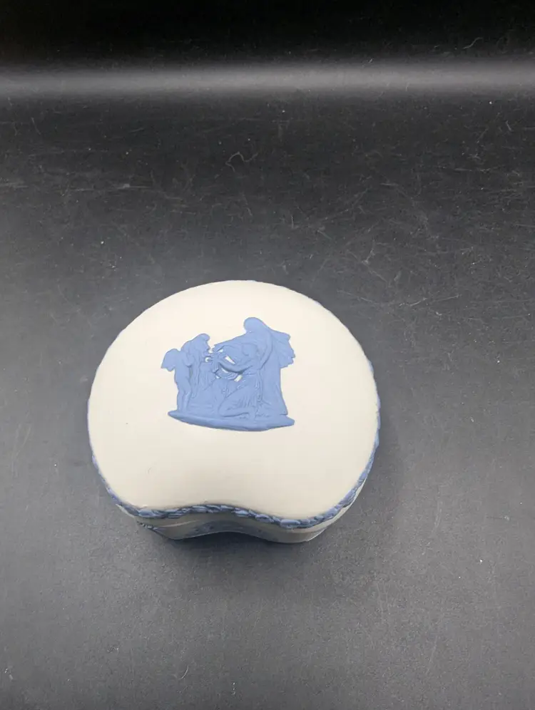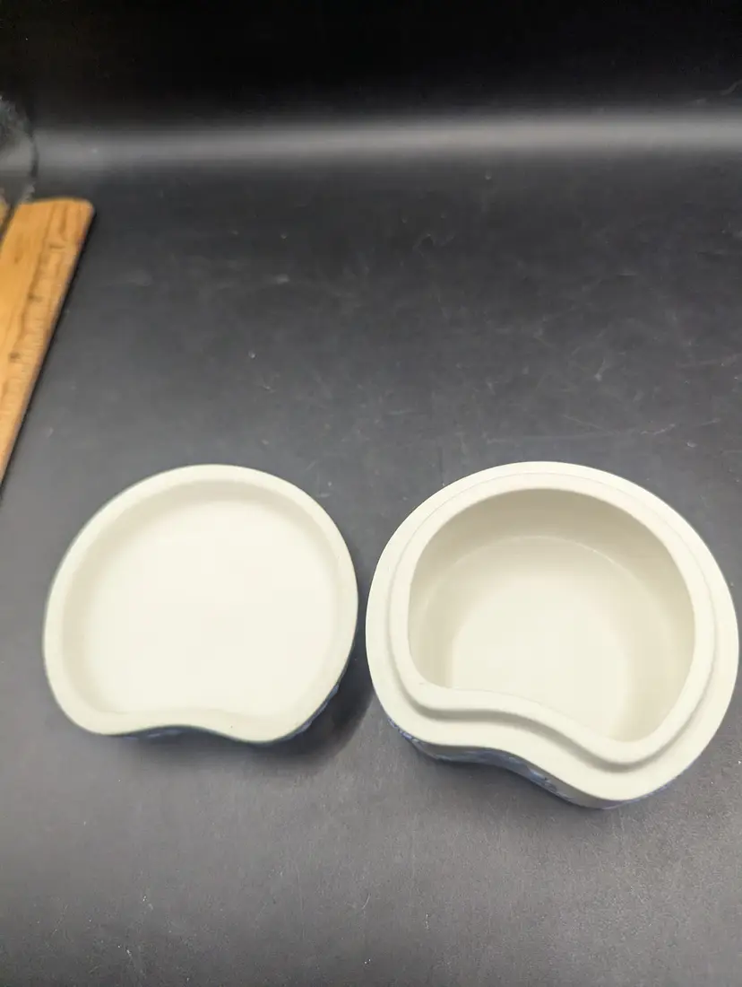 This is a lovely Vintage Rare Wedgwood Jasperware Reverse White & Blue Cupid As Oracle Kidney Trinket Box. No chips or chips. Please see all pictures for condition and measurements.