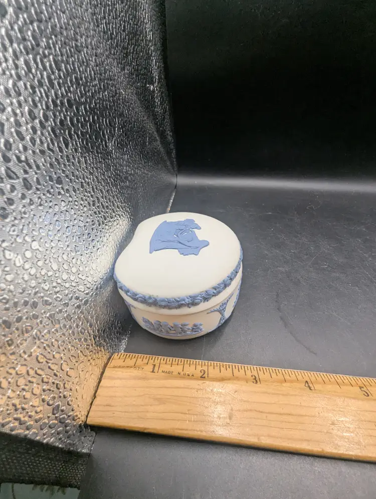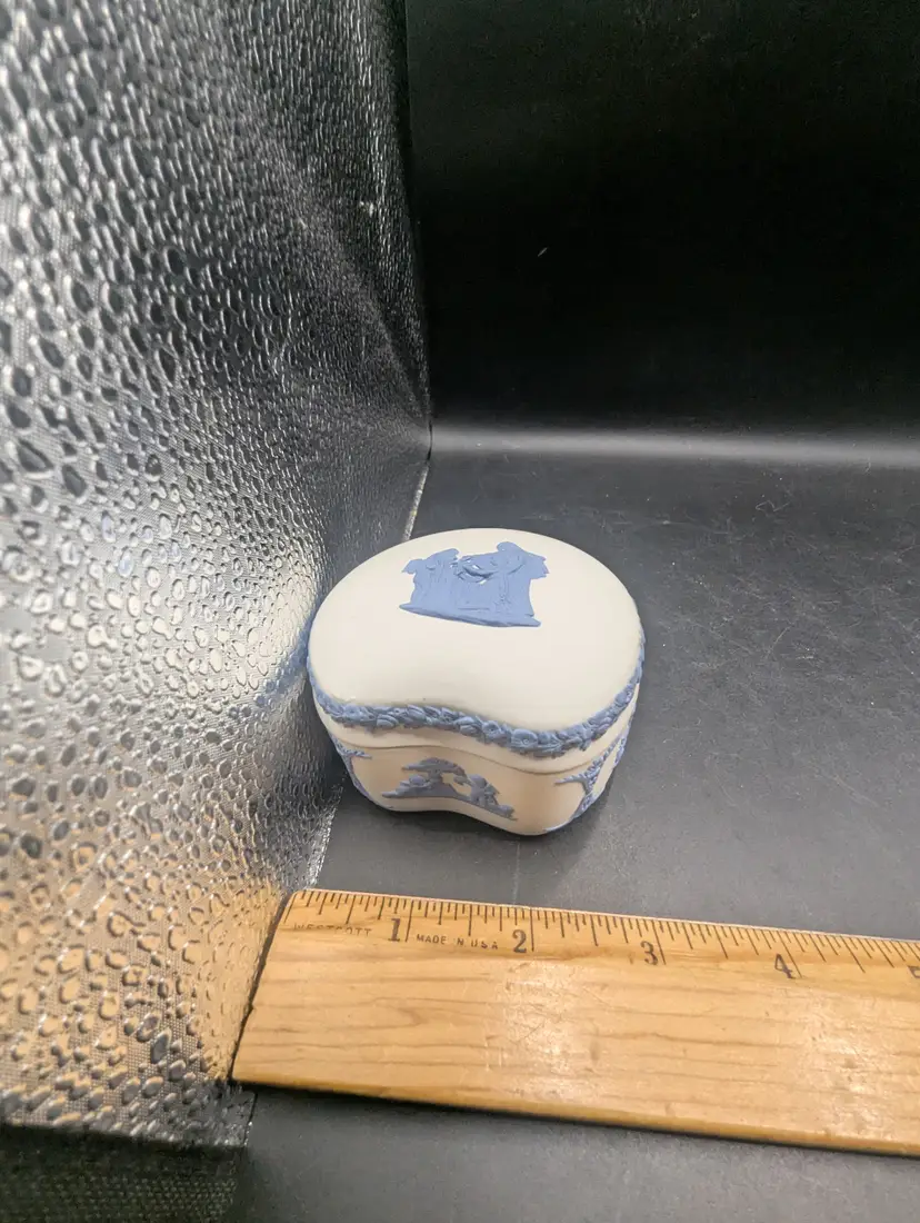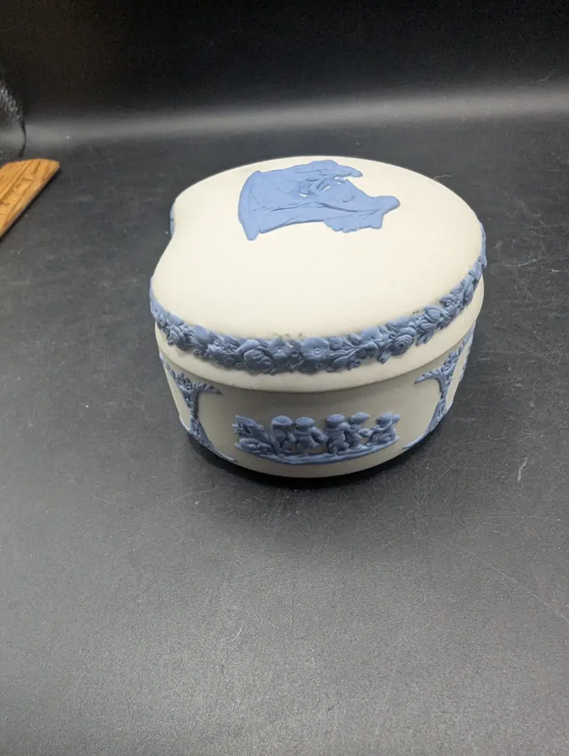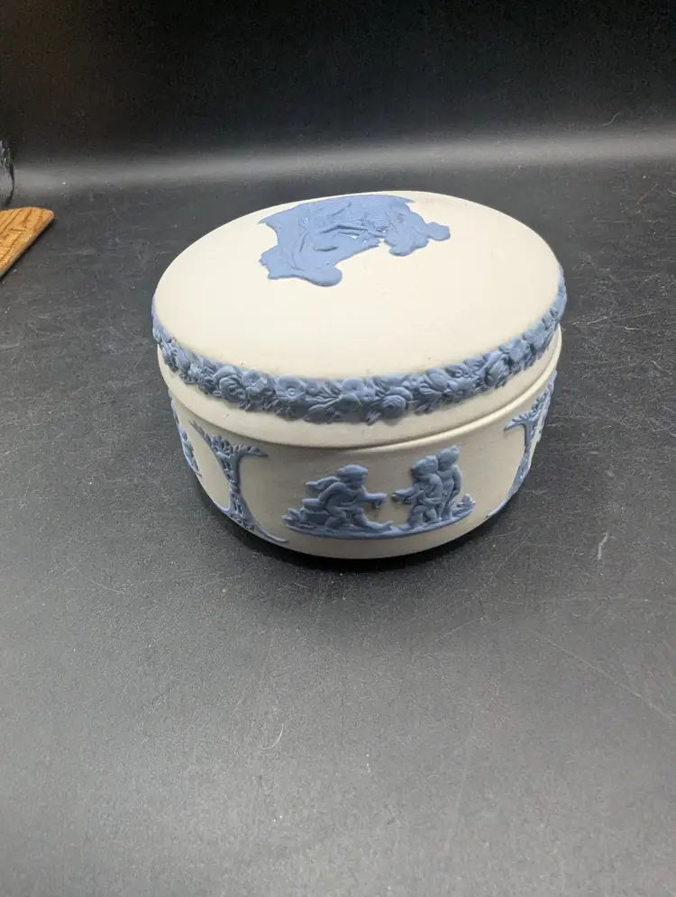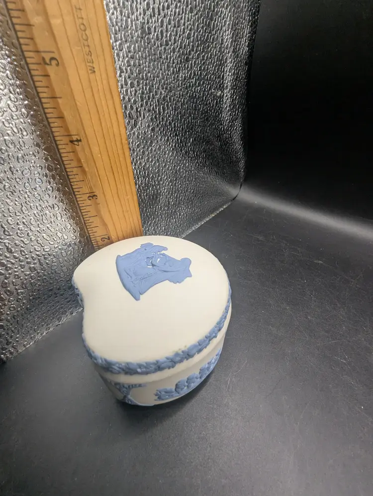 This is a lovely Vintage Rare Wedgwood Jasperware Reverse White & Blue Cupid As Oracle Kidney Trinket Box. No chips or chips. Please see all pictures for condition and measurements.