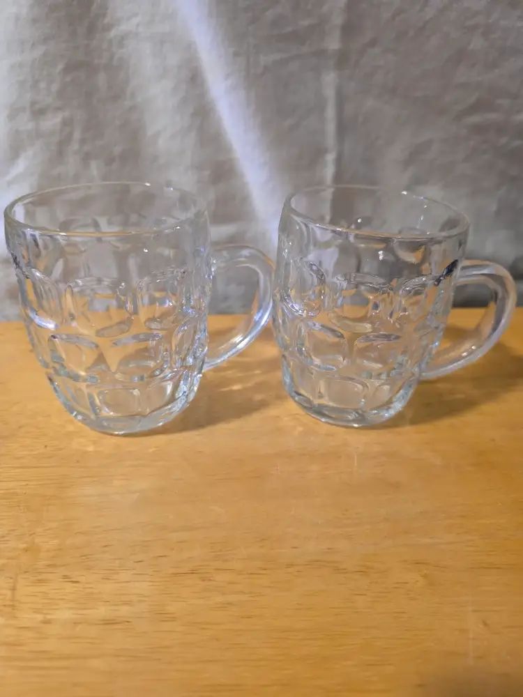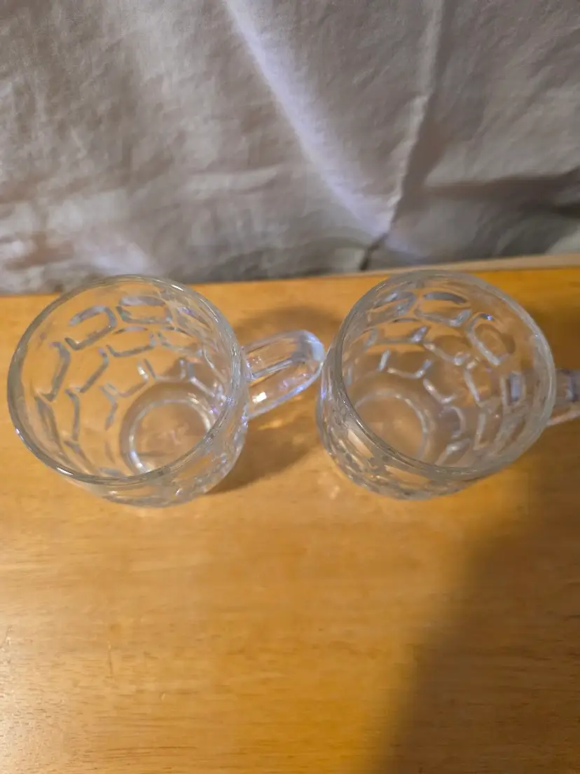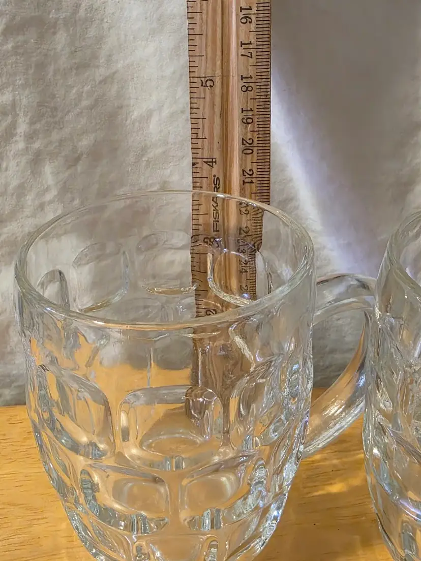 Enjoy your favorite brew in style with this set of vintage clear glass beer mugs. Perfect for casual gatherings or adding a classic touch to your barware collection. No chips, or cracks