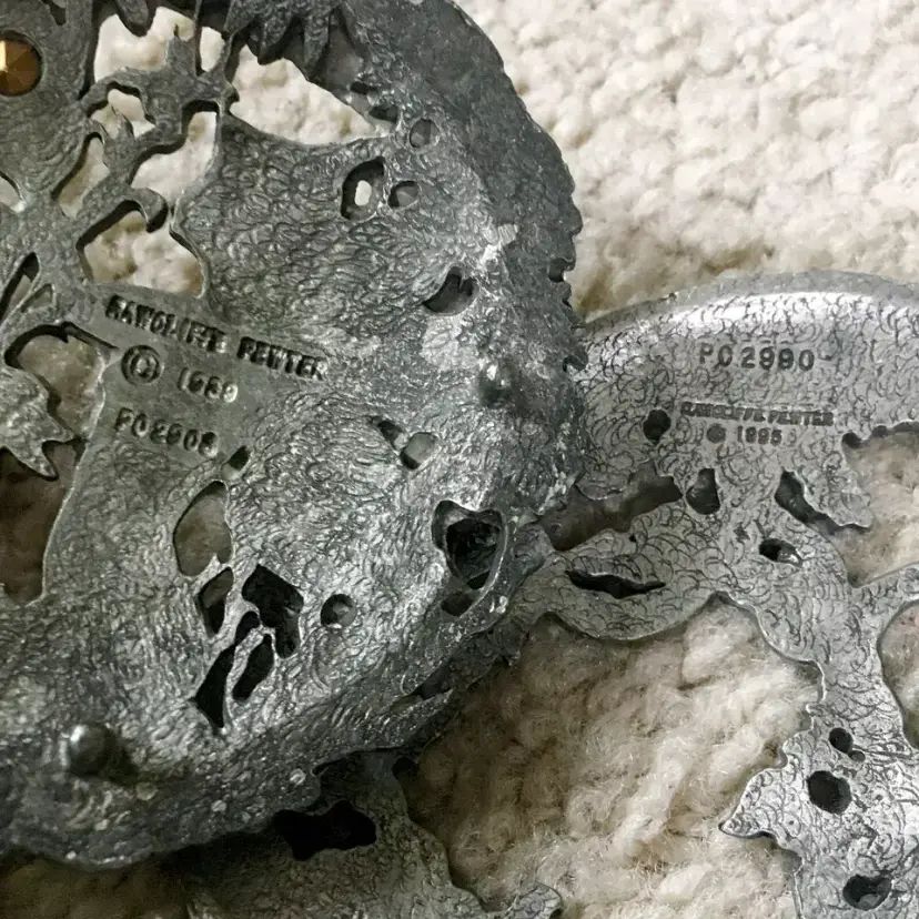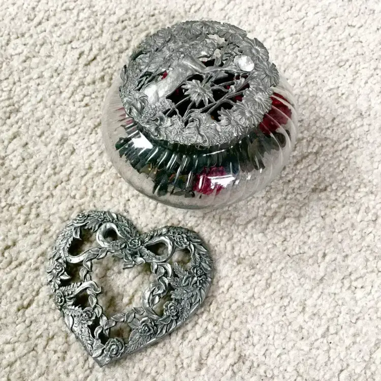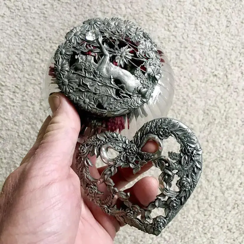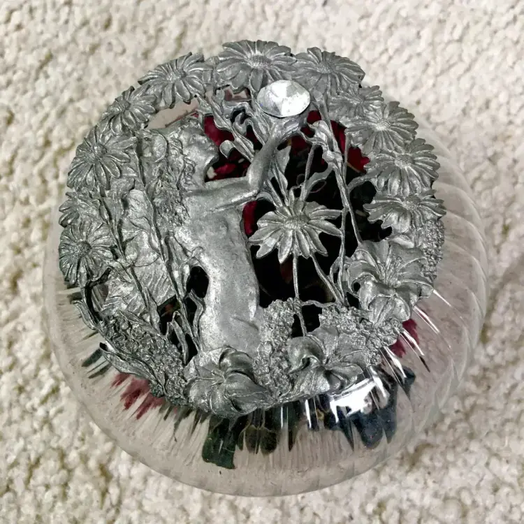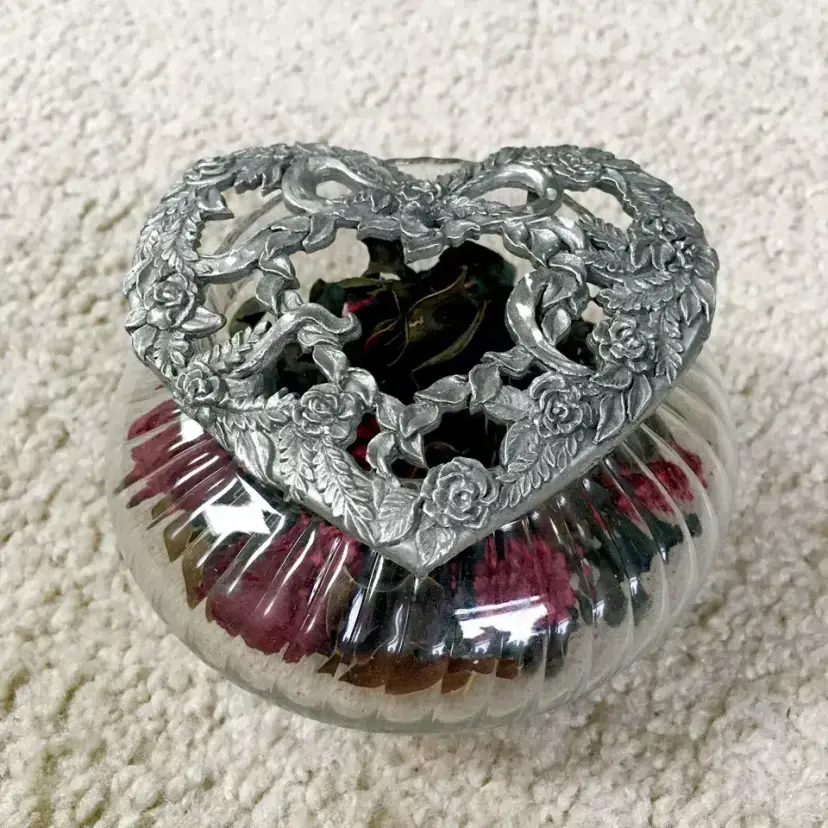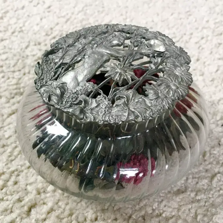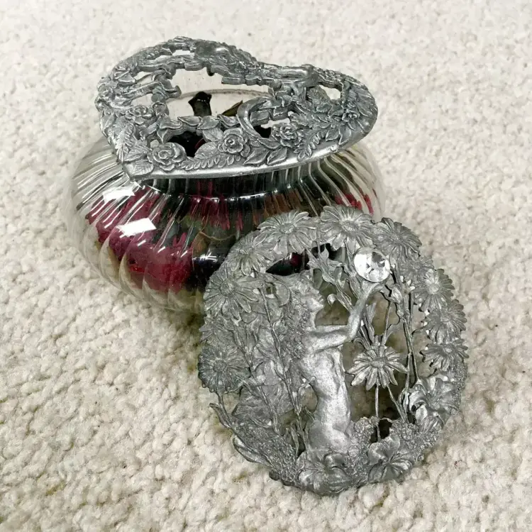 Vintage RAWCLIFFE PEWTER swirl clear glass potpourri jar with two pewter lids (PC2990 dated 1995, and PO2908 dated 1989) and potpourri. Rawcliffe Pewter Corporation was an American metalworking company founded in North Providence, Rhode Island in 1903. It produced high quality bronze, silver, and pewter for over a century. The potpourri jar has various style pewter lids which could be purchased separately from the glass jar itself… the idea being to collect the different lids to interchange with your jar. This item is excellent condition throughout with no chips or cracks to the glass jar. Pewter lids also excellent. Jar includes potpourri as shown. Jar measures about 4.5” diameter. See pics for more details.
