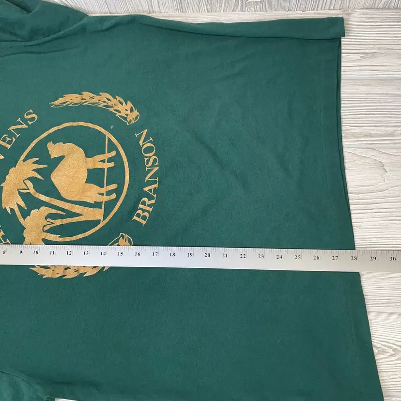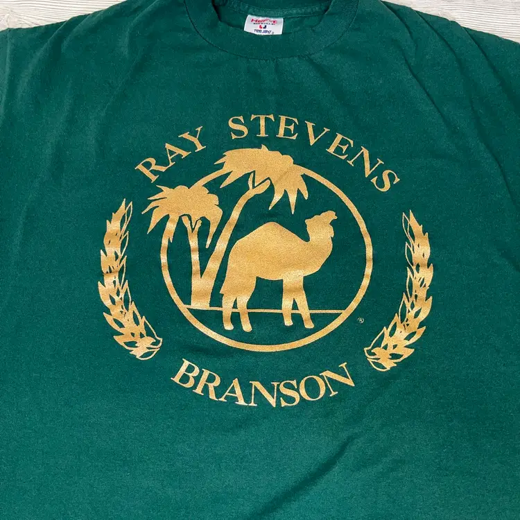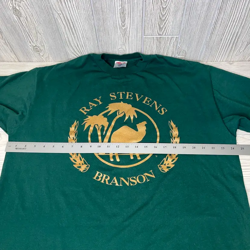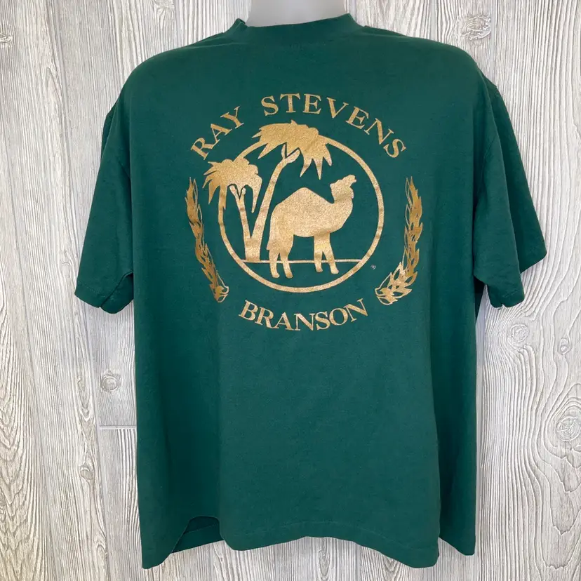Vintage Ray Stevens Branson Camel T-Shirt Size XXL 2XL Green Gold Single Stitch HEF-T. The pit-to-pit measurement is approximately 24 inches. The length measurement is approximately 28 inches. Measurements taken from the outside front of the garment. The condition is Used. There are no rips, holes, stains, or tears. See photos for details.