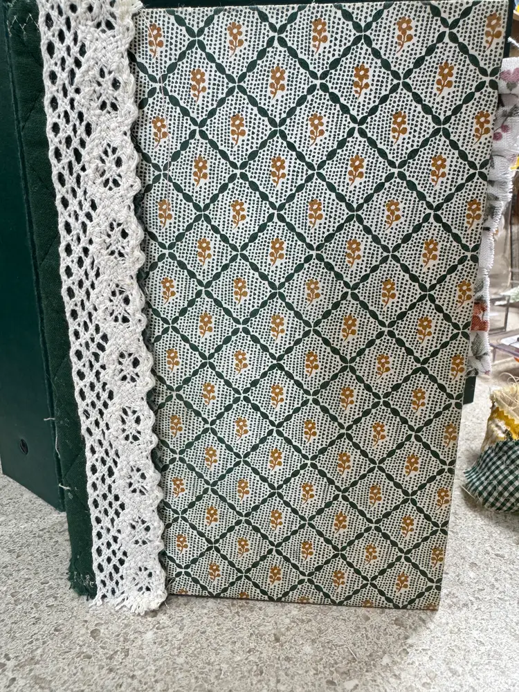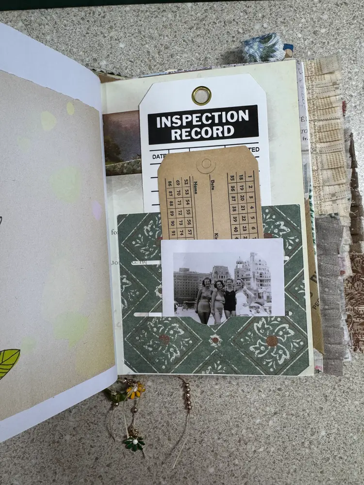 2 signatures - 14 pages in the 1st signature and 12 pages in the 2nd signature. This eclectic journal includes vintage ledger, pockets, tucks and tags. and lace trim on several of the pages.
