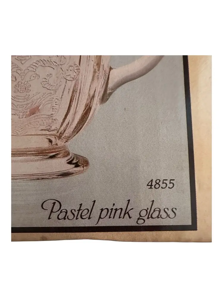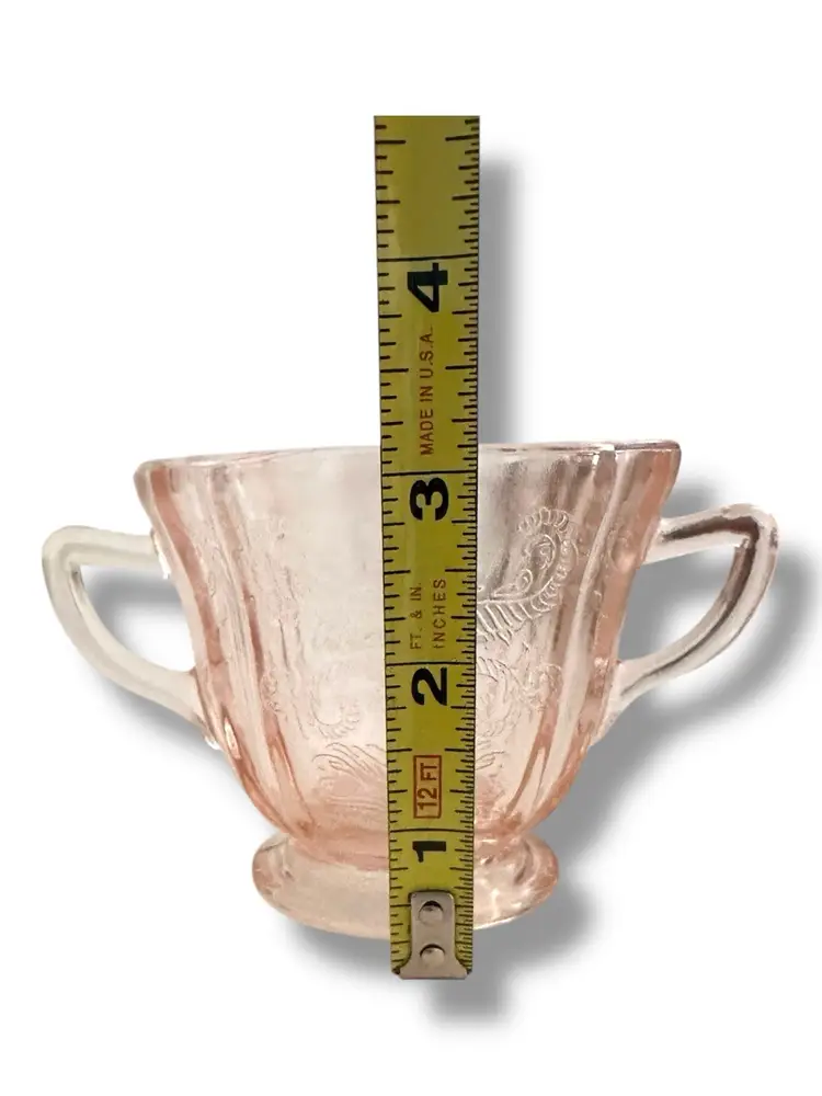 The Vintage Recollection Pink Sugar Bowl & Creamer by Indiana Glass Madrid Replica 1982 is a charming set perfect for various occasions like birthdays, bridal showers, and Christmas. The medium-sized , 3 inches tall, creamer and sugar bowl feature an all-over pattern in pink depression glass, with a retro theme and original licensed reproduction. Made in the United States in the 1980s, this set includes handles and is a nostalgic piece that adds a touch of elegance to any kitchen or dining table. It comes in its original box. This comes from a pet free and smoke free environment.