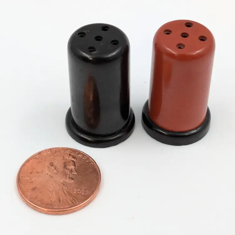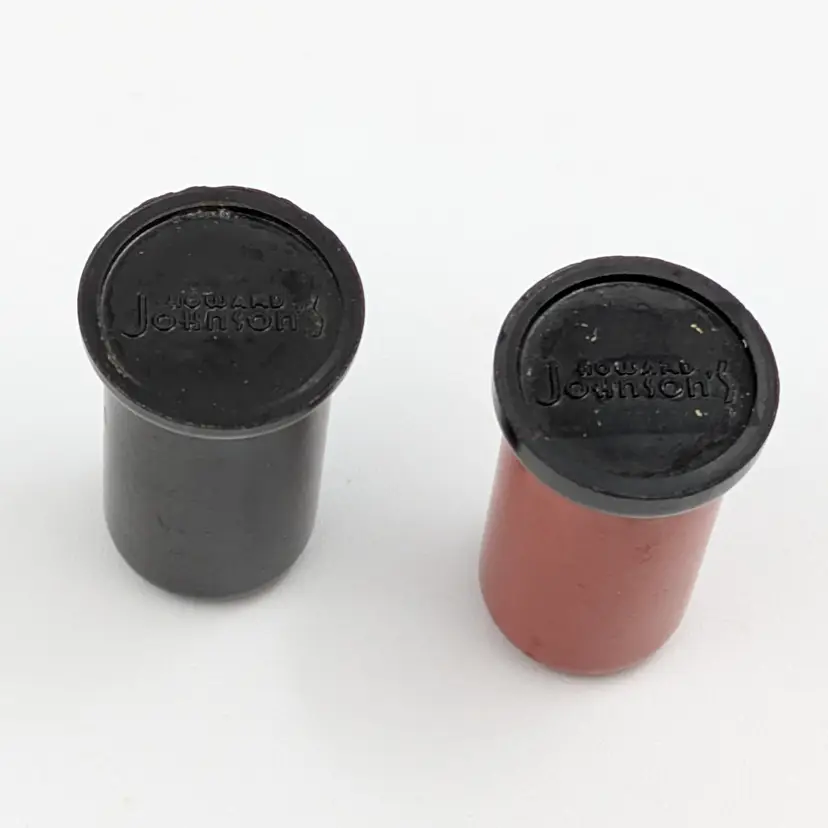 Charming vintage salt and pepper shakers in a sleek red and black design. Stamped Howard Johnson's on the bottom.