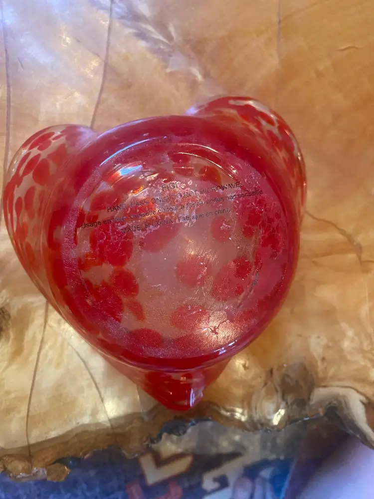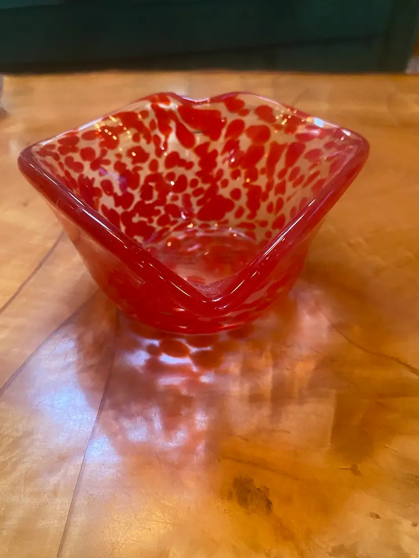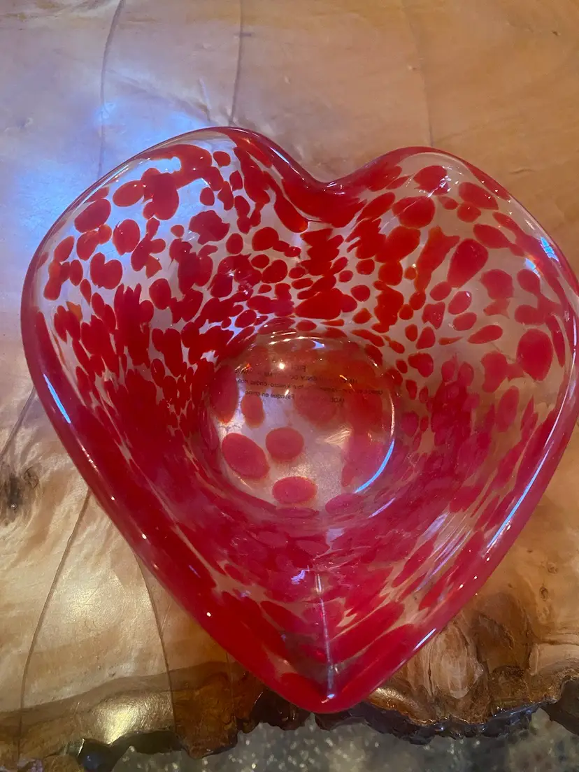 Vintage Red & Clear Glass Heart-Shaped Bowl with Speckled Pattern - 6”x7” – Fiji ✨ Add a pop of color and style to your space with this beautiful vintage glass heart-shaped bowl! This striking piece features a rich red and clear speckled pattern that stands out in any room. With the signature FIJI on the bottom, it’s a perfect addition to your collection or a unique gift. 💎 Condition: Excellent pre-owned condition, no chips or cracks. There is a small bit of wear on the bottom from age, but it doesn’t detract from its beauty. See photos for close-ups! Price: $18 🌟 Measurements: • Width: 6” • Length: 7” • Height: 3.5” 🔴 Perfect for: • Decorative display • A unique gift • Adding a touch of vintage charm to your collection