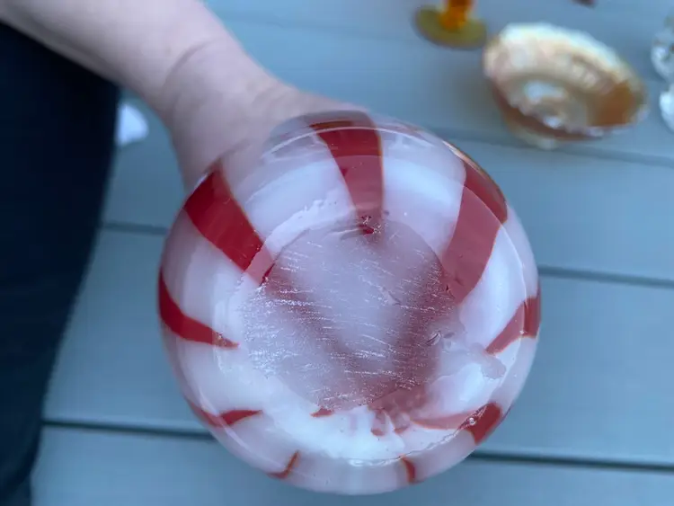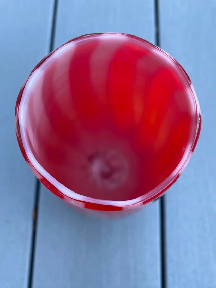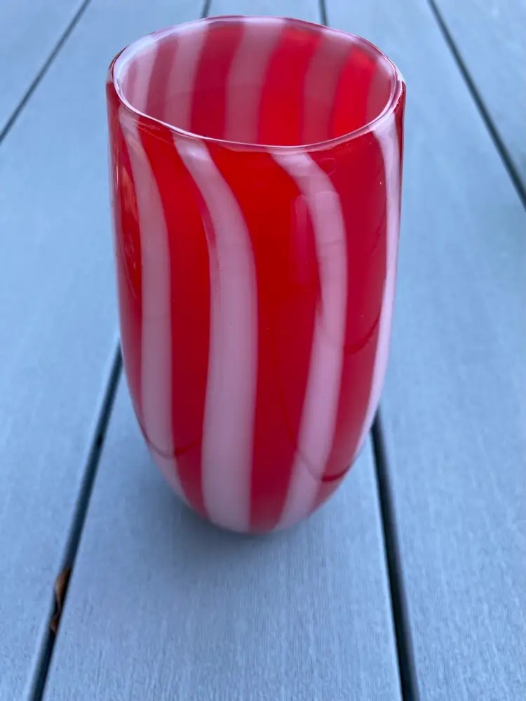 This is Christmas in a vase! This stunning hand blown VINTAGE RED AND WHITE PEPPERMINT TWIST GLASS VASE is such a unique piece of art glass perfect for decorating all year round, but especially for the Christmas season. If you look at the bottom of the vase it looks just like a peppermint candy! It would be fun to display it along side a bowl of actual peppermint twist candies! This vase measures approximately 7” tall and 4” wide at its widest. These hand blown vases are all unique—no 2 are alike!