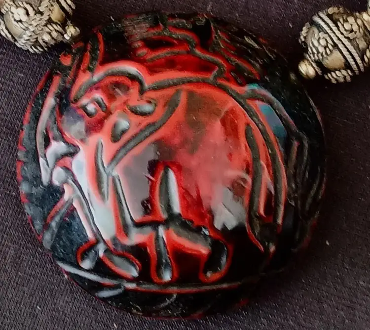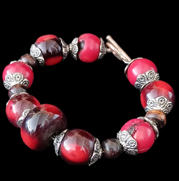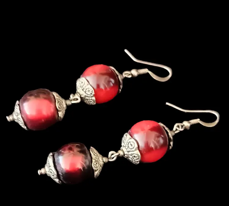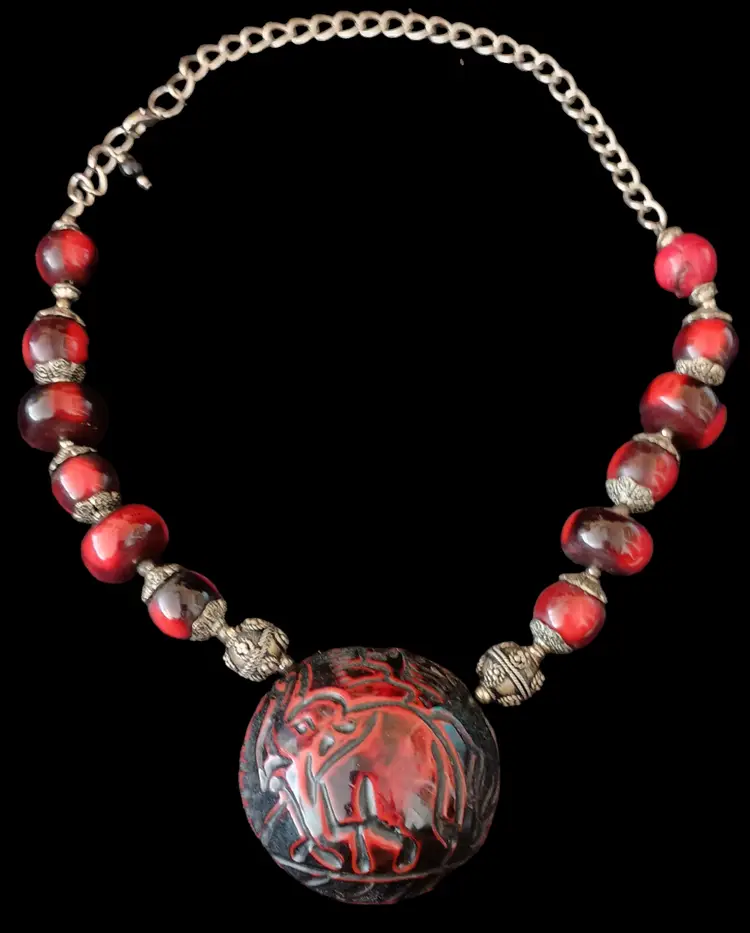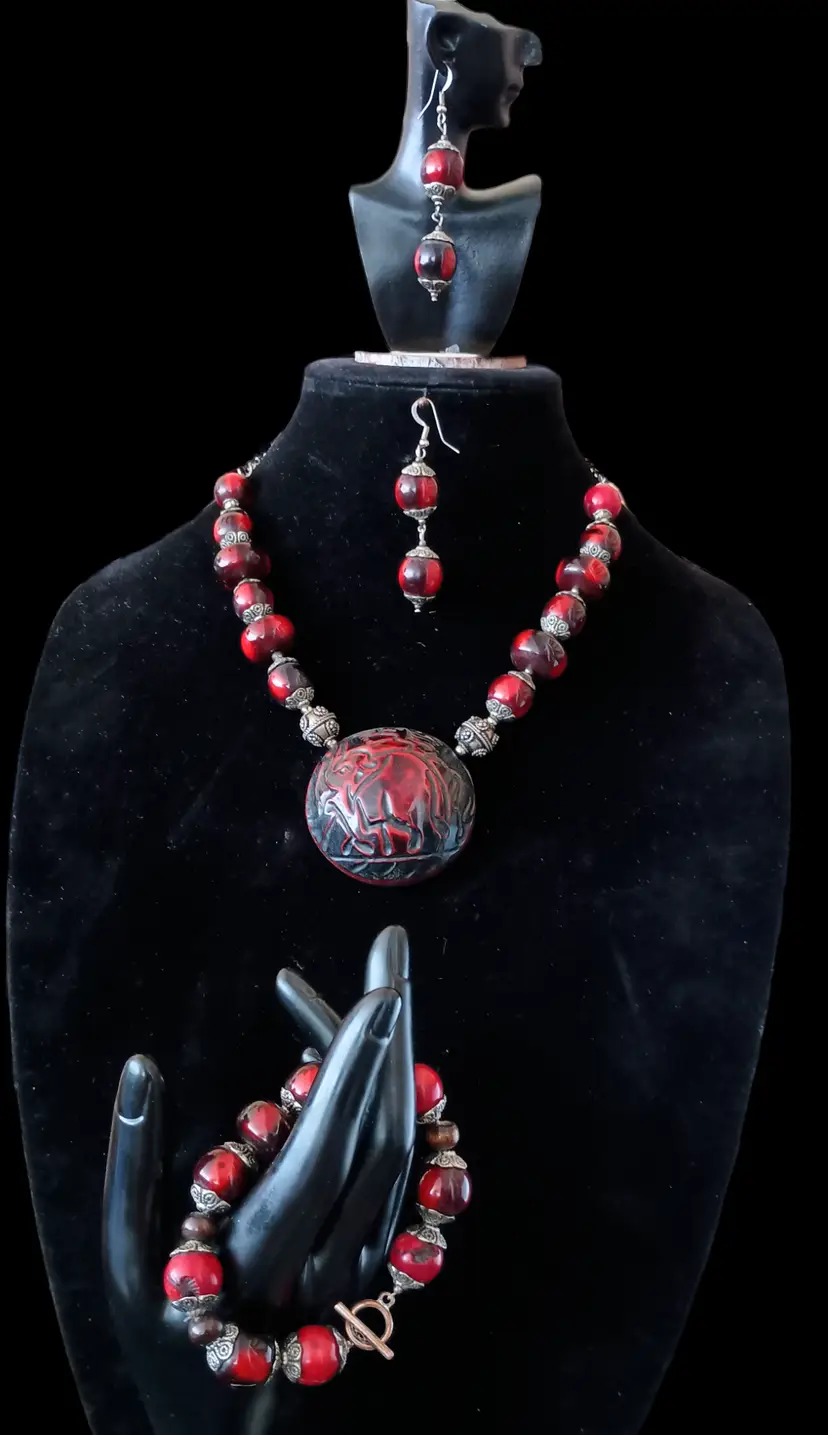 Rare and Unique set with Vintage Red and Black Set Dangle Earrings (2.5" 14mm beads), Toggle Bracelet (7.5"), & Elephant Pendant Necklace (20") with 2.5" Pendant. This is a stunning, eye-catching set that makes a bold statement. Perfect for adding a dramatic touch .