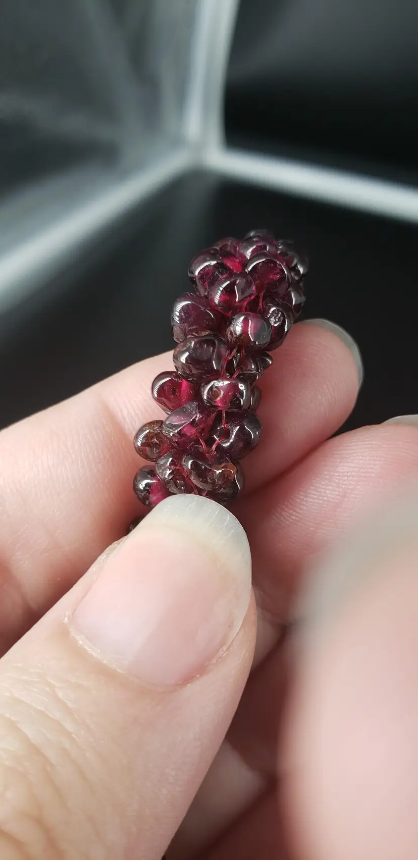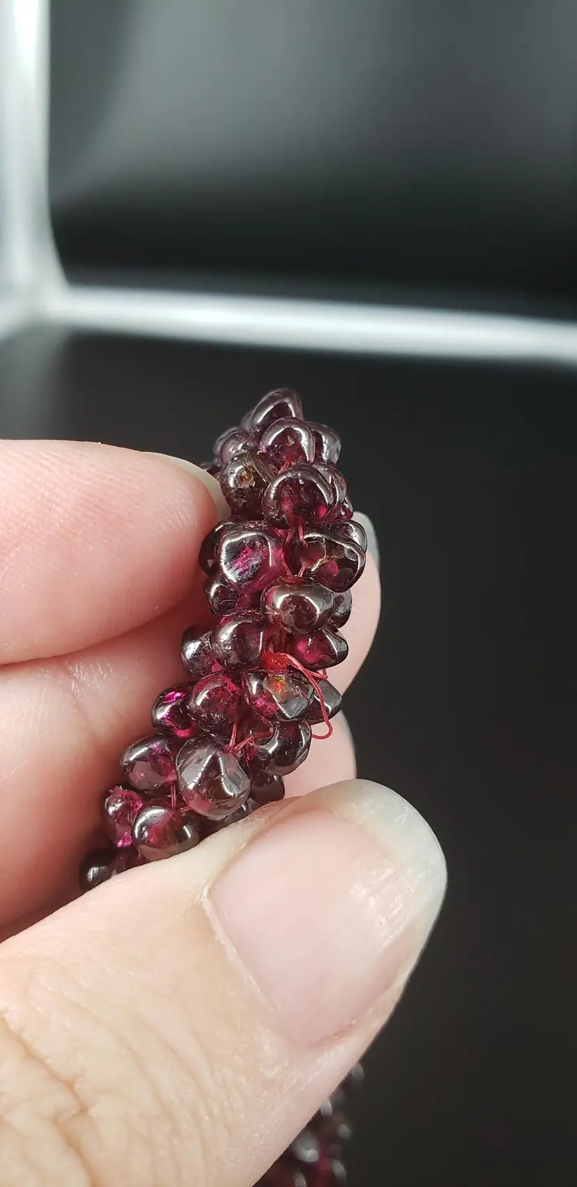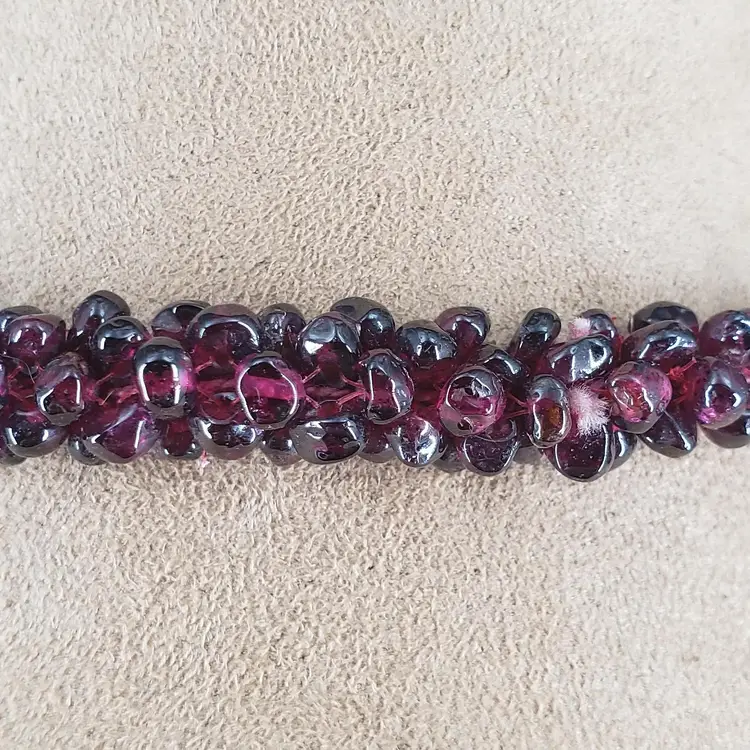 This beautiful vintage necklace features natural red garnet gemstones arranged in a cluster setting. The necklace is 26 inches in length and handmade. The bohemian style of the necklace is perfect for any unisex adult who loves vintage and antique jewelry. It is perfect for any occasion and can be paired with any outfit. It is a perfect addition to any collection and is sure to impress. Some thread ends are visible, otherwise in great condition!