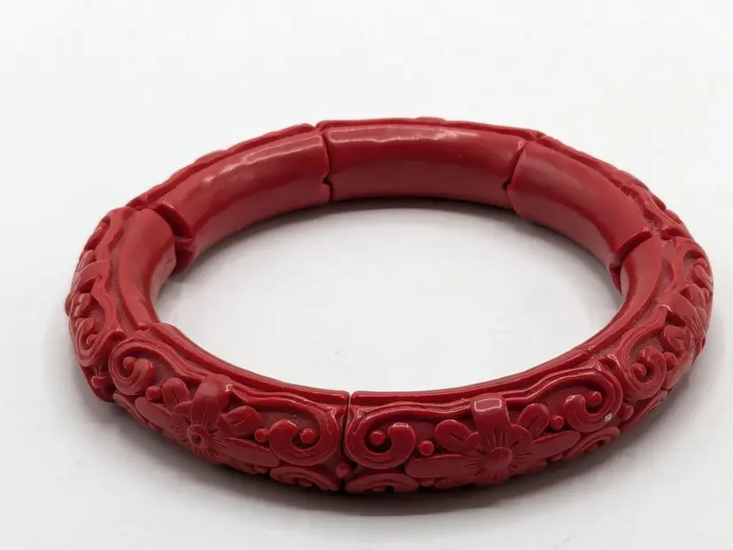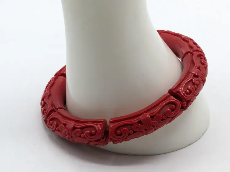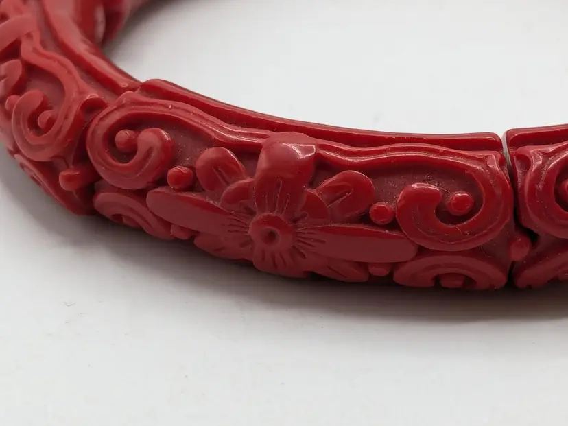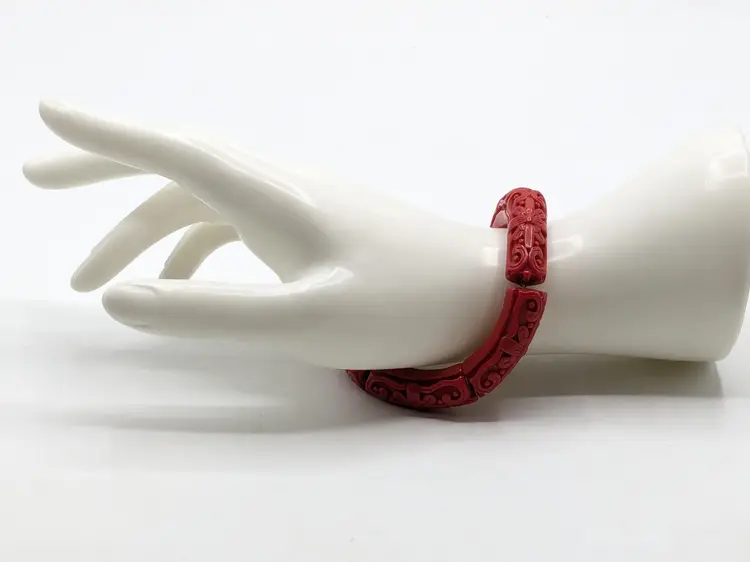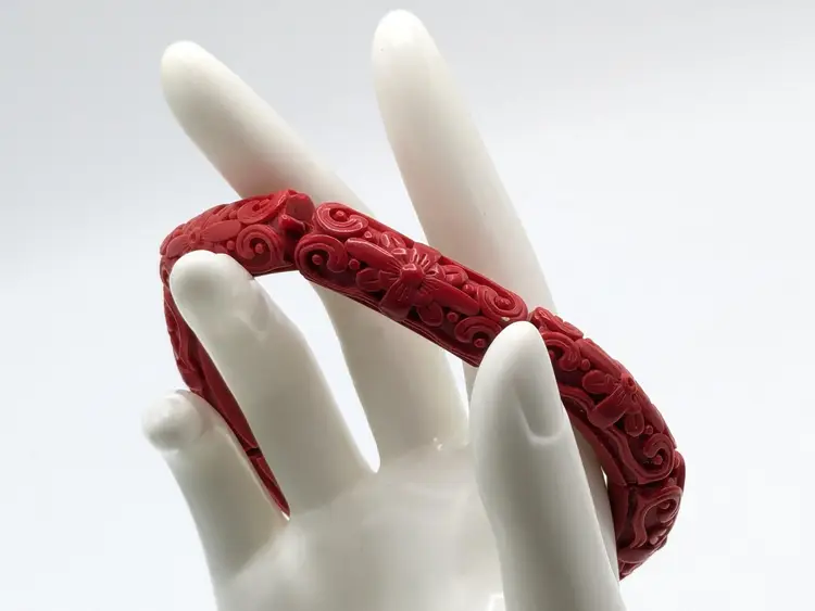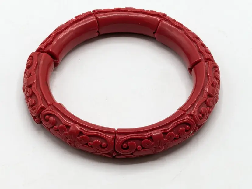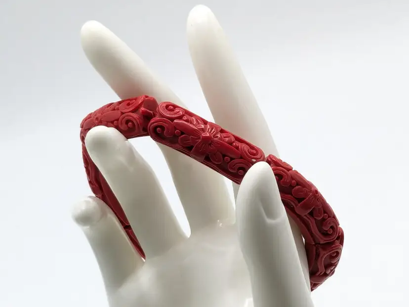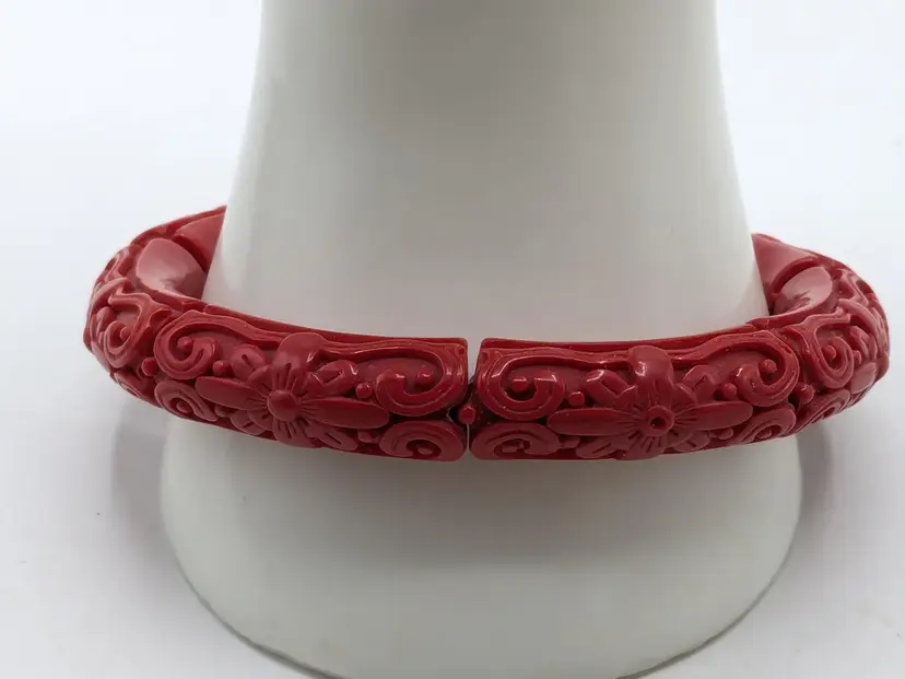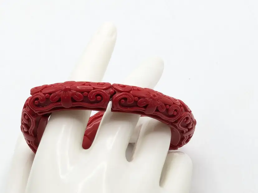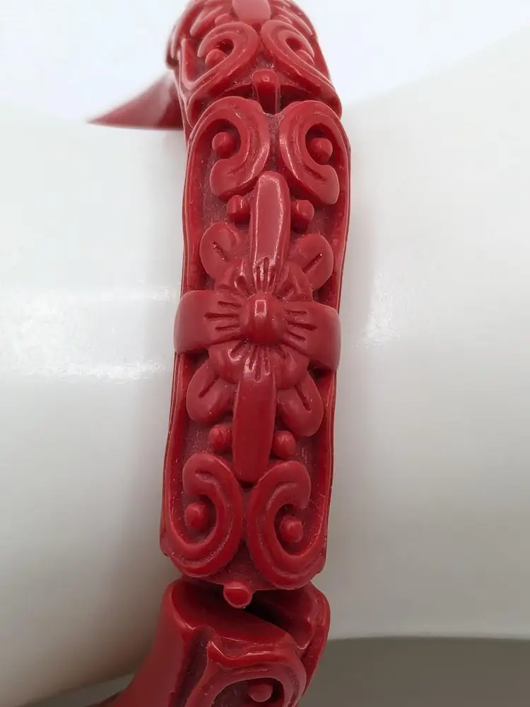Good condition. FAUX cinnabar. Beautifully detailed carved design. Size 8. (EN1)