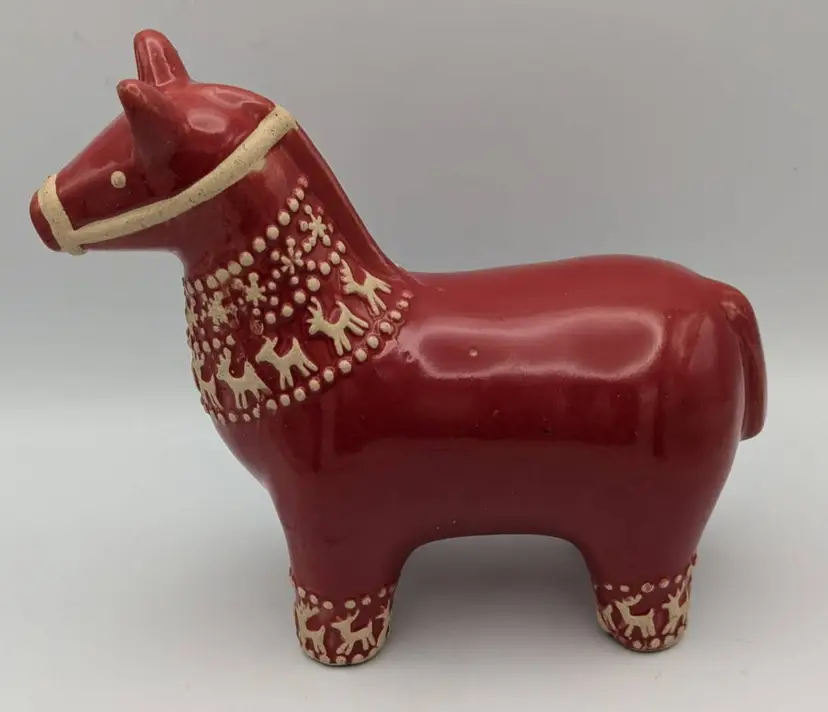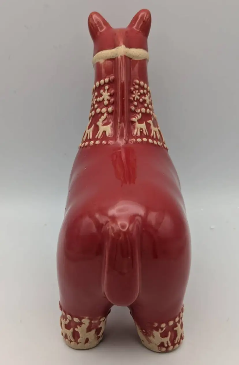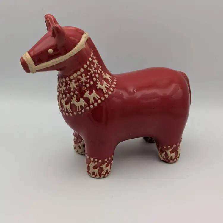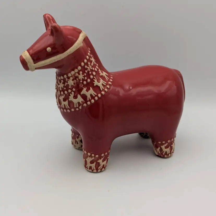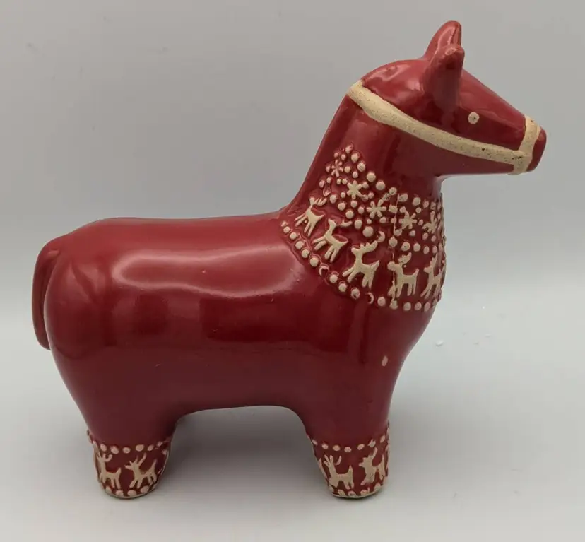 This is a Vintage Red Ceramic Dala Horse - red and creme colored. I truly can't find anything on it. It is perfect for this time of year. Very festive with it being decorated with reindeer and snowflakes.