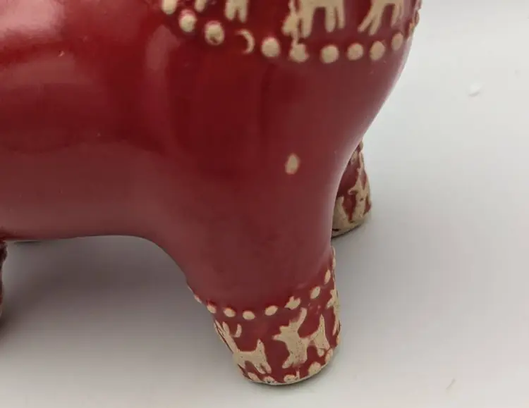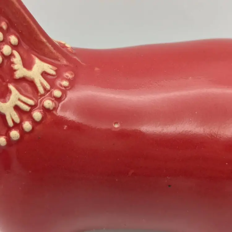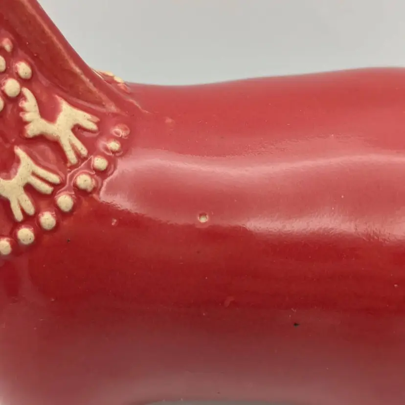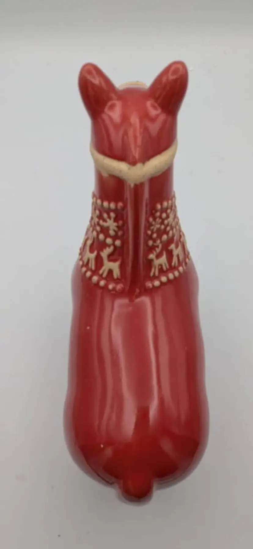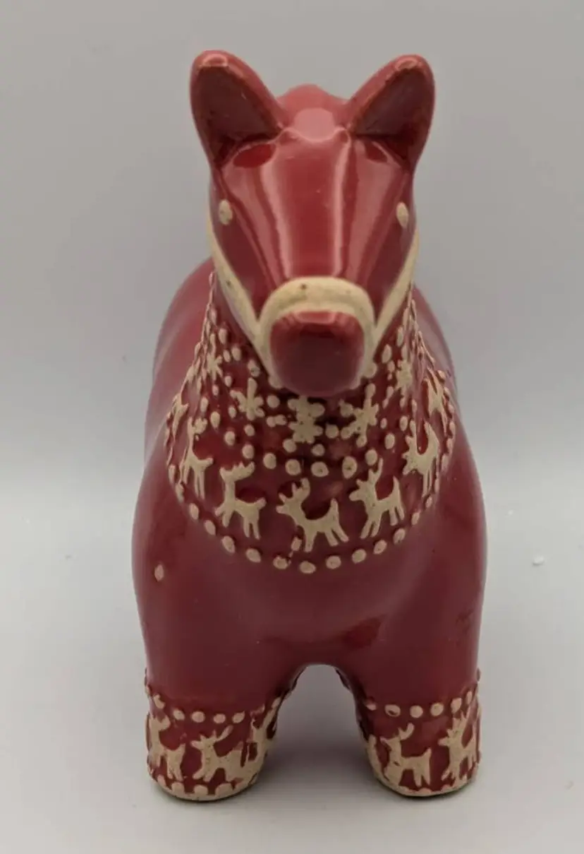 This is a Vintage Red Ceramic Dala Horse - red and creme colored. I truly can't find anything on it. It is perfect for this time of year. Very festive with it being decorated with reindeer and snowflakes.