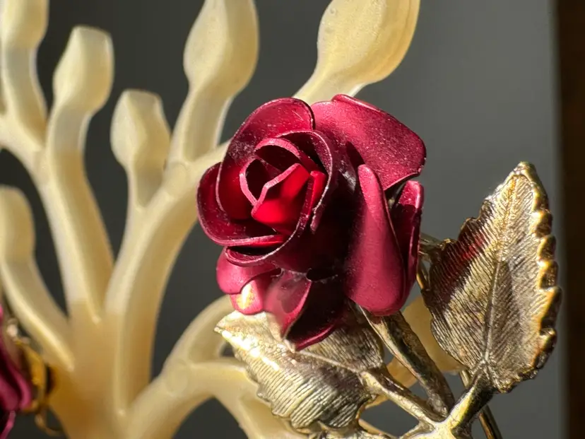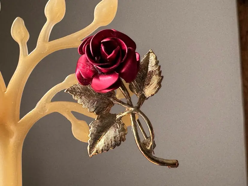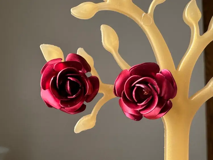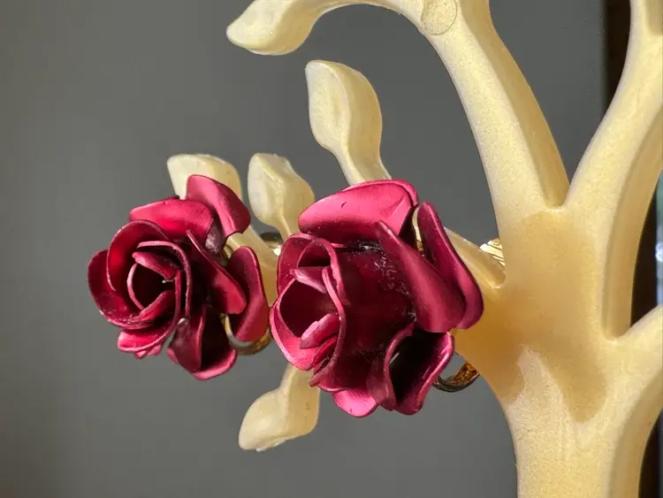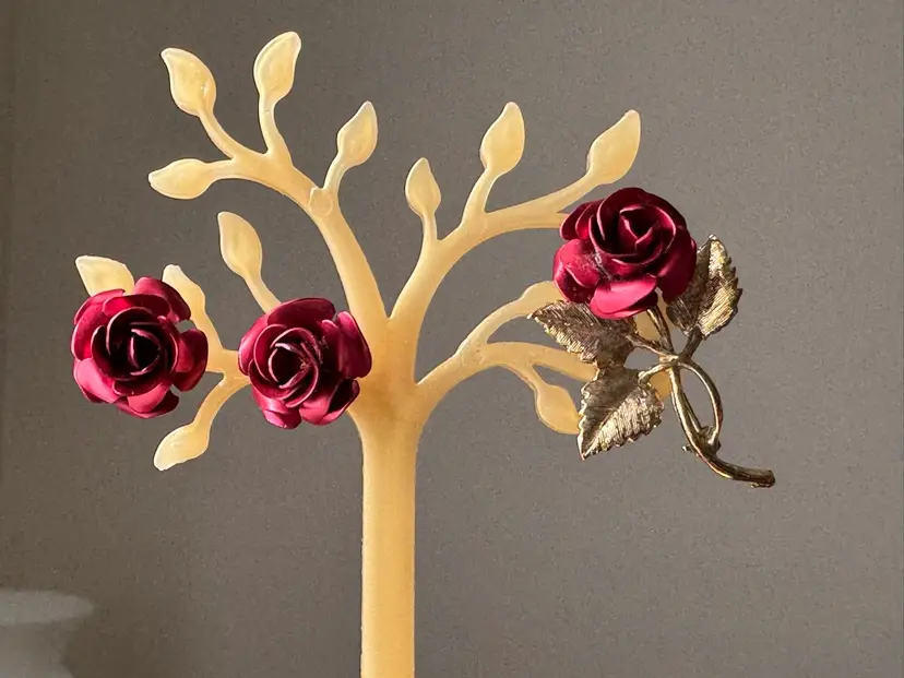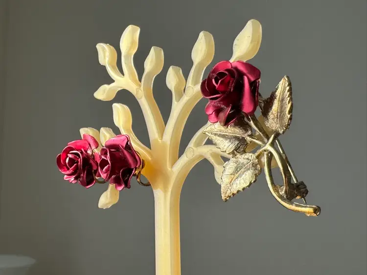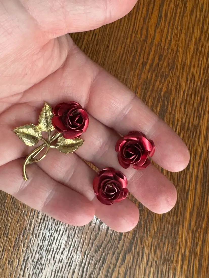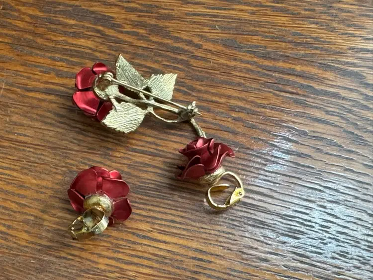 Vintage rose brooch and clip earrings red enamel in gold tone metal