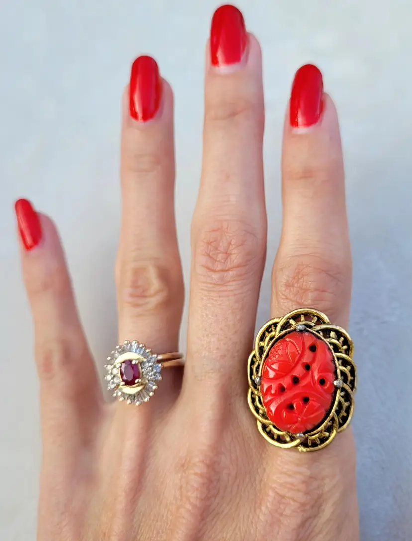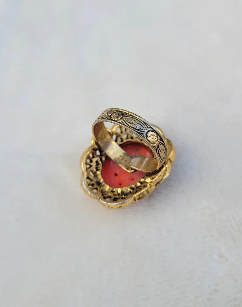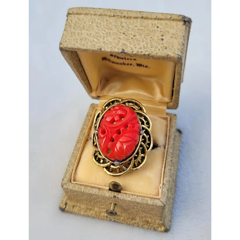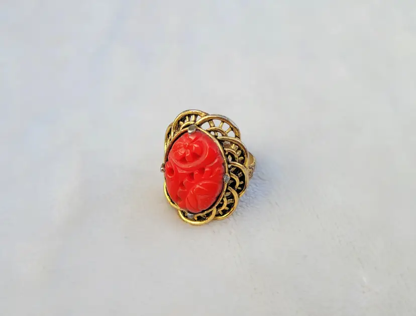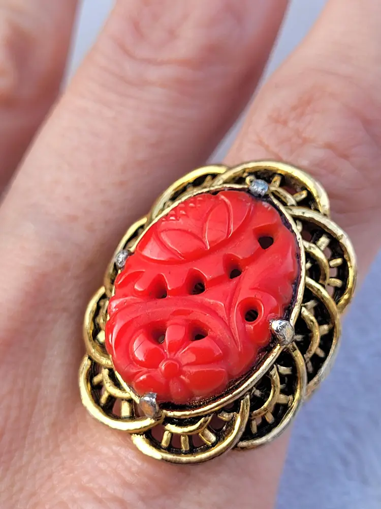 Fabulous huge carved celluloid ring, meant to resemble coral! It's circa 1970s and adjusts between a size 7 and 9. Please see pictures for details, does not include my ring box.