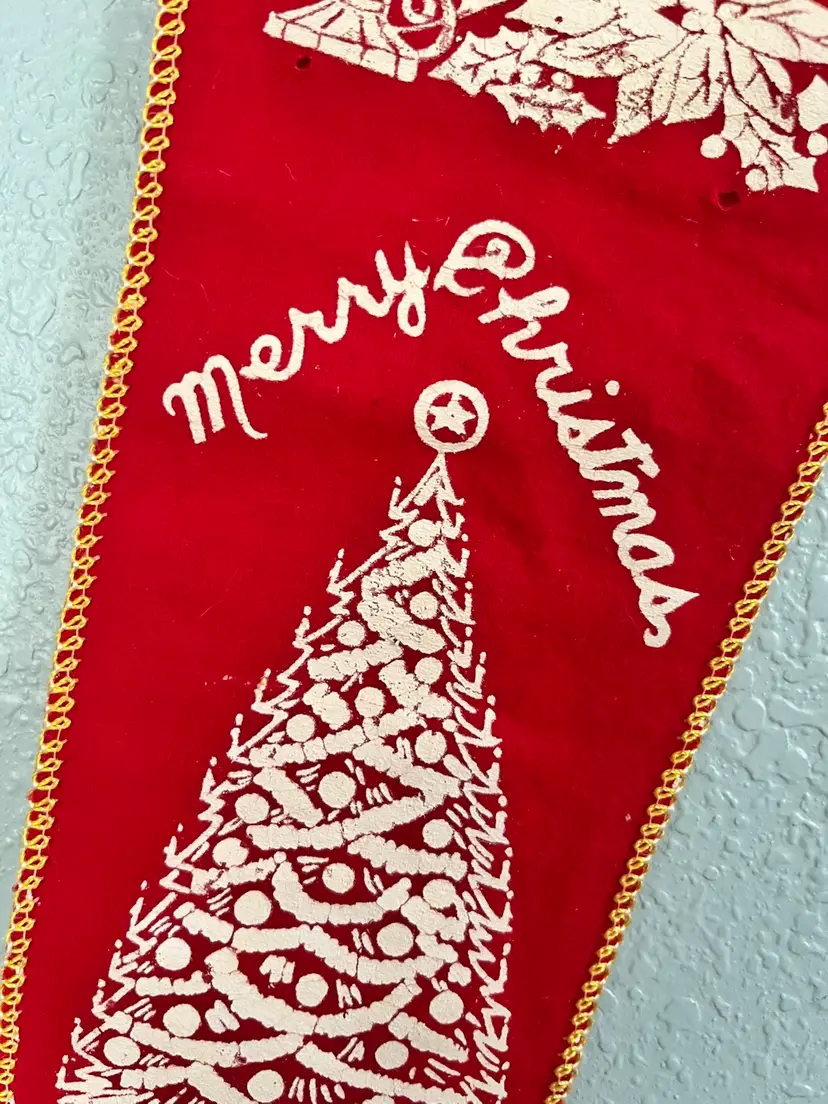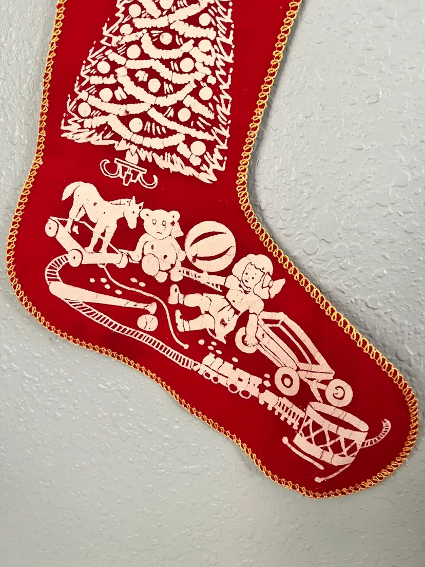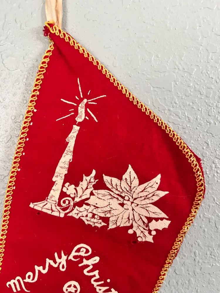 Great old Christmas stocking! Does show some wear from use over the years. There are two small holes on the front. I think these stockings look especially nice in a grouping. Measures approx 15 in long.