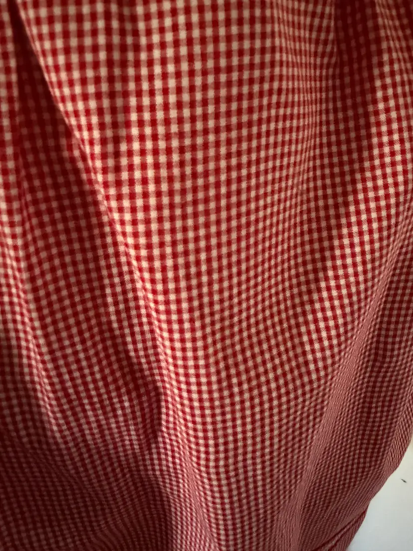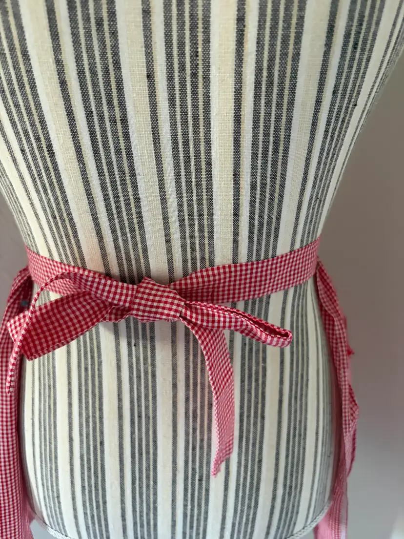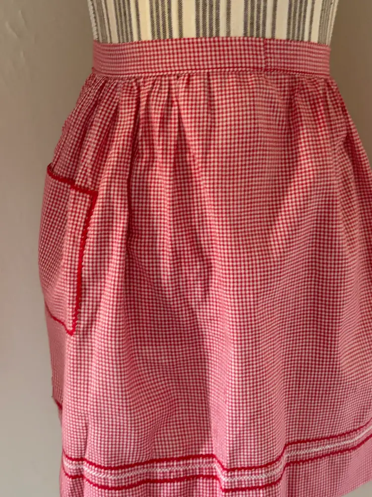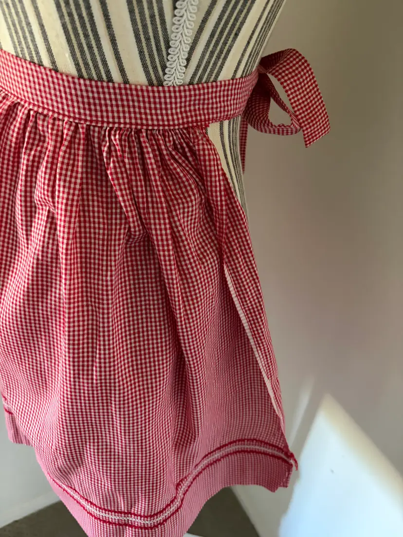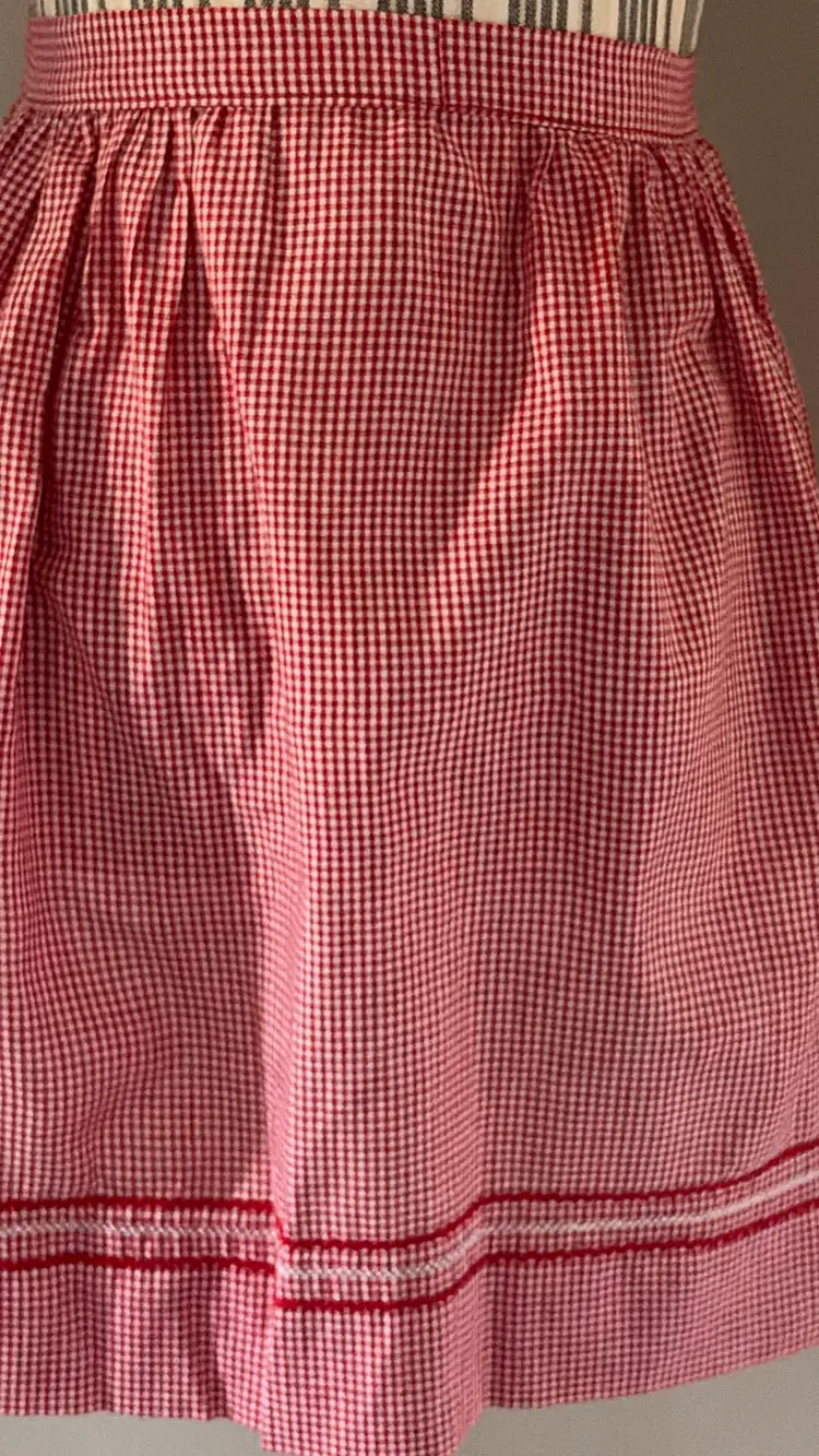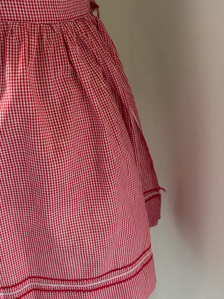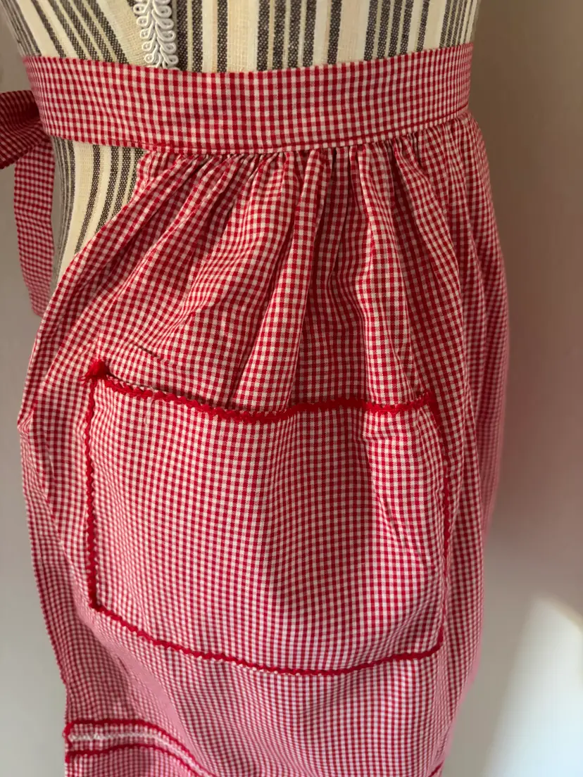 Lovely vintage red gingham apron with Rick Rack detailed large pocket, embroidered embellishments. Large pocket, 55" at the wait (end to end), 17" long.