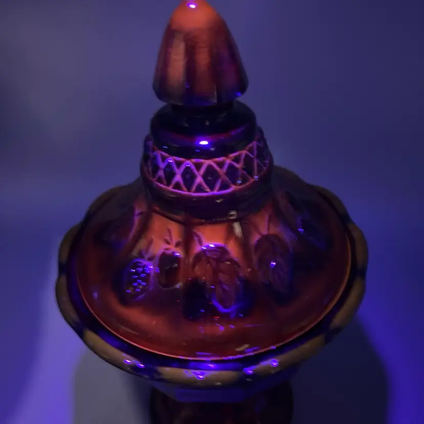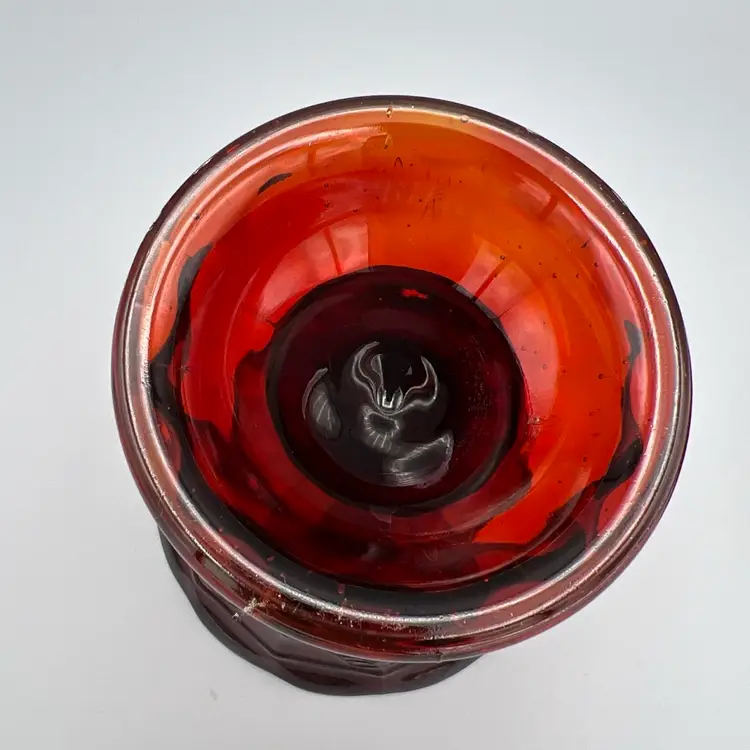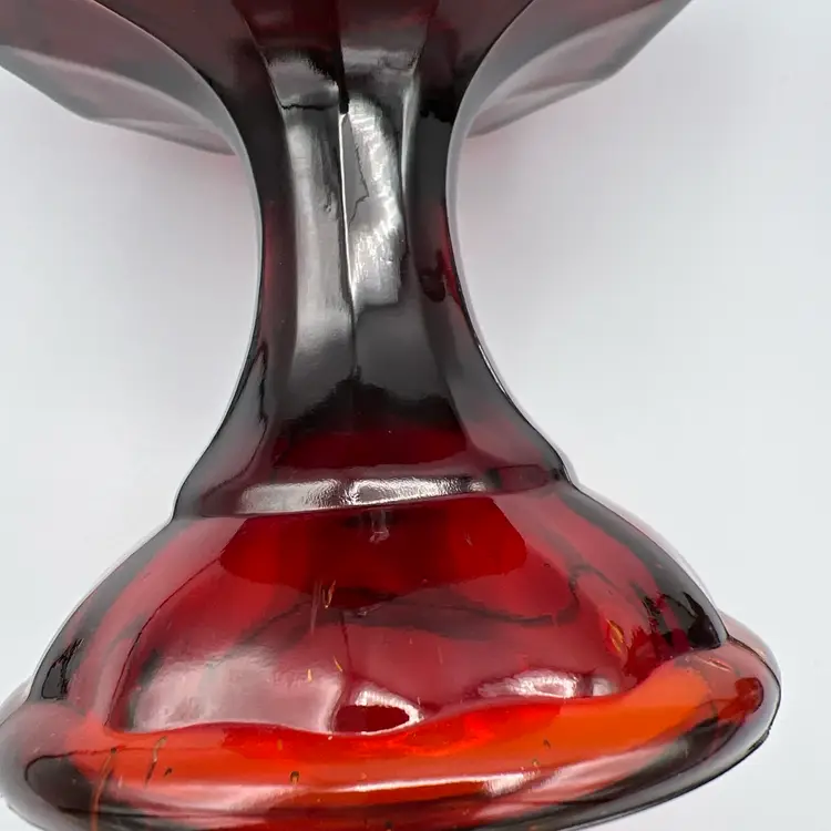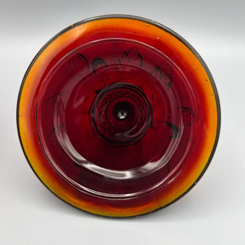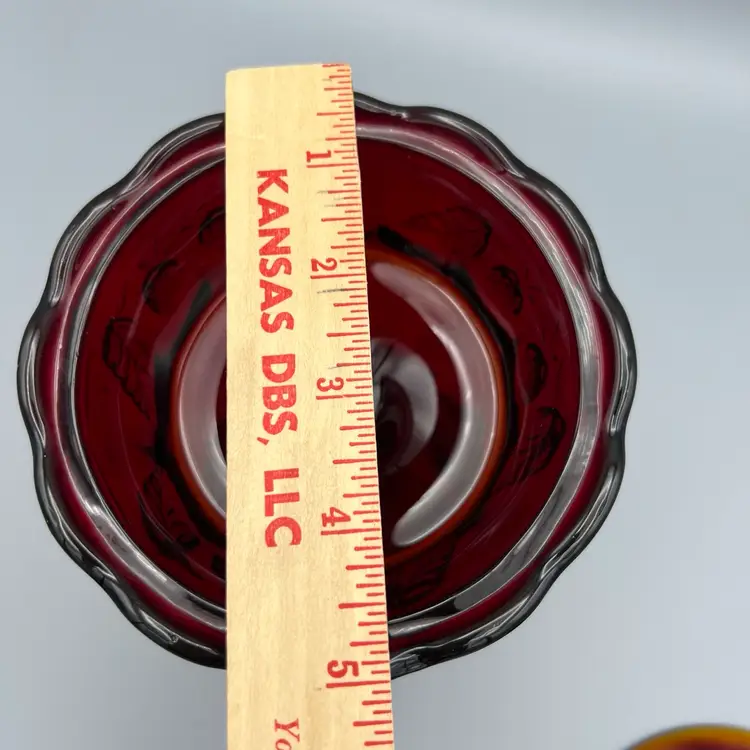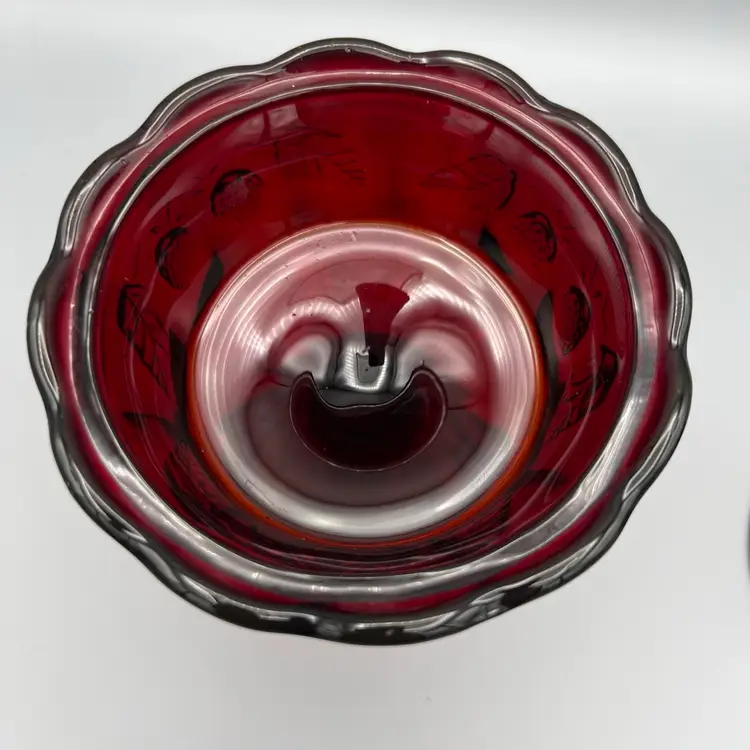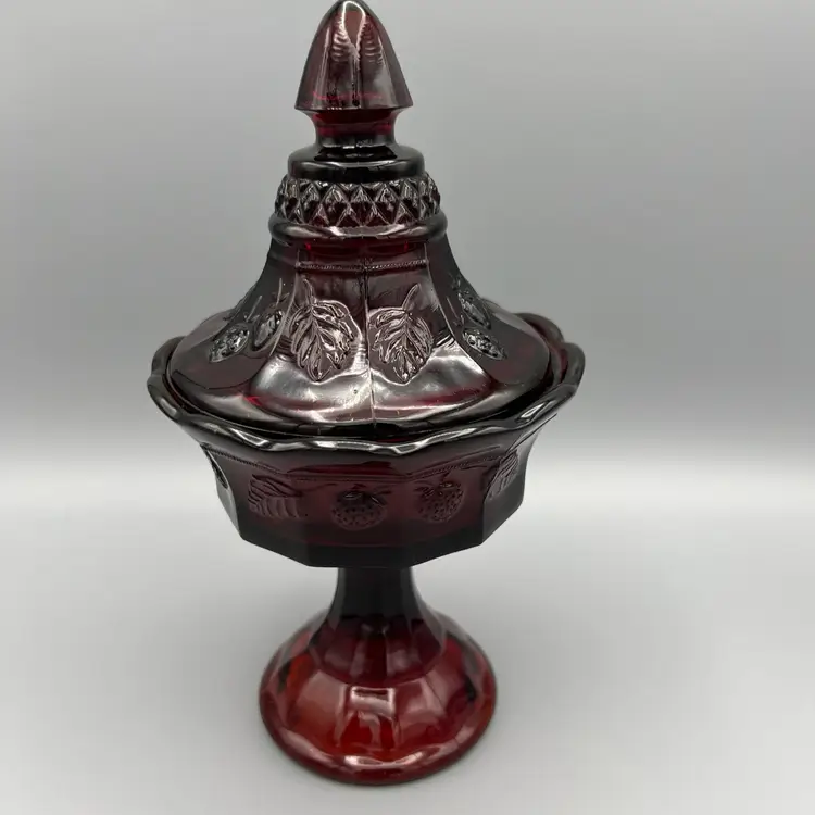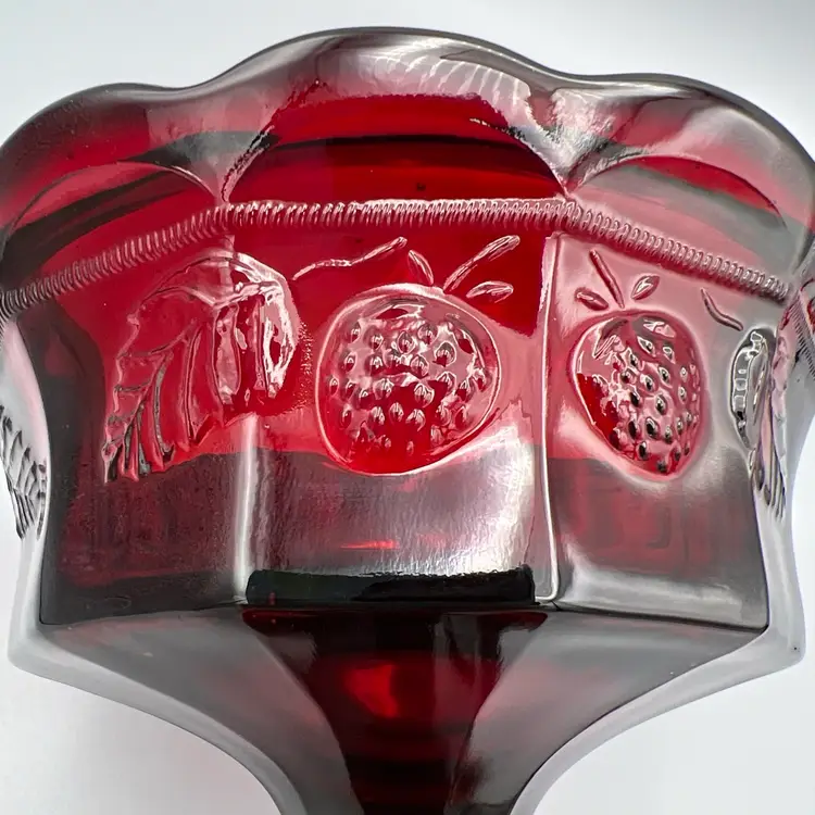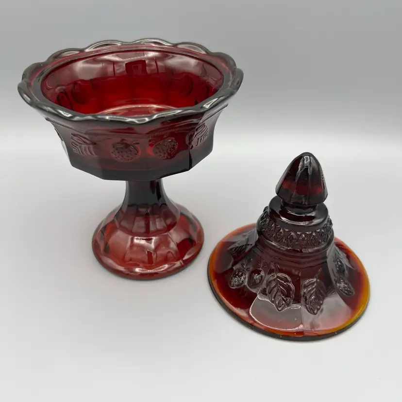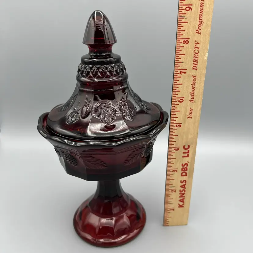This vintage candy dish is a charming addition to any collection. Made of red glass with a glossy finish, it features a strawberry pattern and comes with a lid. The dish has a diameter of 5 inches, a depth of 2 1/2 inches, and stands 9 1/2 inches tall.