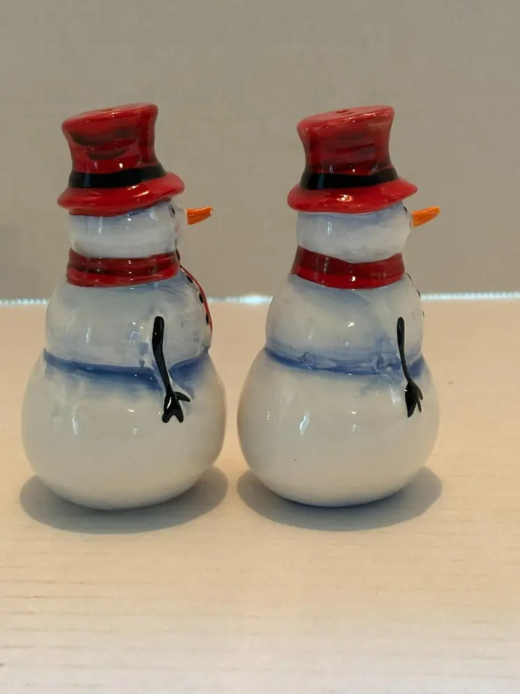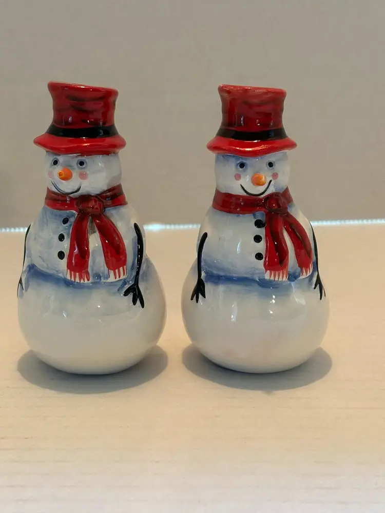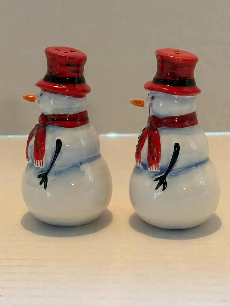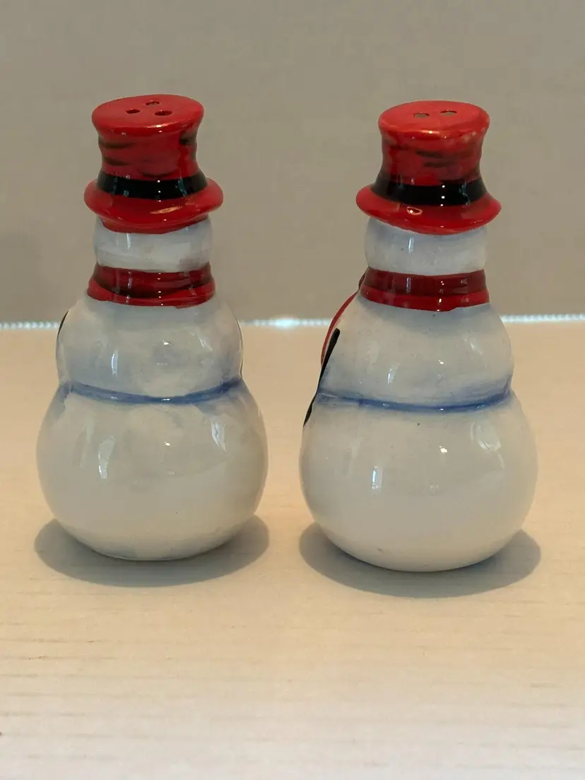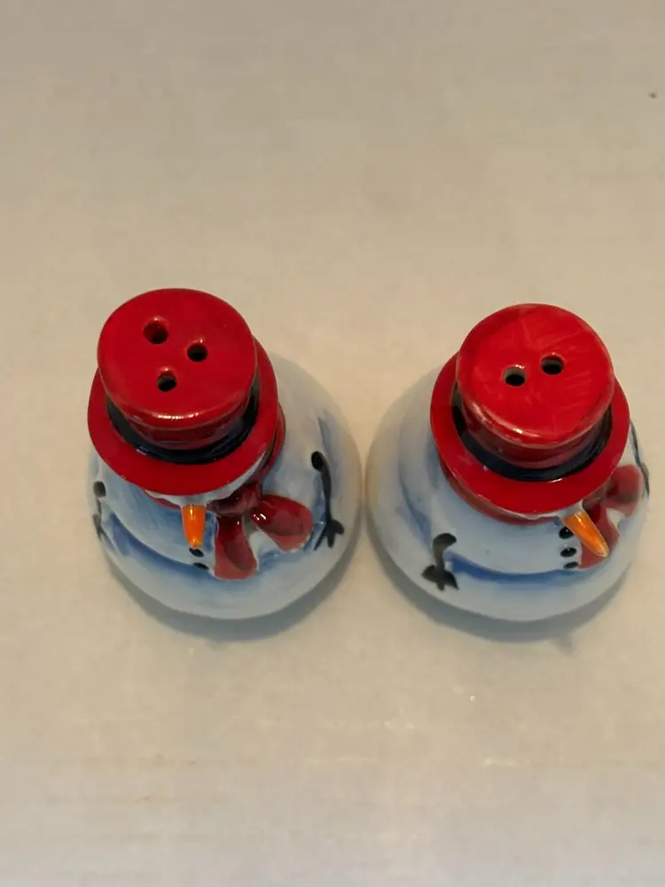 Add a touch of holiday cheer to your kitchen with these vintage red hat snowman salt and pepper shakers. These charming ceramic shakers feature a festive design with snowmen in red hats, perfect for the Christmas season. The set includes two shakers, one for salt and one for pepper, making them a great addition to your dinner table or collectibles collection. Get your hands on these unique snowman shakers and bring a smile to your face this holiday season! RARE with the red hats