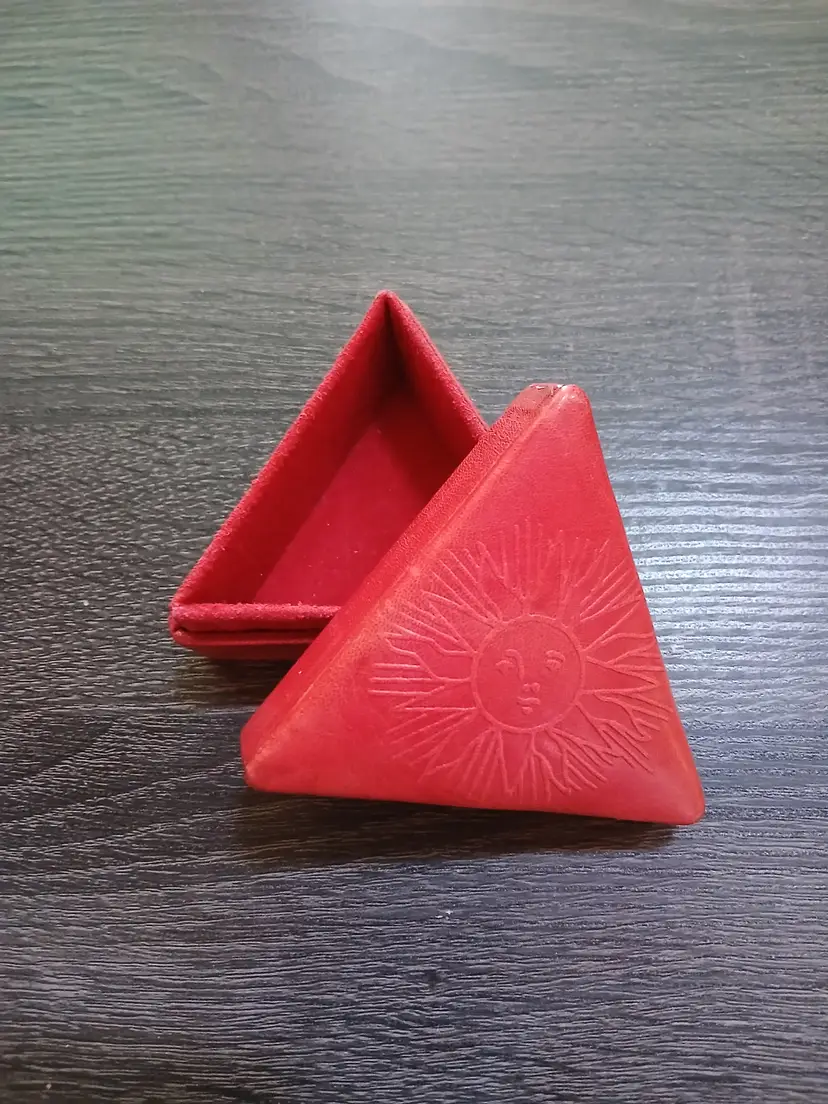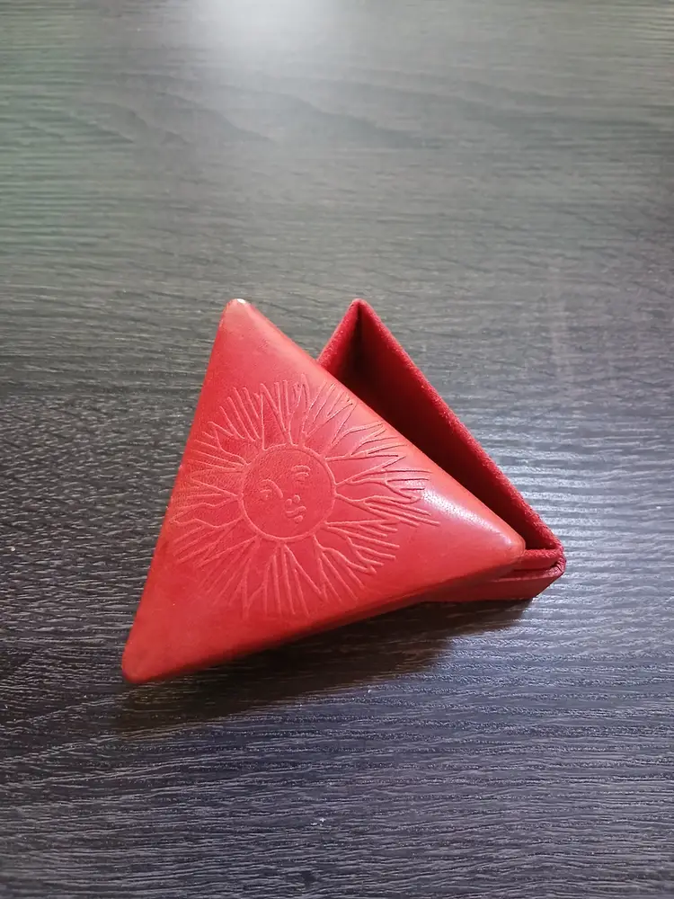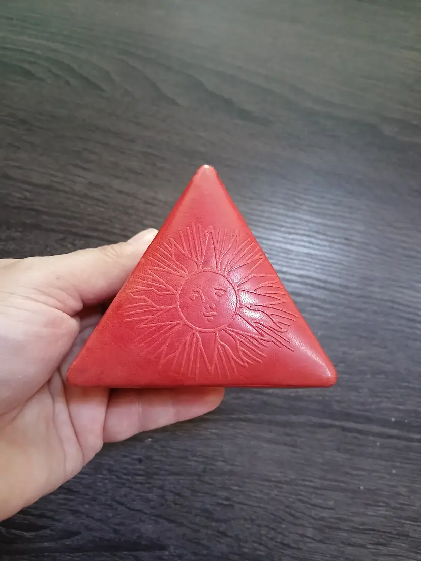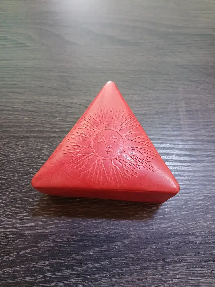 This is a beautiful and unique vintage trinket box. Made of red leather with a celestial sun design on the slightly domed lid. Triangular shaped measuring 3.4" per side x 1.7" high. Perfect size for storing small trinkets or jewelry. In very good pre-owned condition with nice patina. Original sticker on bottom. Made by Aarong BRAC in Bangladesh.