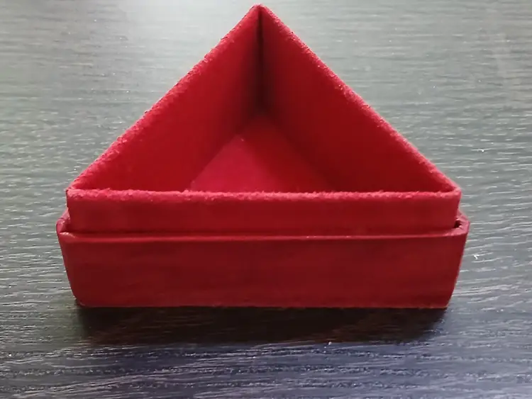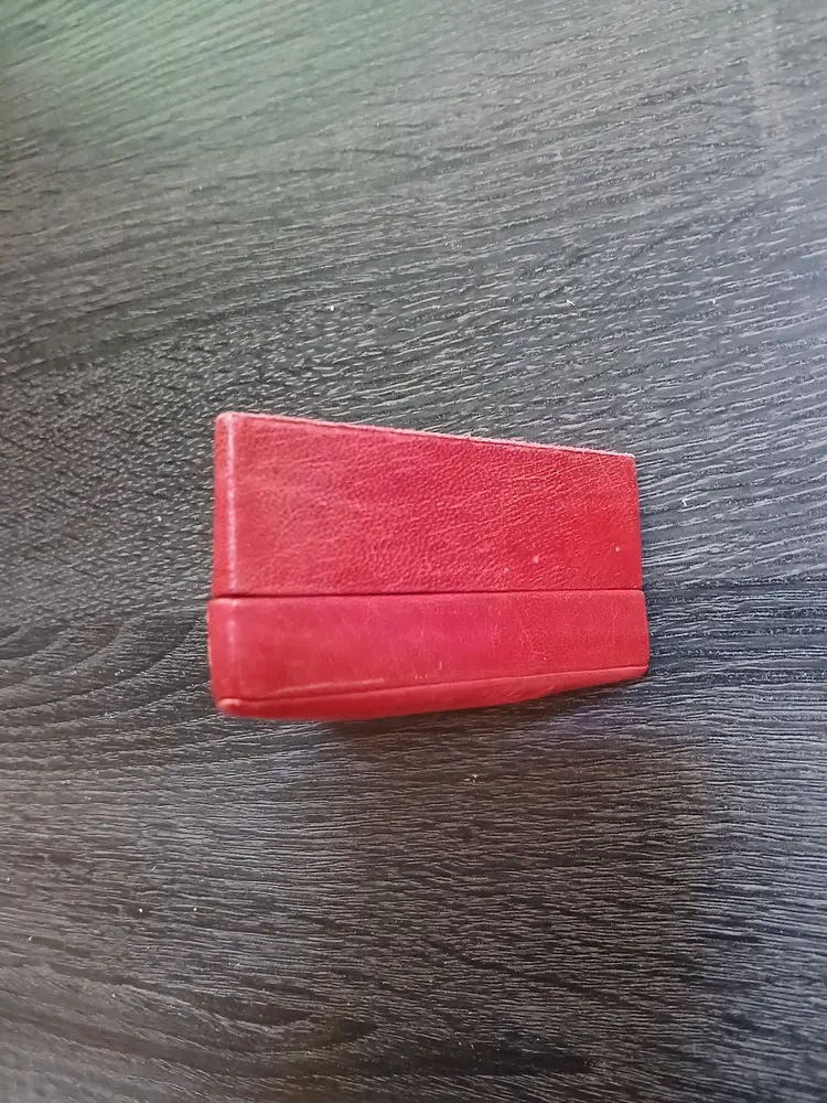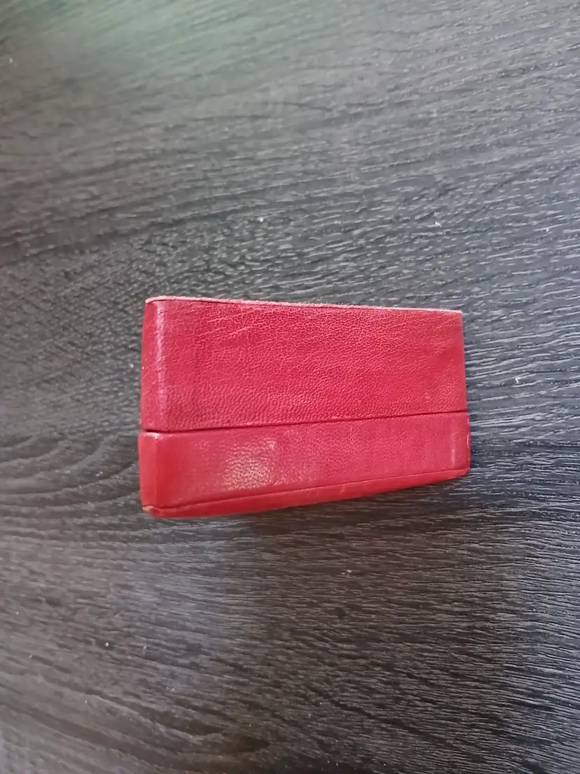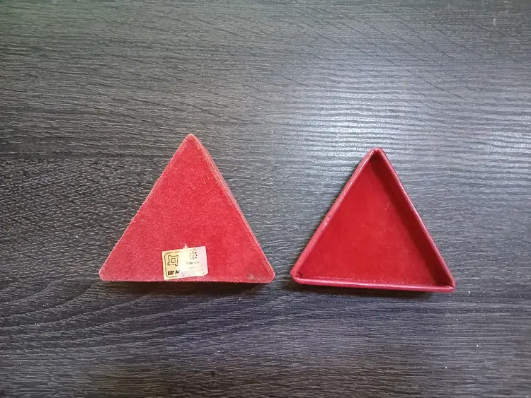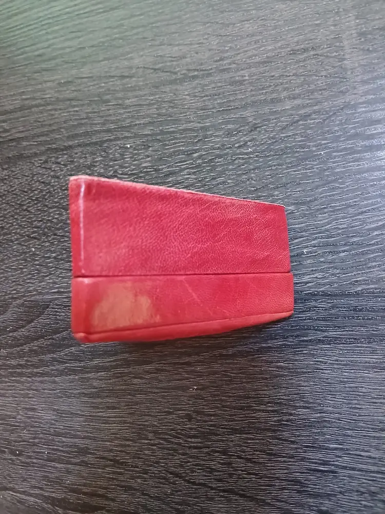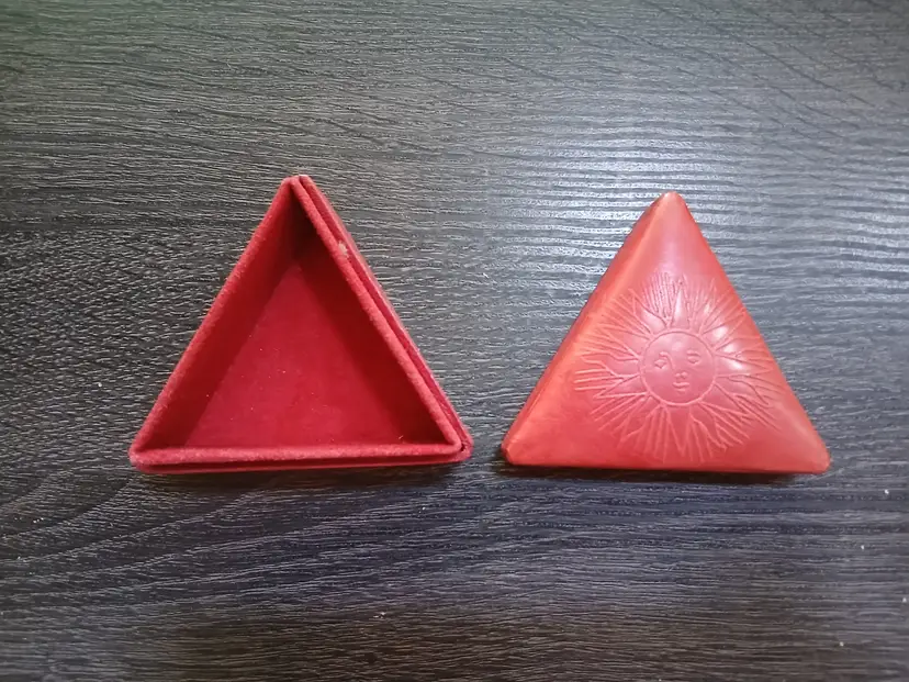 This is a beautiful and unique vintage trinket box. Made of red leather with a celestial sun design on the slightly domed lid. Triangular shaped measuring 3.4" per side x 1.7" high. Perfect size for storing small trinkets or jewelry. In very good pre-owned condition with nice patina. Original sticker on bottom. Made by Aarong BRAC in Bangladesh.