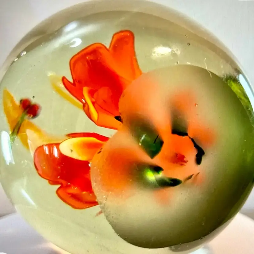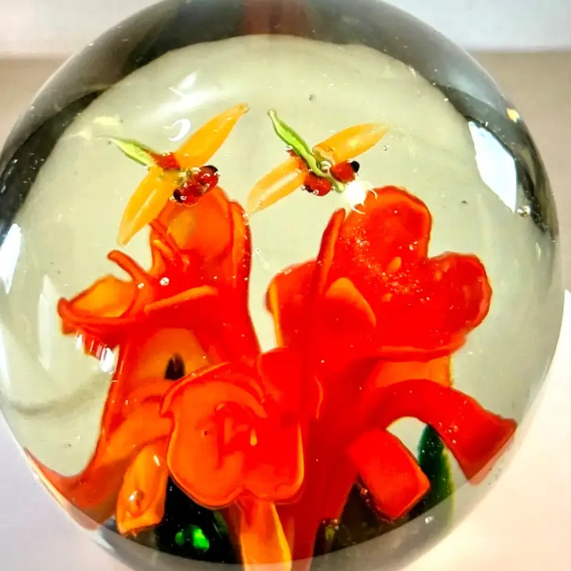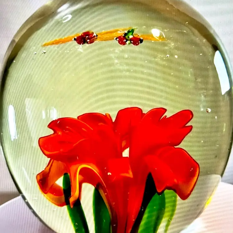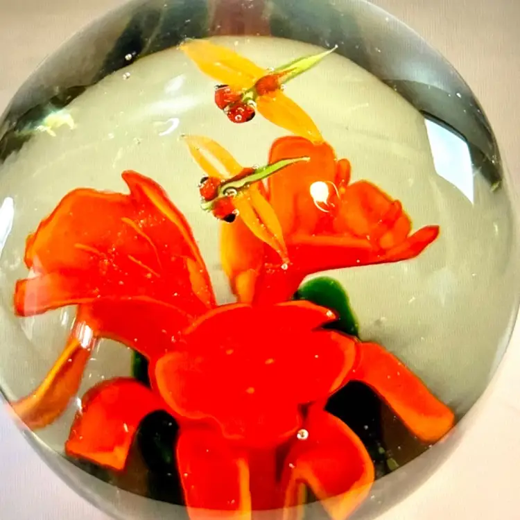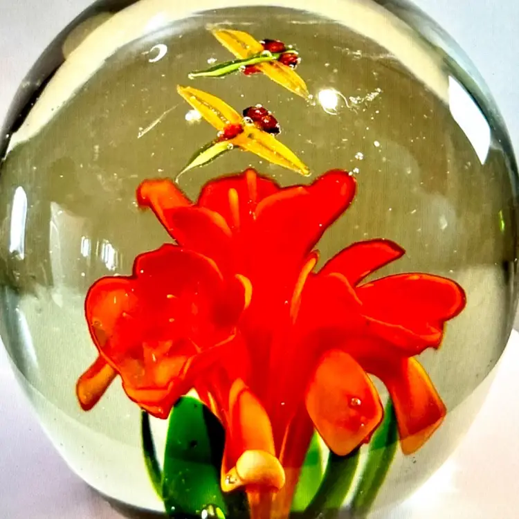 Vintage red lily with colorful dragonflies art glass handcrafted paperweight, unbranded. This stunning paperweight features a beautiful red water lily surrounded by delicate dragonflies. The intricate floral pattern is made of hand-blown glass and has a glossy finish. It is a decorative piece that will add a touch of elegance to any room. The paperweight is an original creation and comes unmarked. Its production style is art glass and it has an impressed backstamp. It is not antique or vintage and its time period of manufacture is unknown. The country/region of manufacture is also unknown. It is a contemporary style paperweight with a floral theme that is perfect for collectors. No cracks or chips. Measures 5.5”. Weighs 2lb. 4oz.