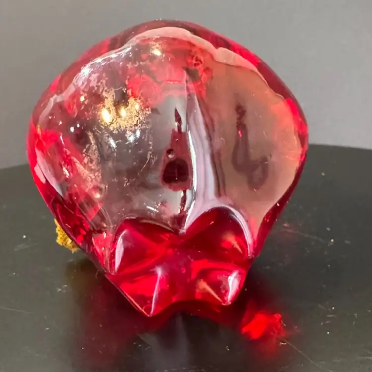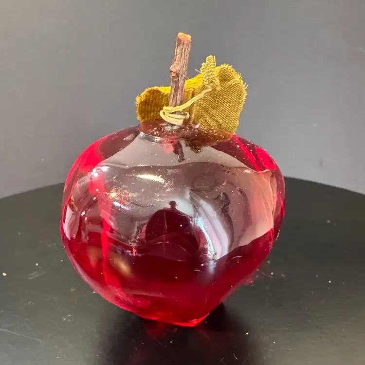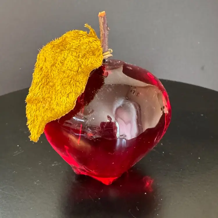 I believe this to be a lucite apple. Mustardy brown velvet like attached leaf and wooden stem. Great vintage condition. Measures a little over 2 inches tall.