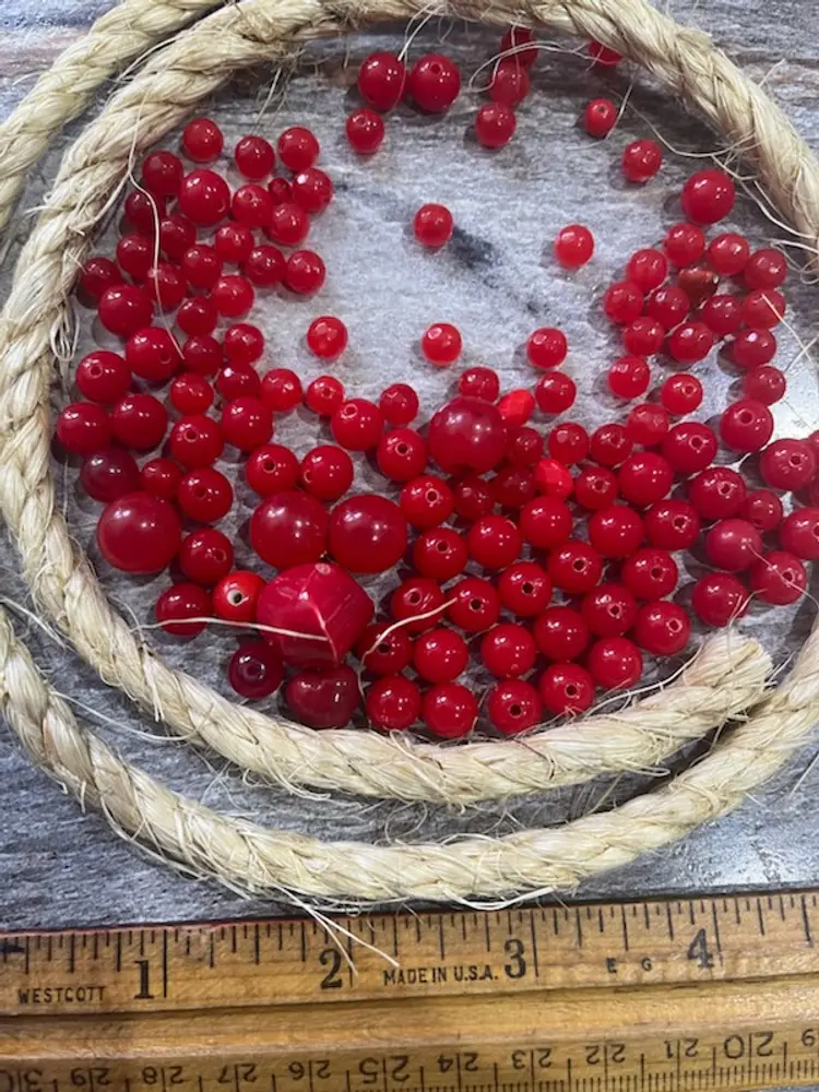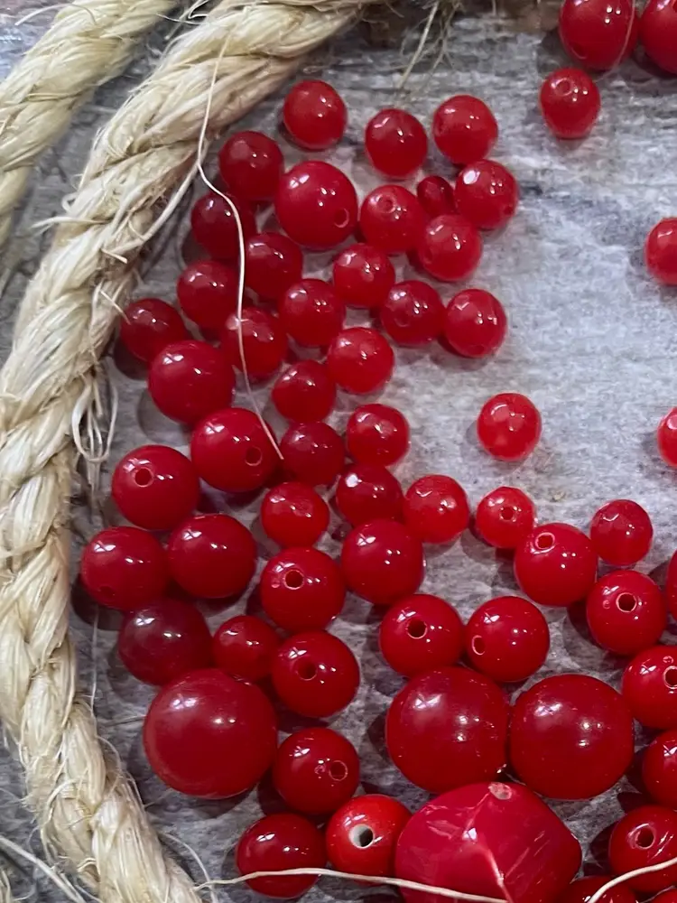 A mix of vintage red plastic beads. Assorted sizes as shown in the photos.
