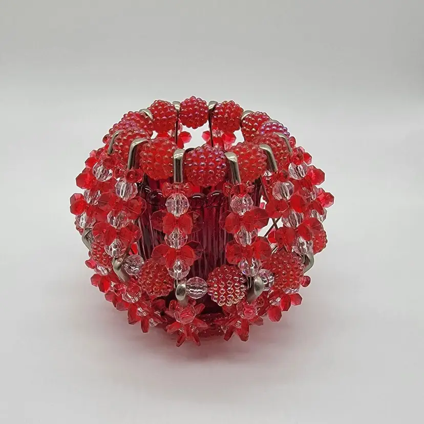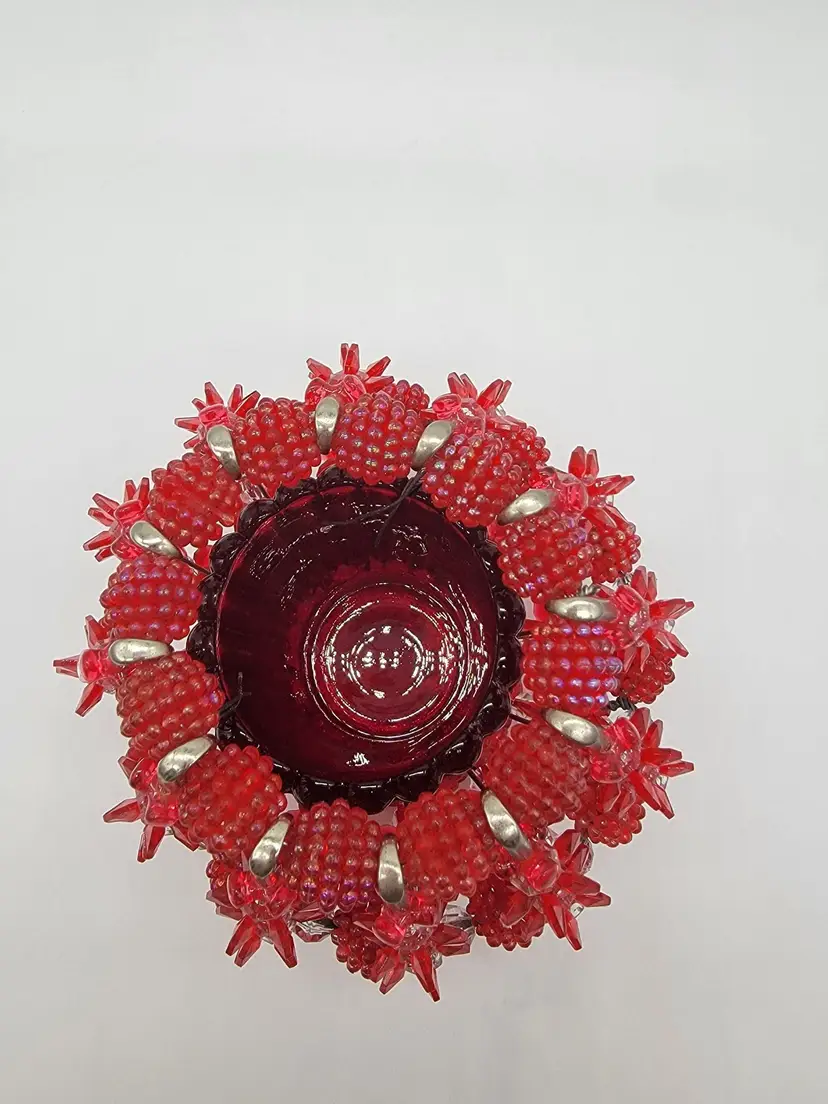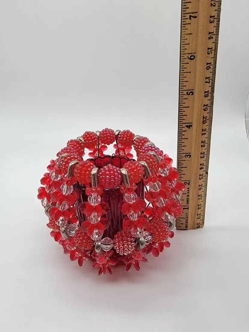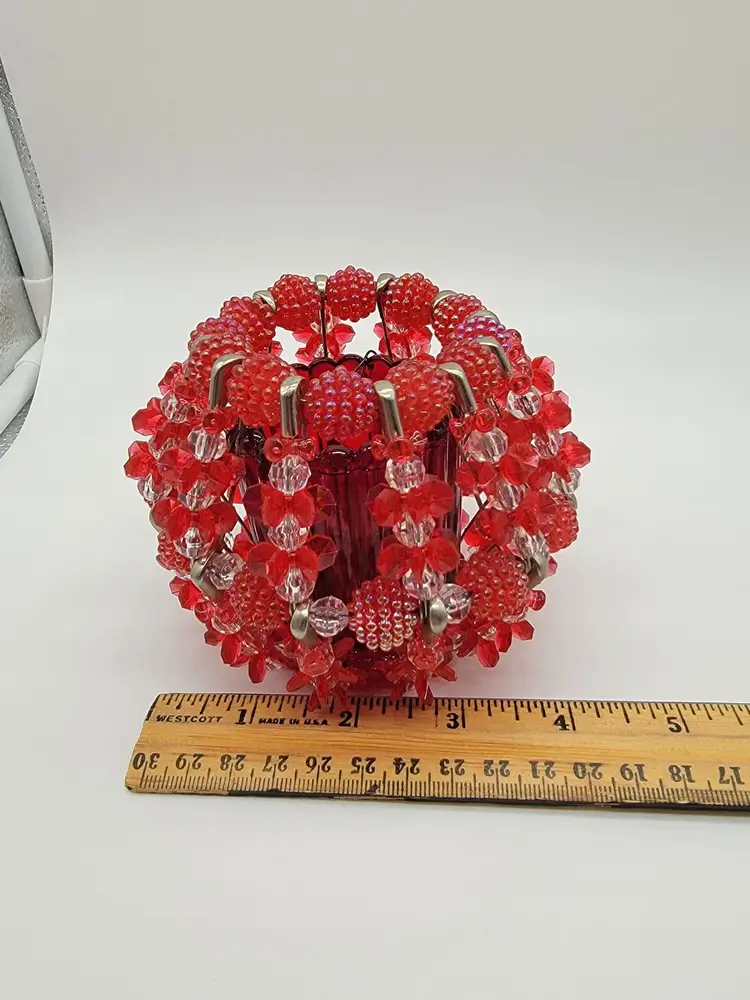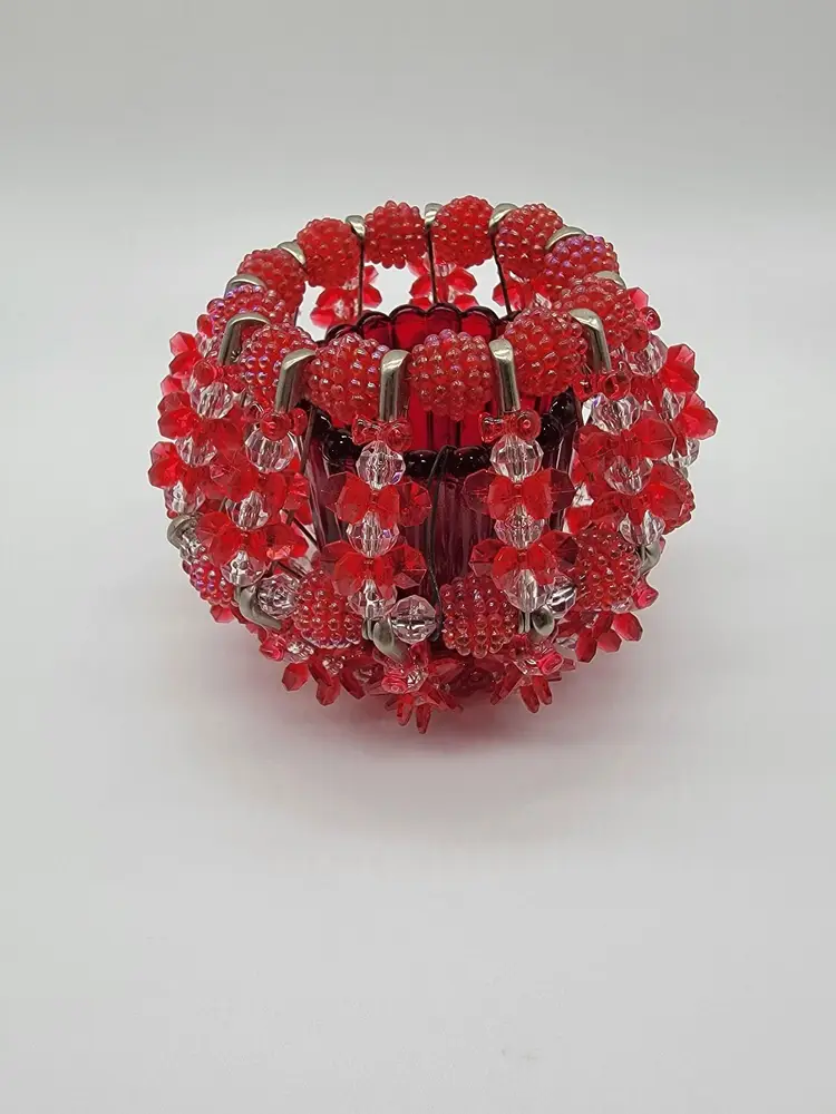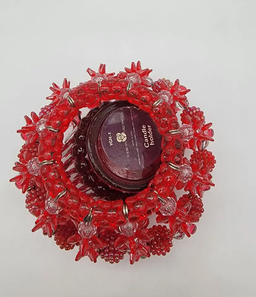 Vintage safety pin art candle holder in red and clear beads. There is a glass votive holder wired to the holder.