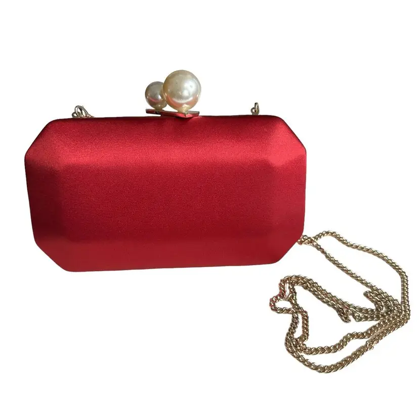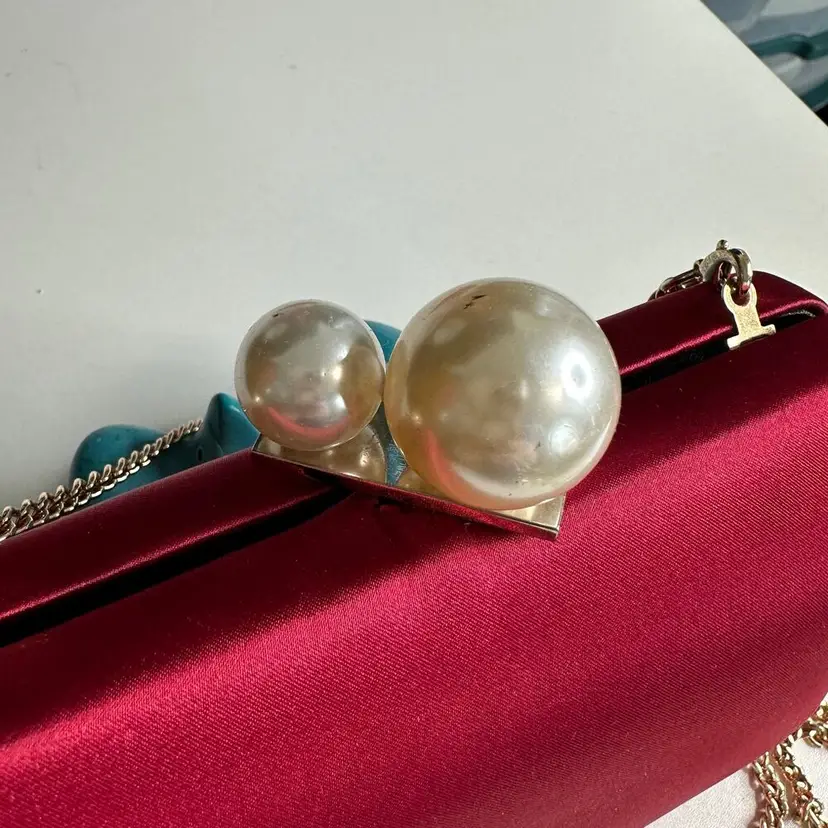 Vintage Red Stain Small Crossbody Purse Large Pearl Clasp Red / marron Thin gold chain Clasp is unique two large faux pearls Vintage 80s 90s Condition - excellent outside and inside, the clasp is a twist it can be slightly finicky be delicate, works fine Super unique and rare fashionable small bag rectangle/octagon shape 7 inches wide 4.5 inches high/deep