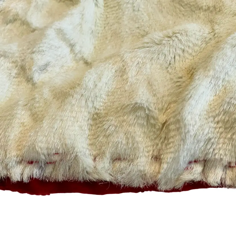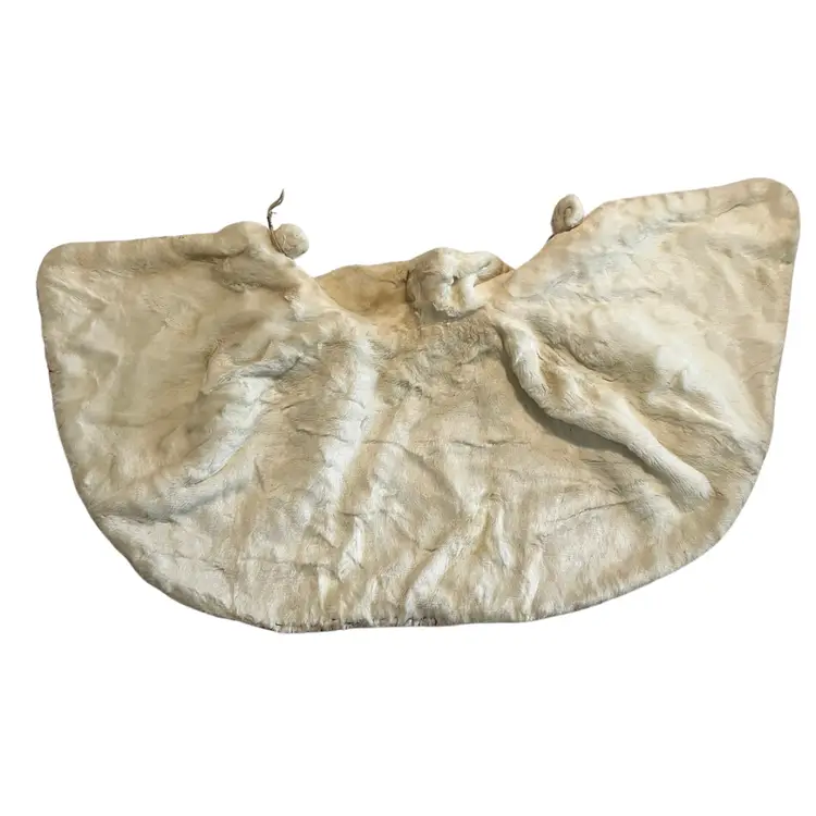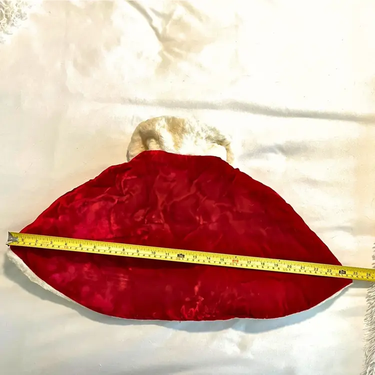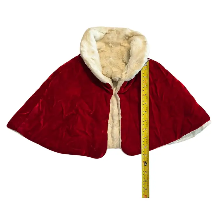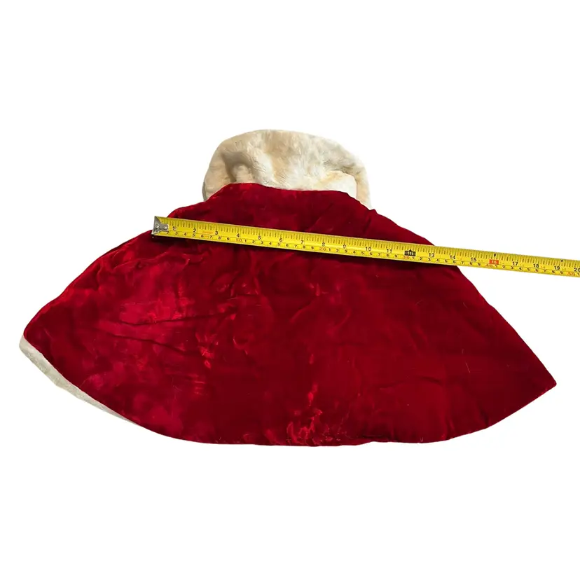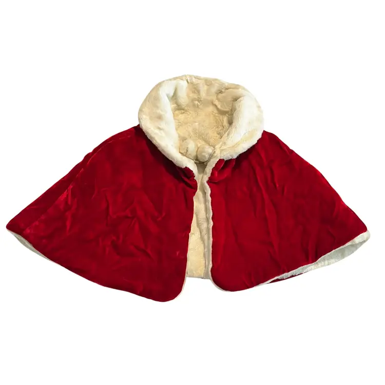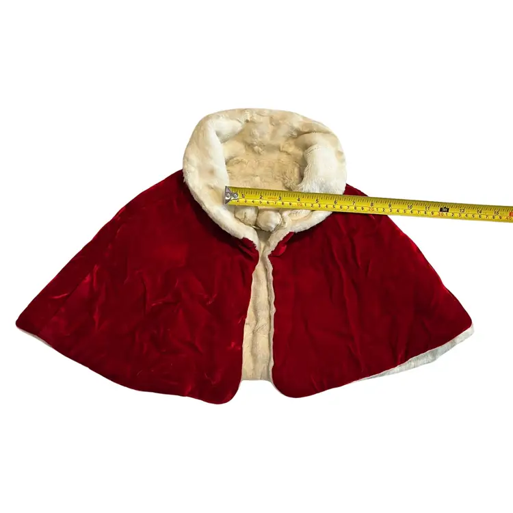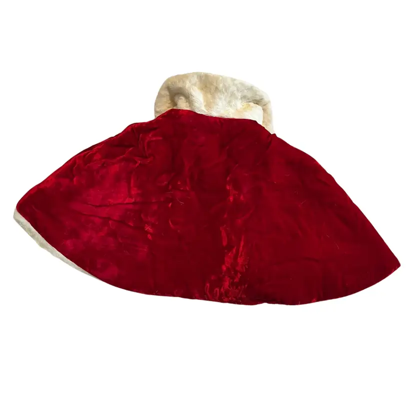 Outer: Red Velvet Lining: Cream faux fur Era: 1950s Closure: Pom-pom loop closure at the neck Size: Toddler or doll-sized Origin: Handmade (visible hand-stitching) Use: Christmas photos, holiday decor, vintage costume display, or for a doll
