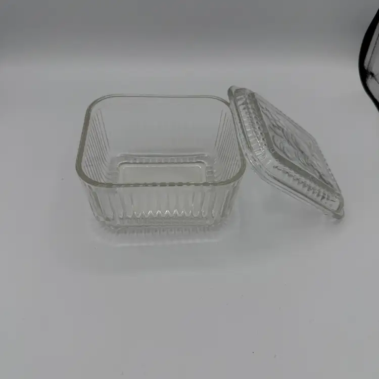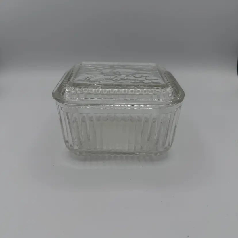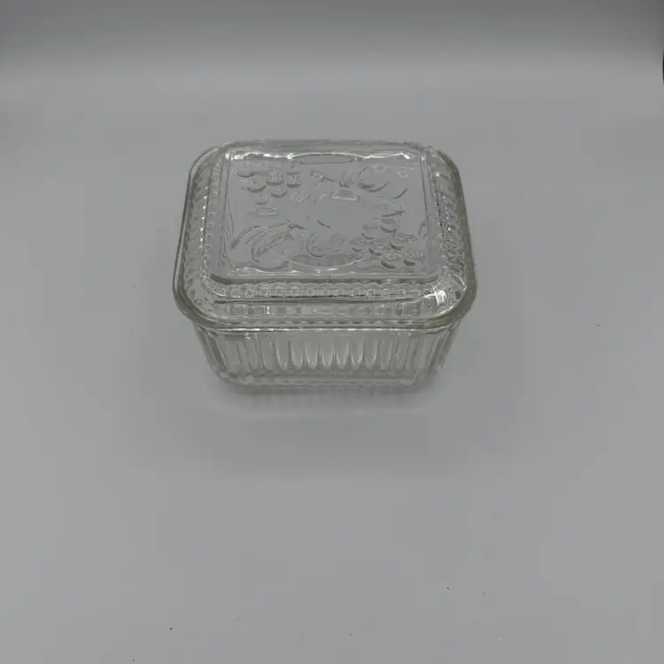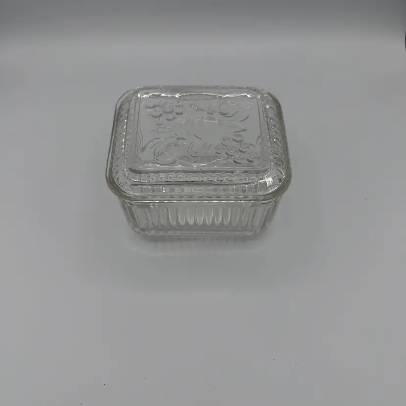 Vintage Clear Glass Refrigerator Dish With Lid Featuring Embossed Fruit Design on Lid. Has Ribbed Sides. Good Vintage Condition. No Chips/Cracks. 5" X 4 1/2"