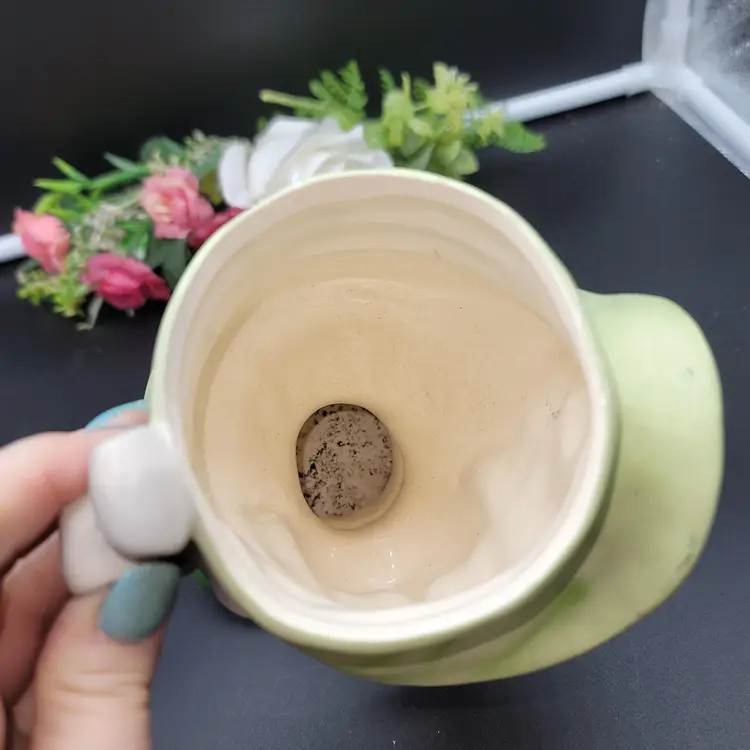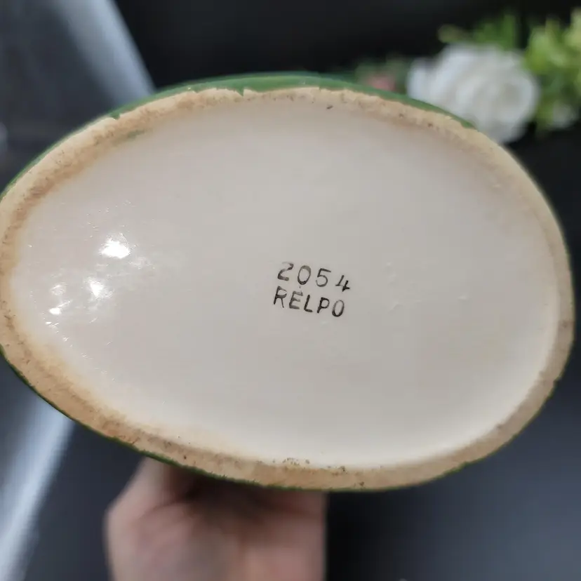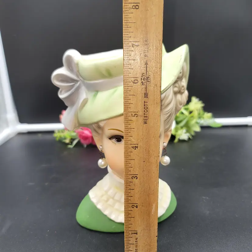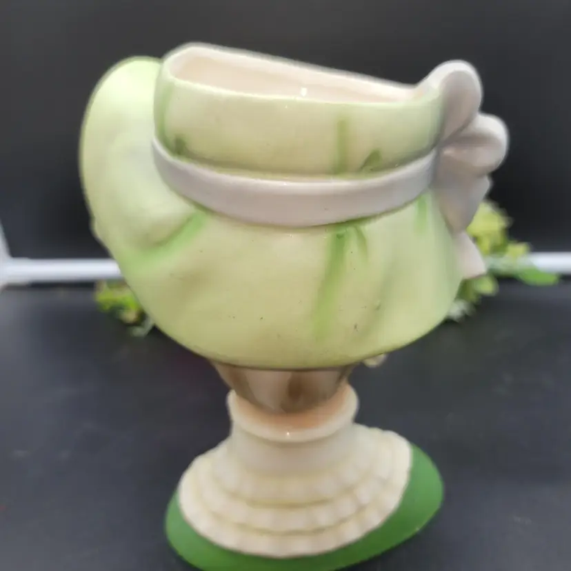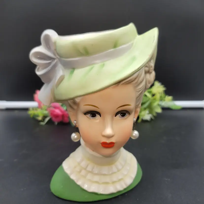 Charming lady head vase featuring a stylish green hat and pearl earrings. Perfect for adding a touch of vintage elegance to your decor. No visible damage.