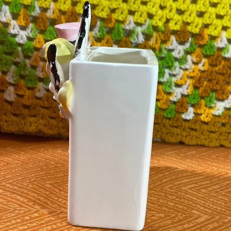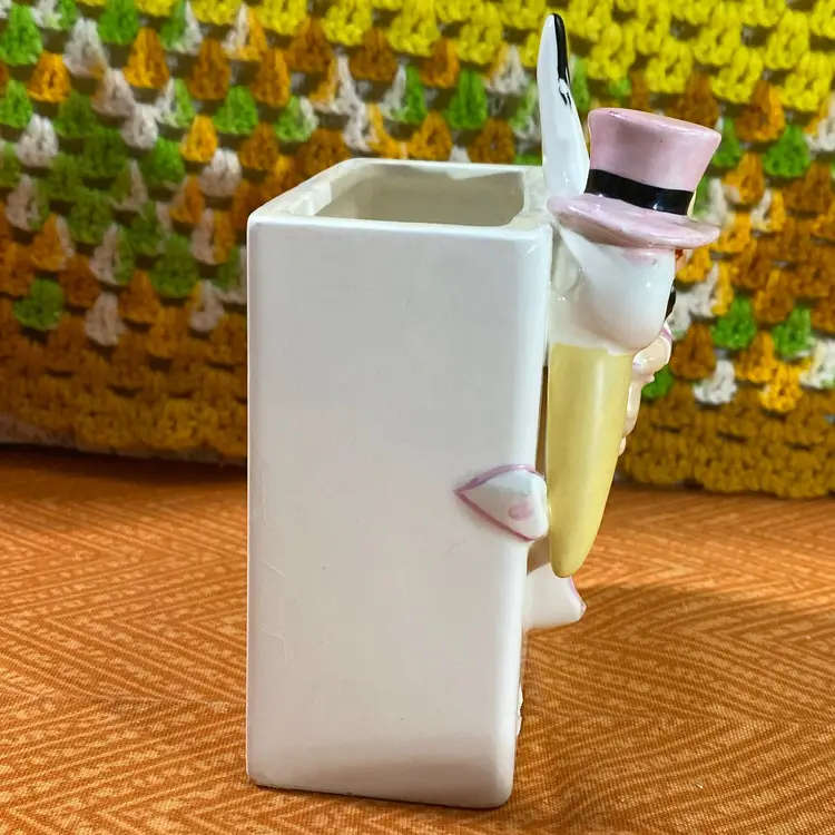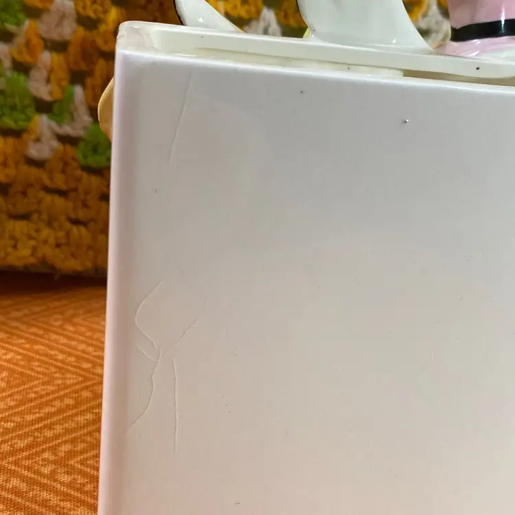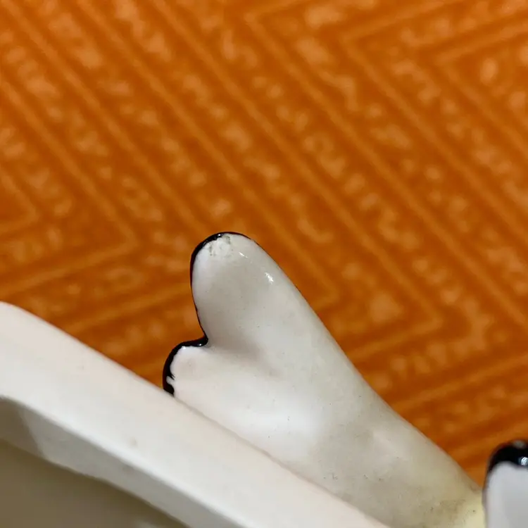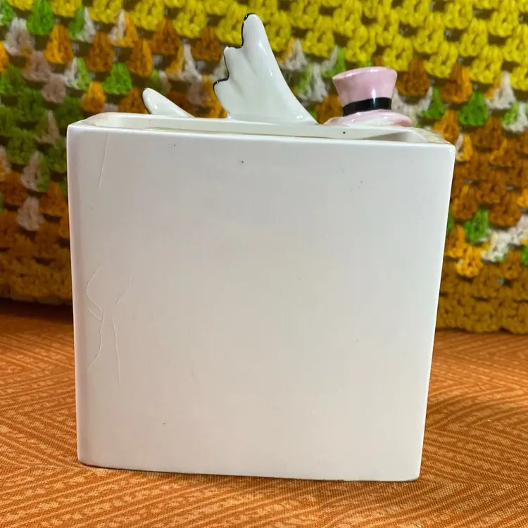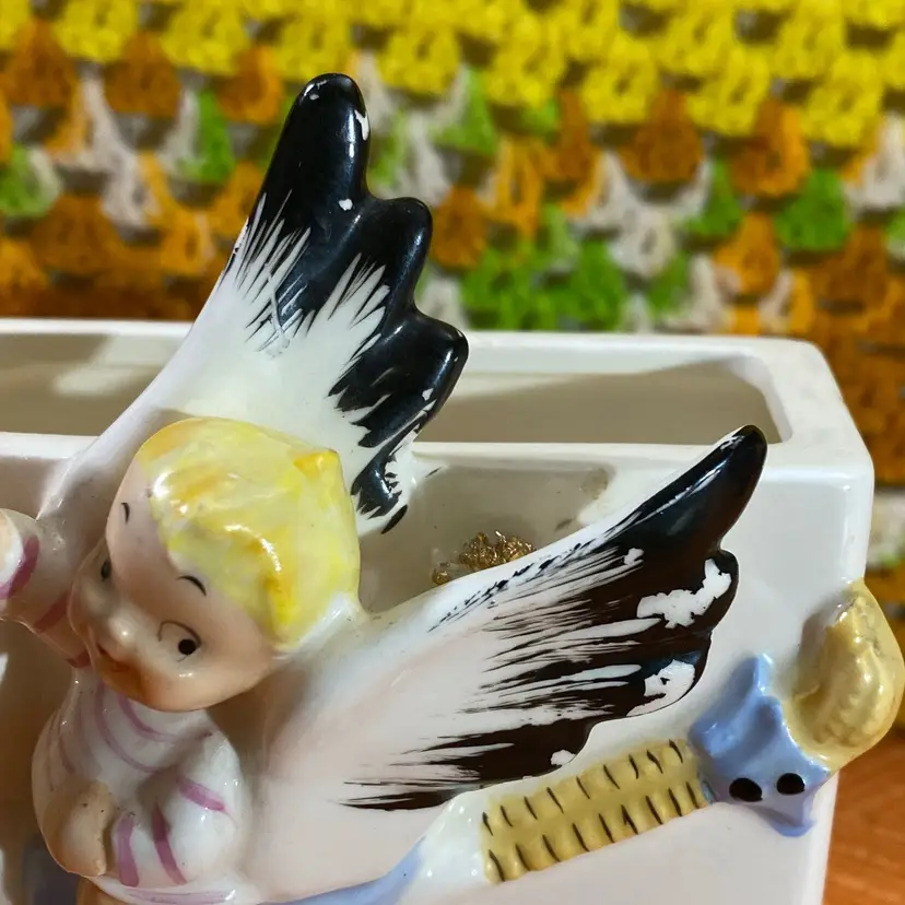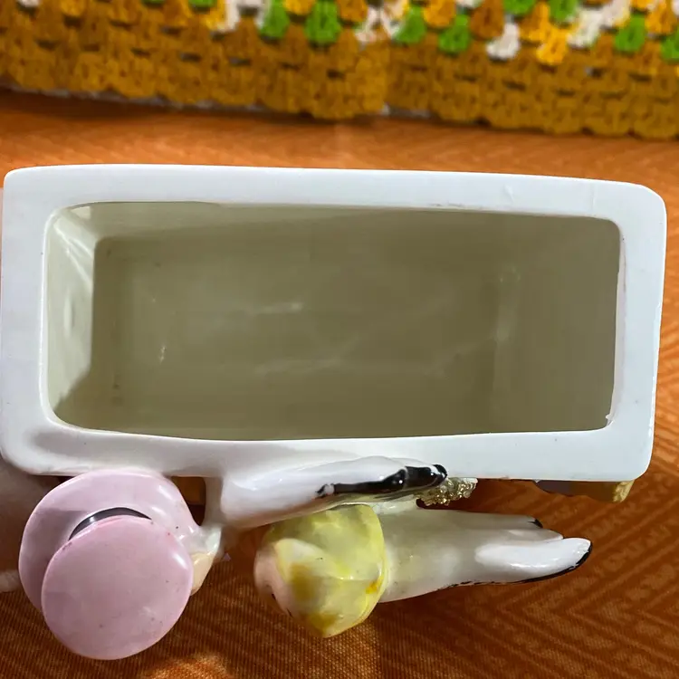 Size: 5 3/4” x 4 1/2” Condition: there are some crazing lines in a few spots as shown in photos. Some black cold paint loss at wings. Flea bite at the back tip of one wing. Couple dark spots in the inside corner of planter. Please see photos as they are a part of my description.