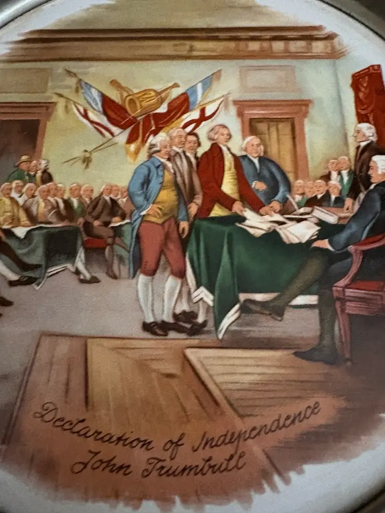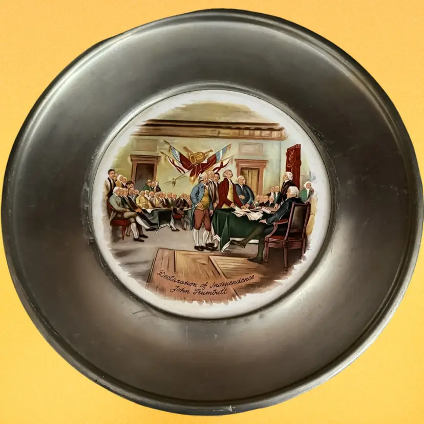 Vintage replica of American John Trumbull’s “Declaration of Independence" on this round ceramic tile encased in a pewter plate.