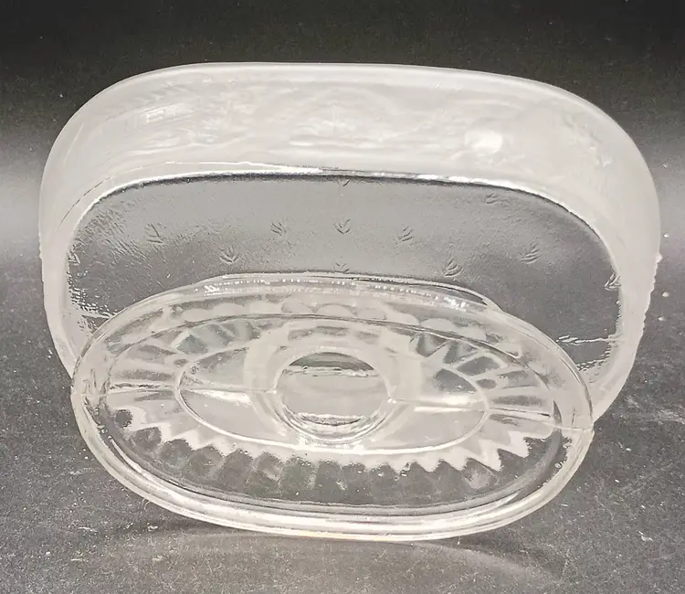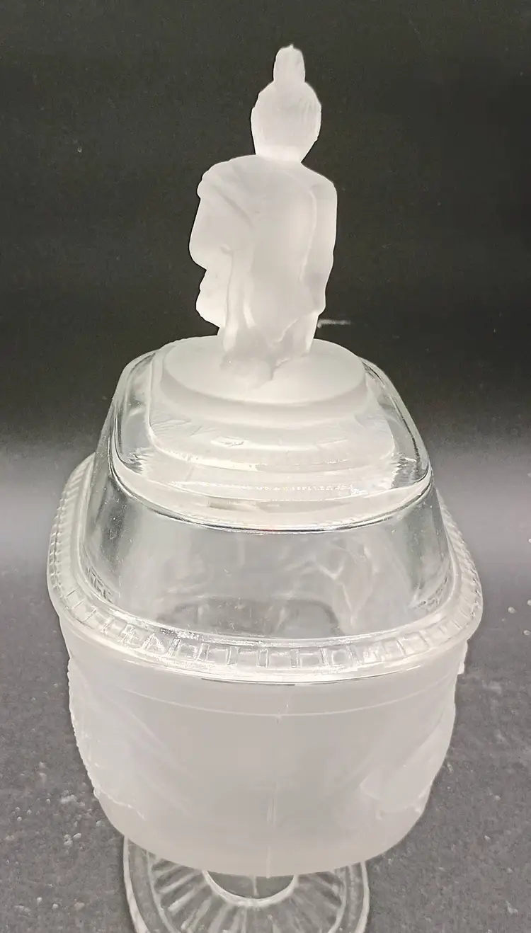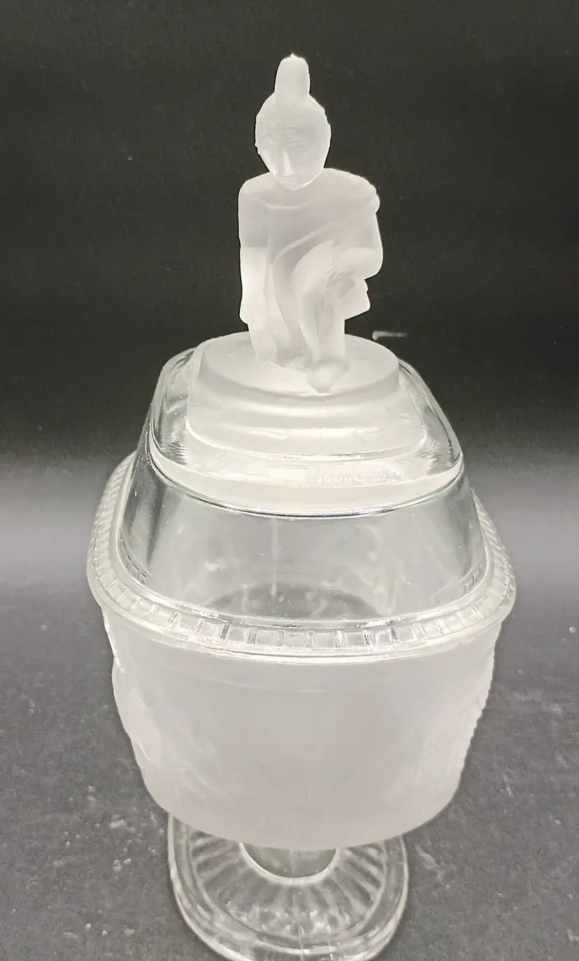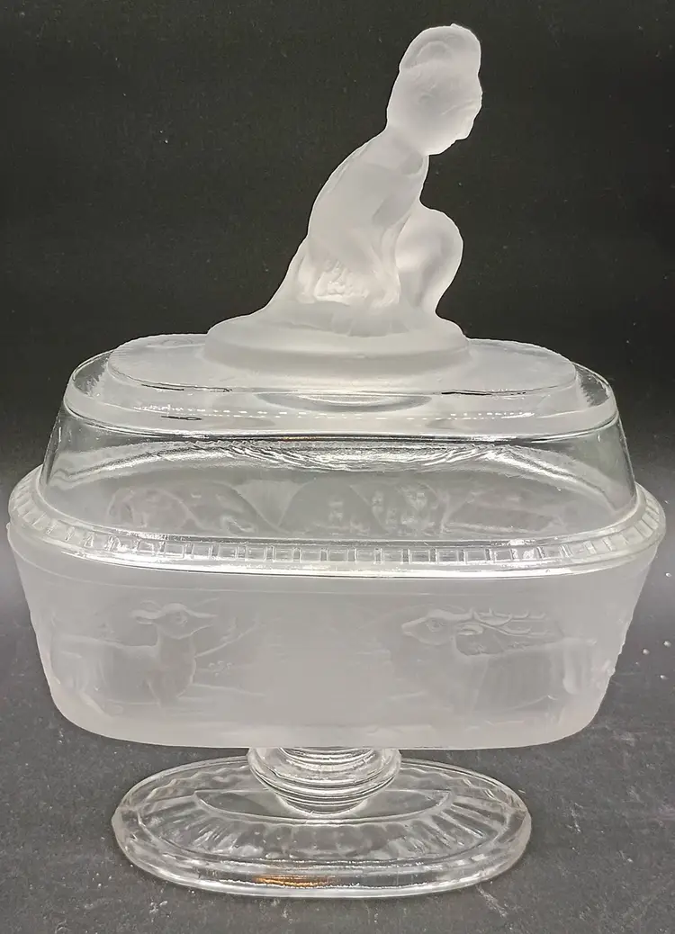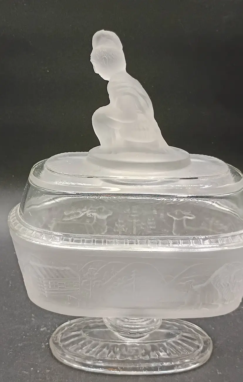 This is must likely a vintage reproduction of Westward Ho by Gillander & Sons Oval Covered Compote Candy Dish originally made in 1879 is a beautifully crafted piece of pressed glass from the Early American Pressed Glass/EAPC Molds product line. This set includes two compartments, perfect for serving candies or other snacks. The oval shape and clear color add a touch of elegance to any dining table or decorative display. Made of high-quality glass, this vintage dish is a unique and charming addition to any collection of pottery and glass items. The Bottom of the compote has western scenes- cabin, Bison and Deer Approx Measurements: 9 1/2 tall x 7 x 4