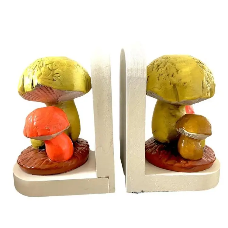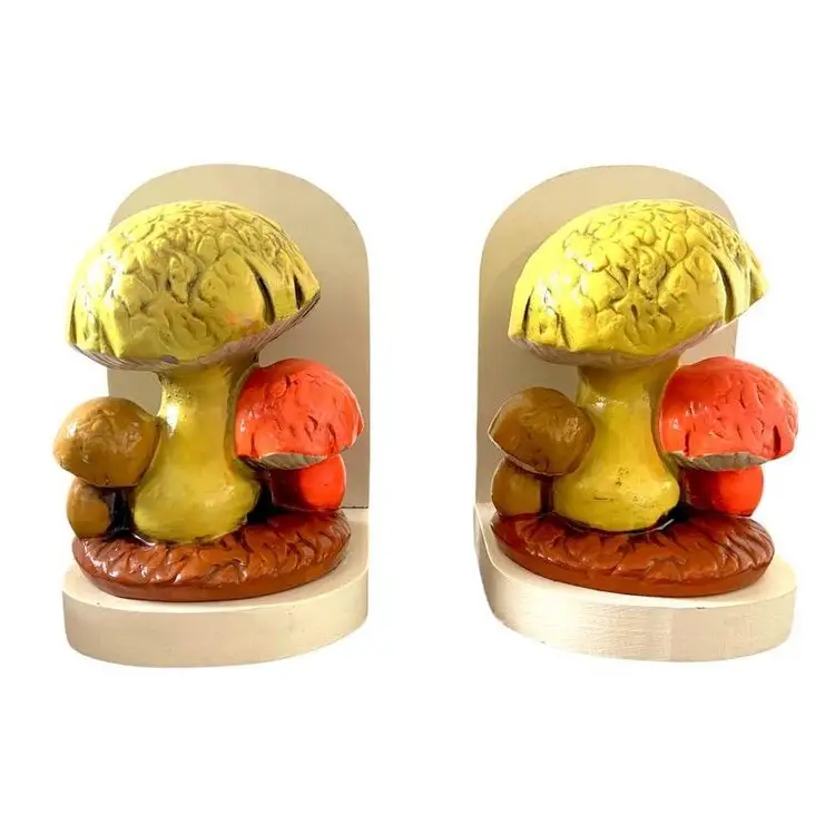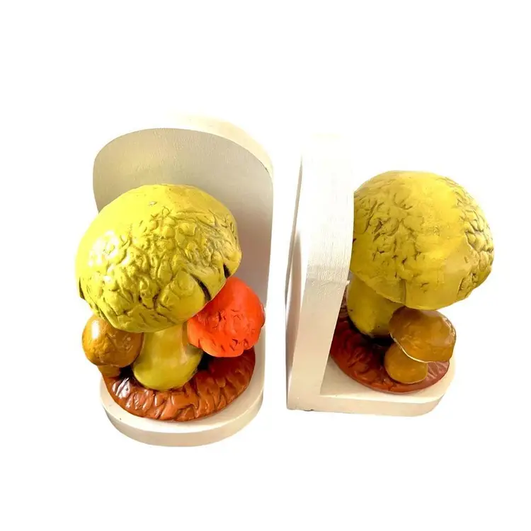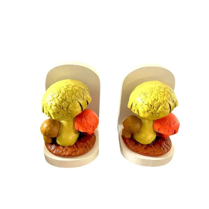 This set of bookends are likely from the 1970's. The orange mushroom glows under black light. One of the bookend's back is a little loose. Good vintage condition, some paint chipping