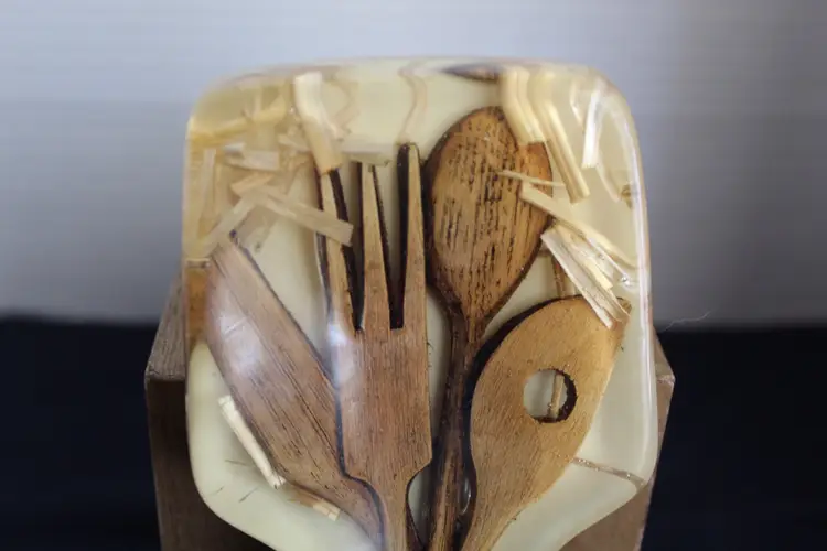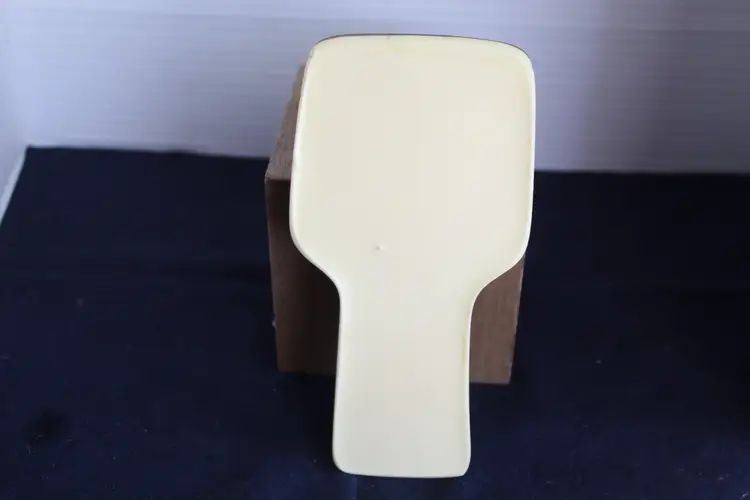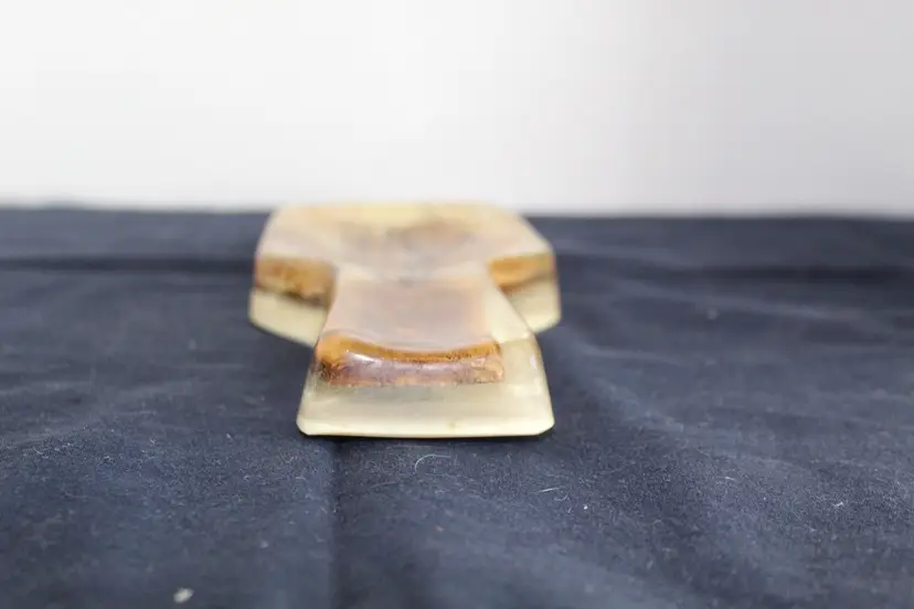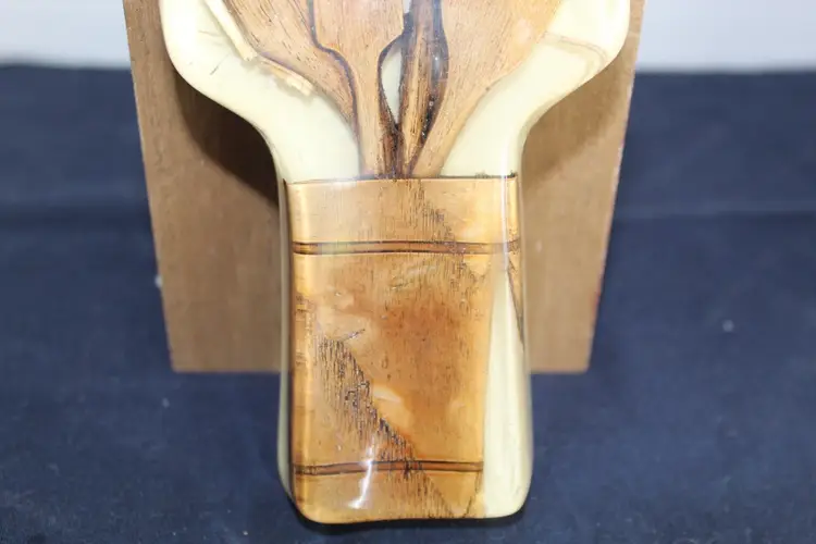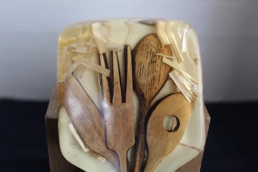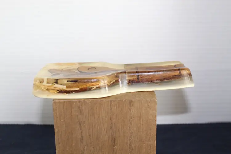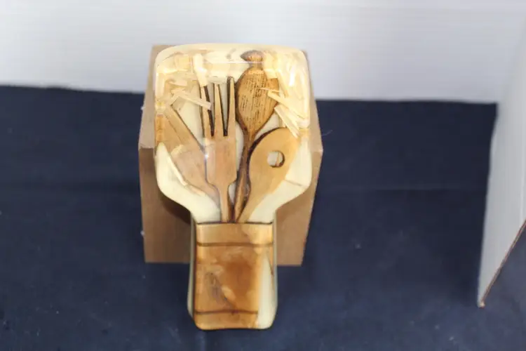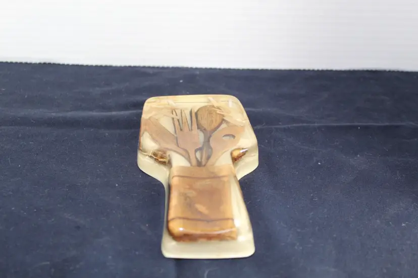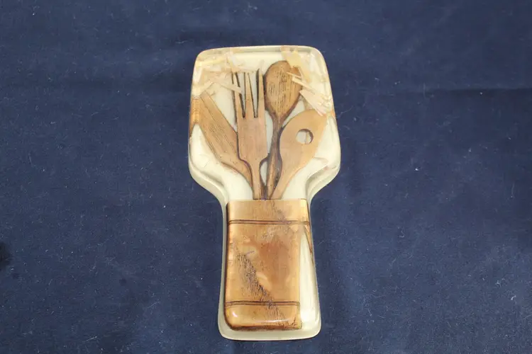 The Vintage Resin Spoon Rest Holder by Gamut Designs is a 6" acrylic piece in a medium brown wood tone, perfect for adding a touch of mid-century modernism to your kitchen. Handmade in the United States in the 1970s, this unique spoon rest features a boho cottage core style, making it a charming addition to any kitchen space. With a capacity for one spoon, this vintage spoon rest is not only functional but also a delightful collectible item for fans of retro kitchen decor.