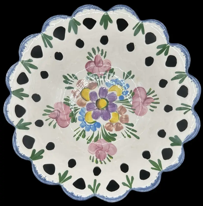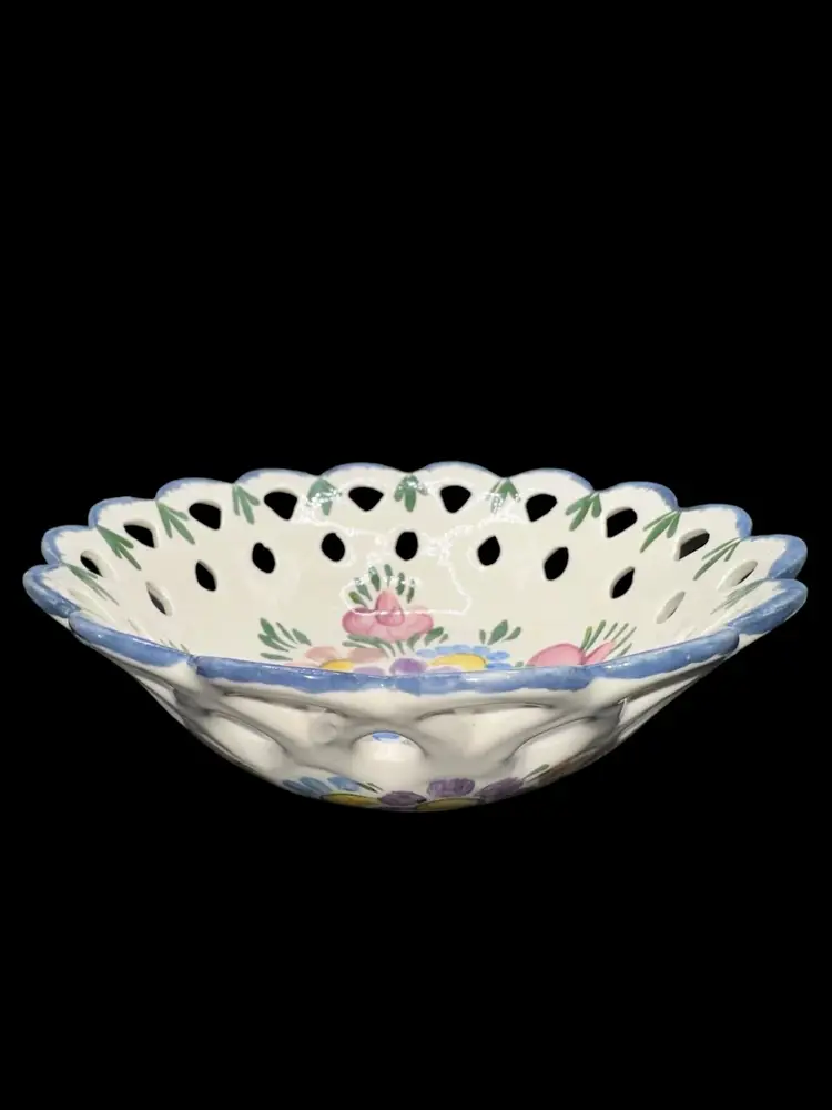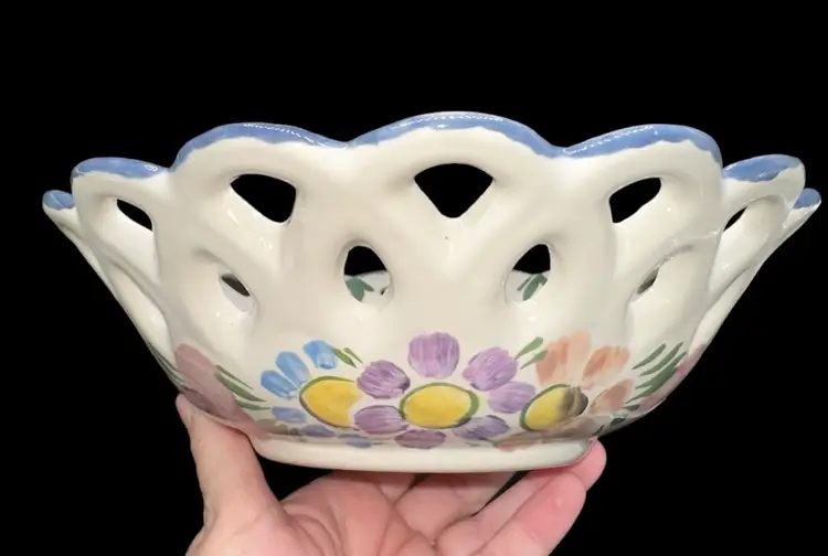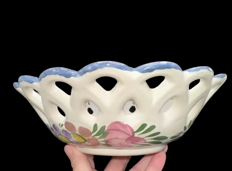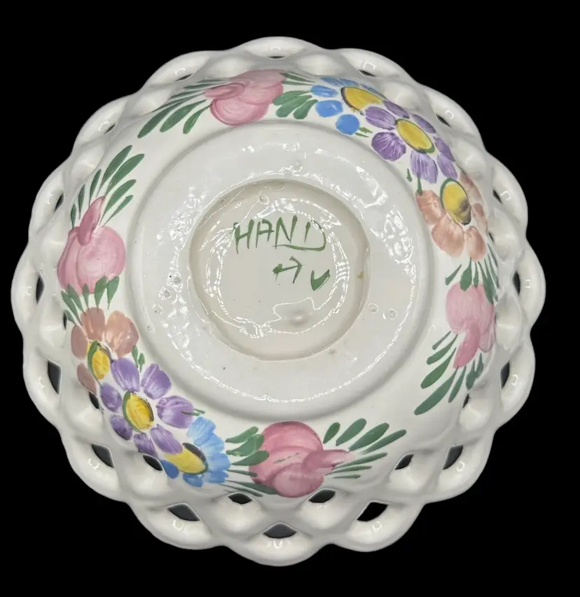 Beautiful floral bowl, with no chips, cracks, or repairs. Measures 8.5” across and 2.75” tall. The bottom and sides are just as pretty as the top!
