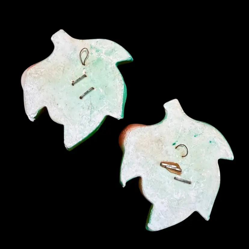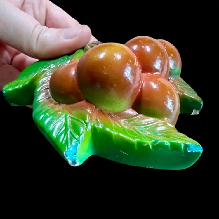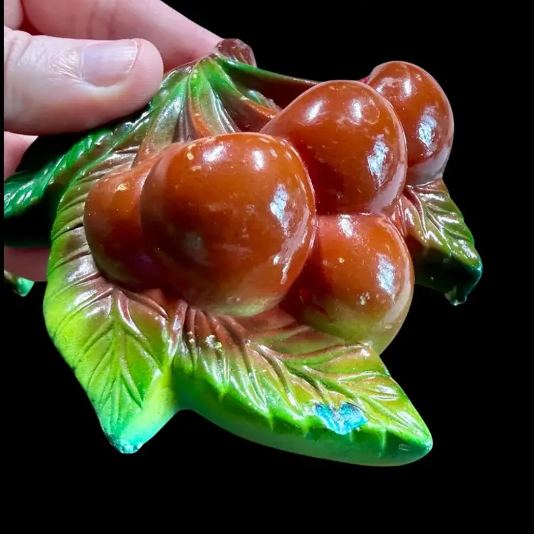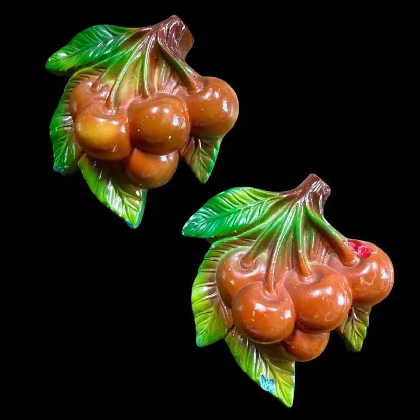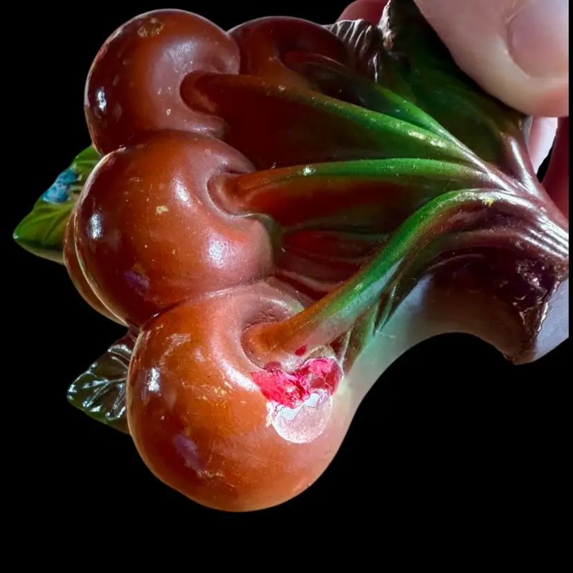 3.5”x4”. A pair of Chalkware cherries to add vintage charm to your wall. Have some chips wear from age, typical of Chalkware - someone had tried to paint some chips with something, maybe nail polish, that doesn’t quite match. Has staples on back for hanging, although I don’t know how trustworthy that is! No makers mark.