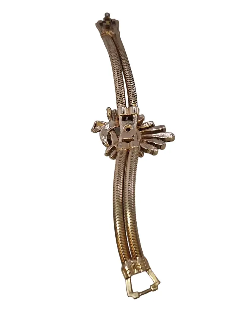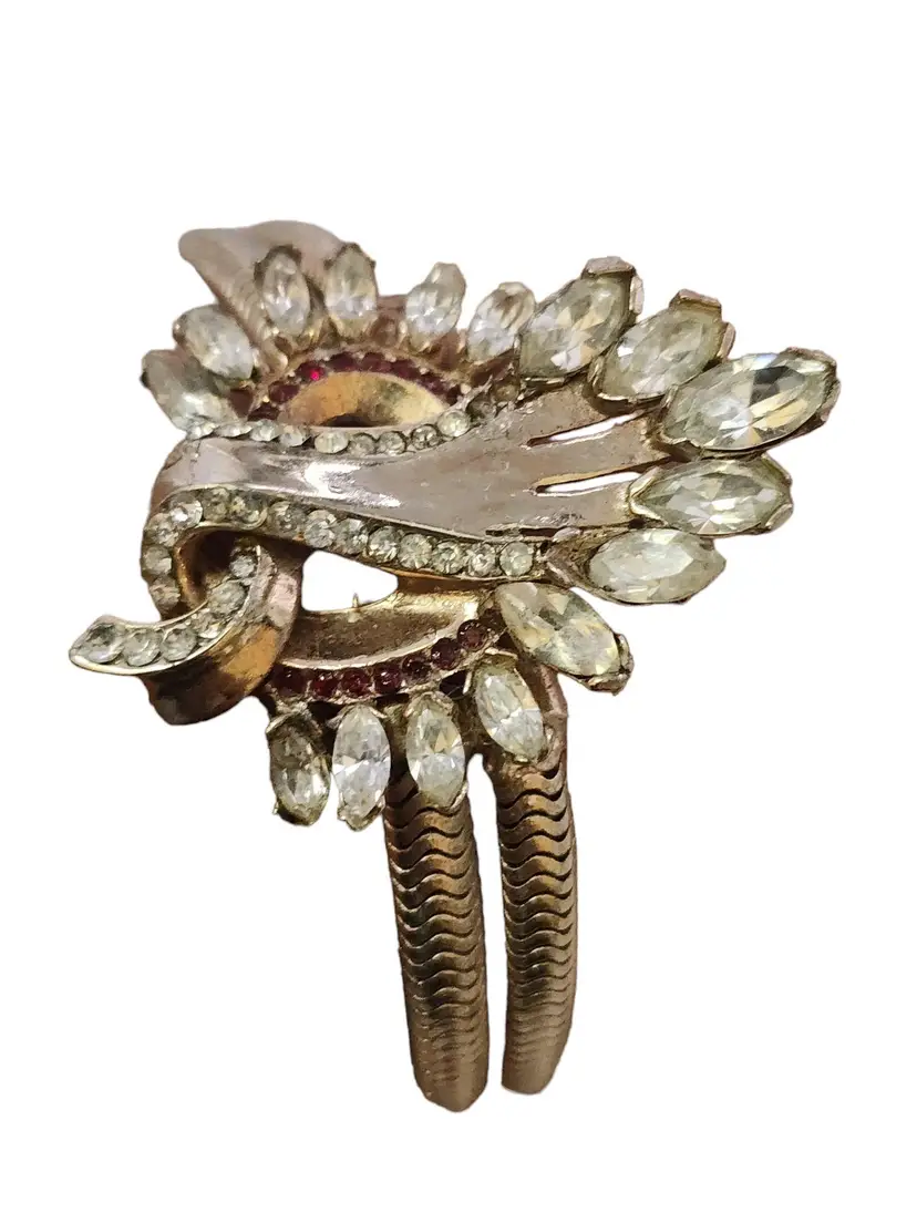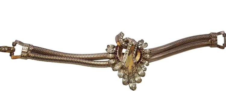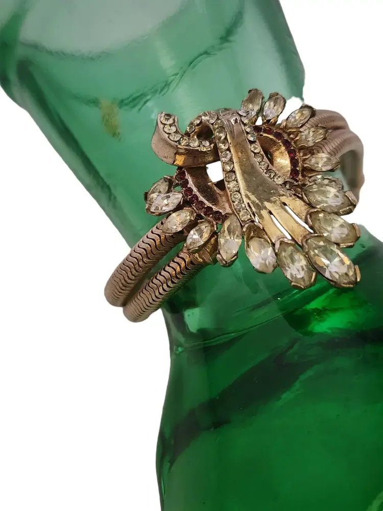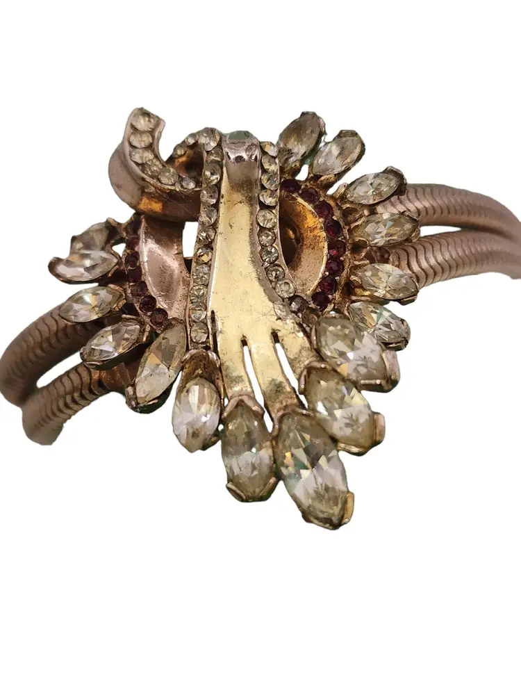 Size: 7.25" Color: Gold, Clear Condition: Good vintage; some slightly dark stones Signed: None Details: Well made, riveted.